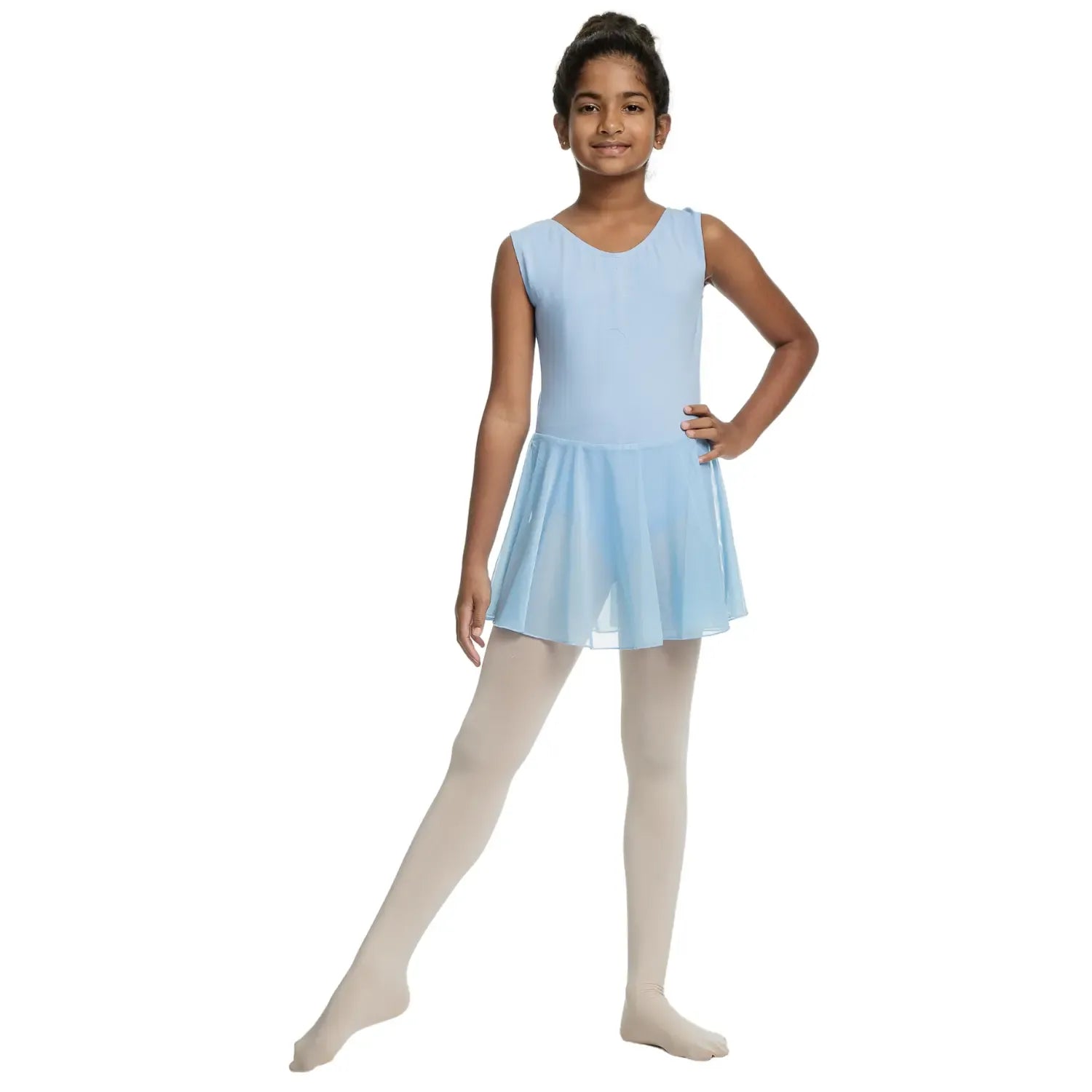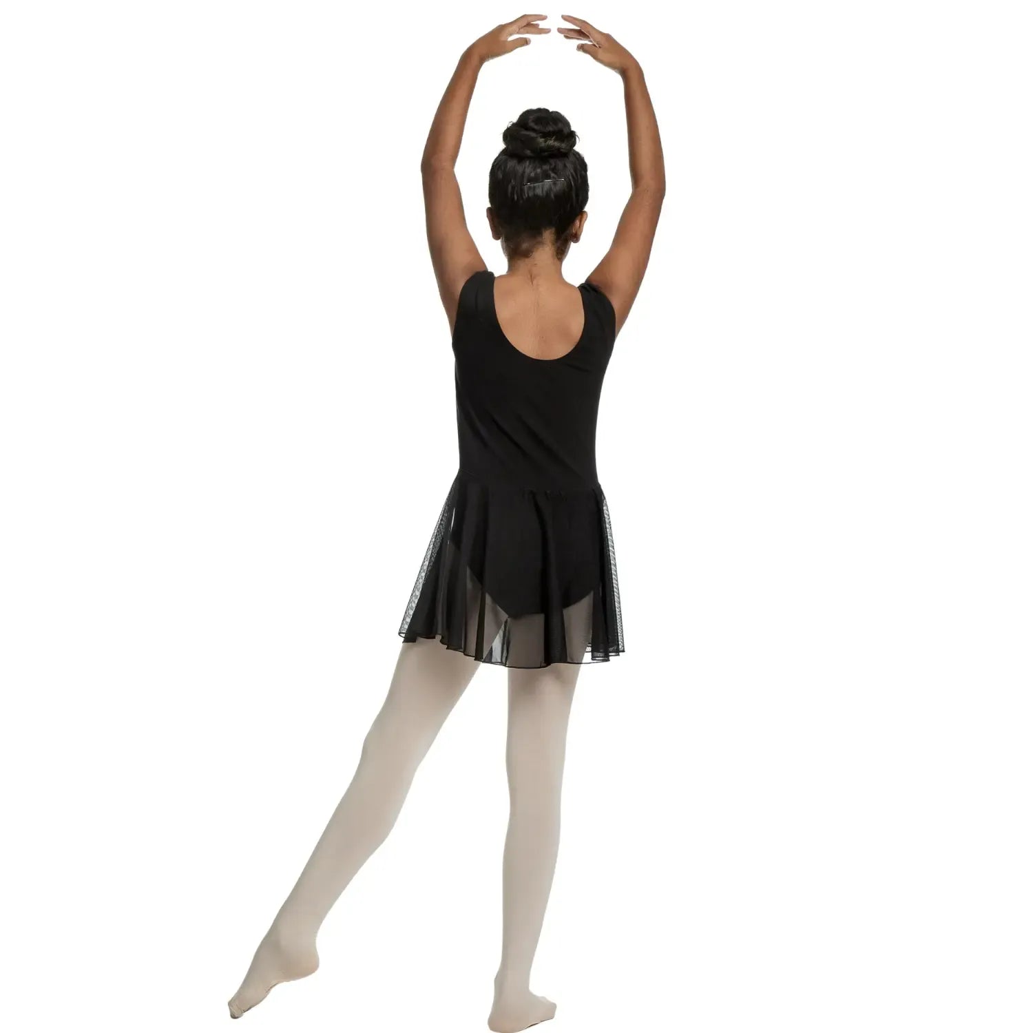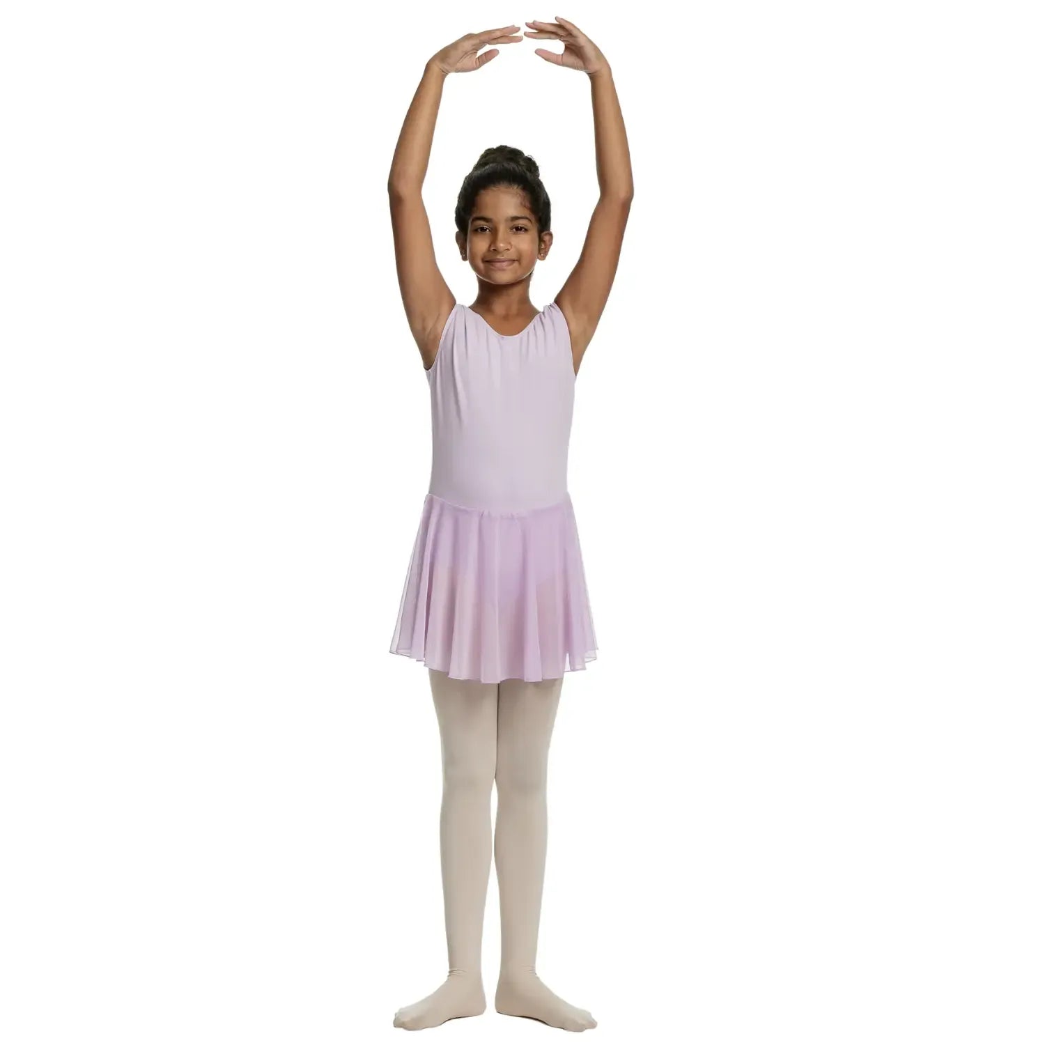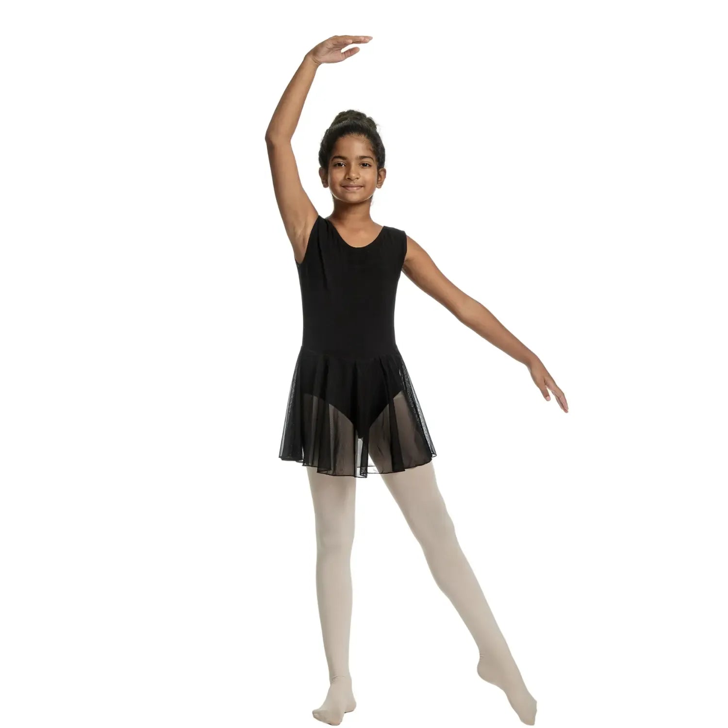 A nylon-spandex dress with ballet leg cut, mesh bodice, and flowy skirt, designed for fluid, graceful performance at parties, prom, and dance routines.