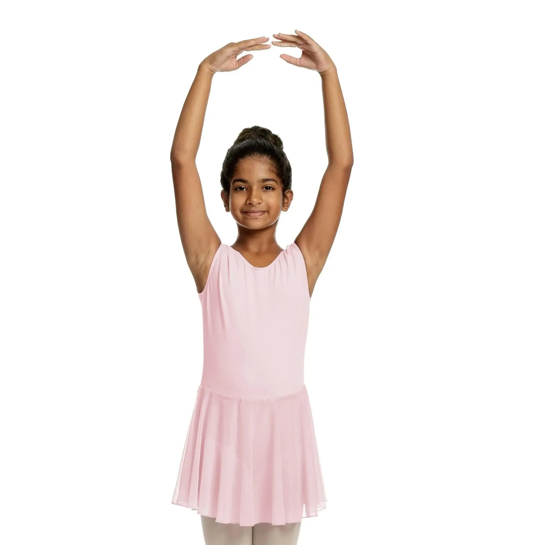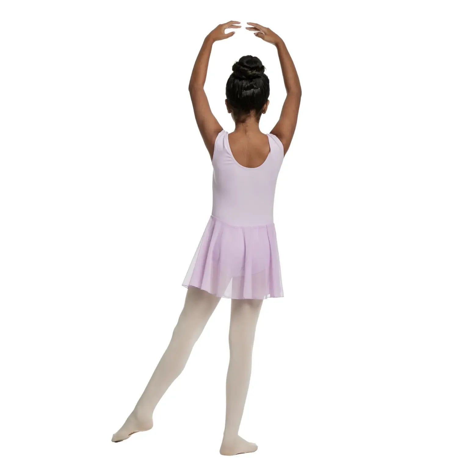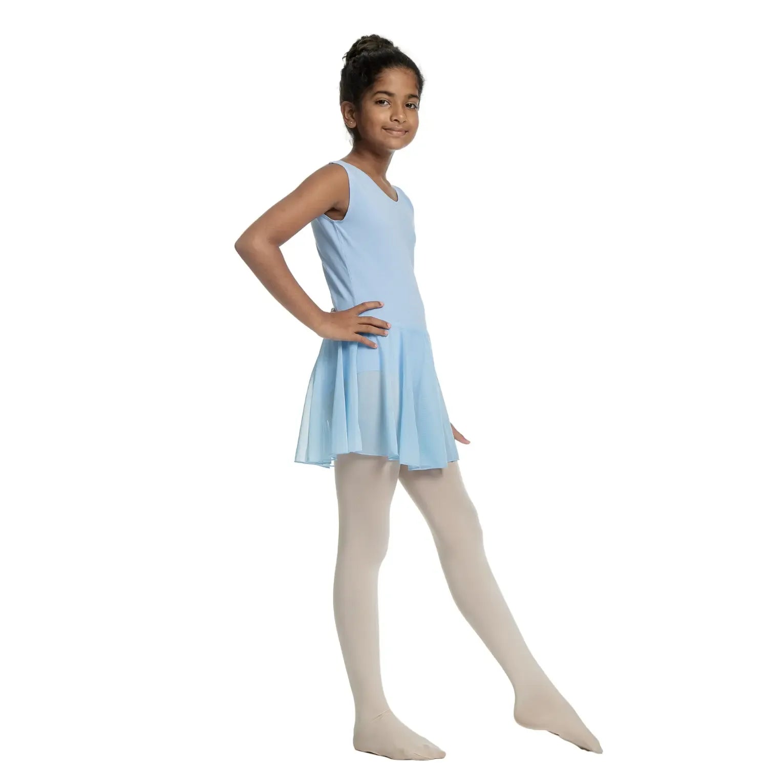 A nylon-spandex dress with ballet leg cut, mesh bodice, and flowy skirt, designed for fluid, graceful performance at parties, prom, and dance routines.