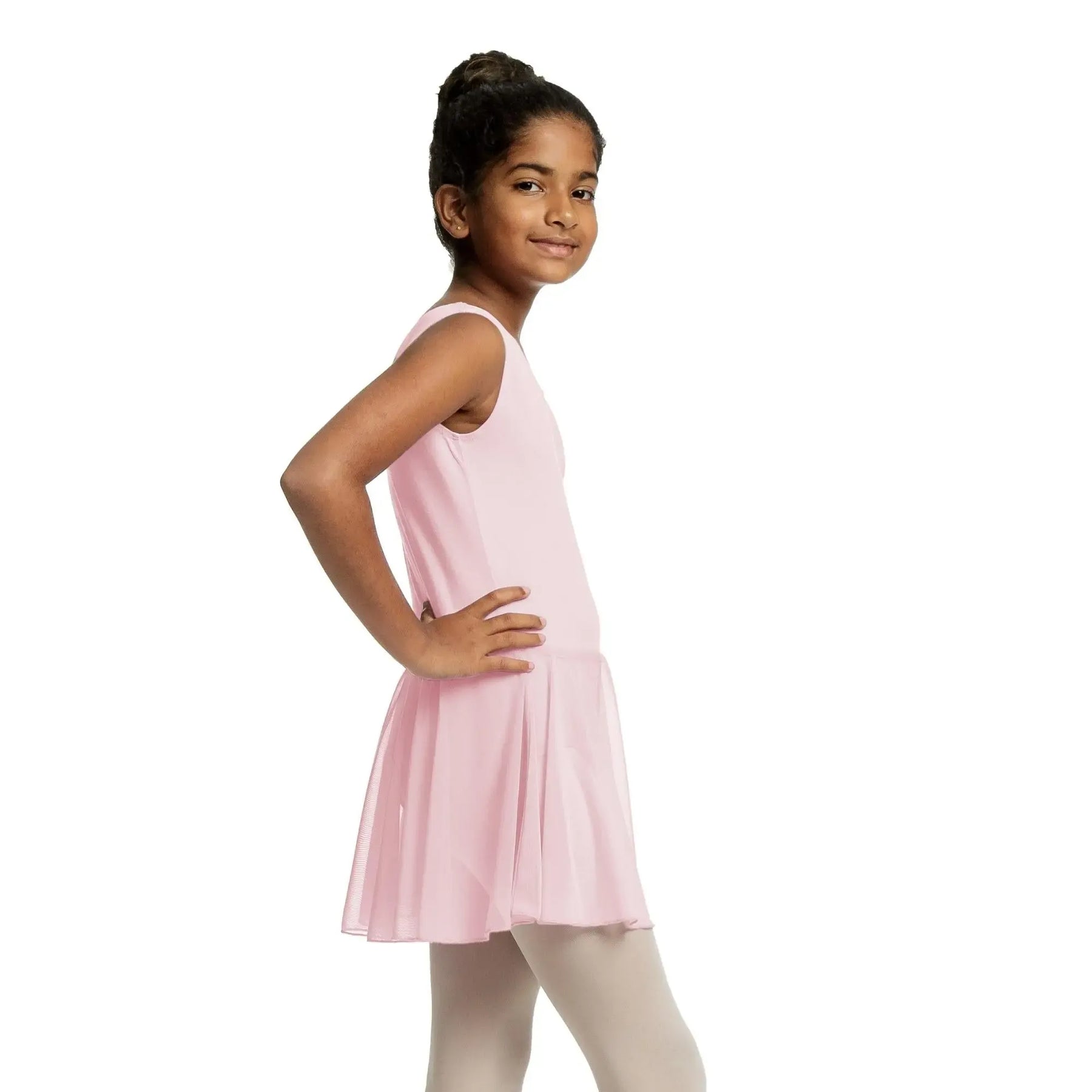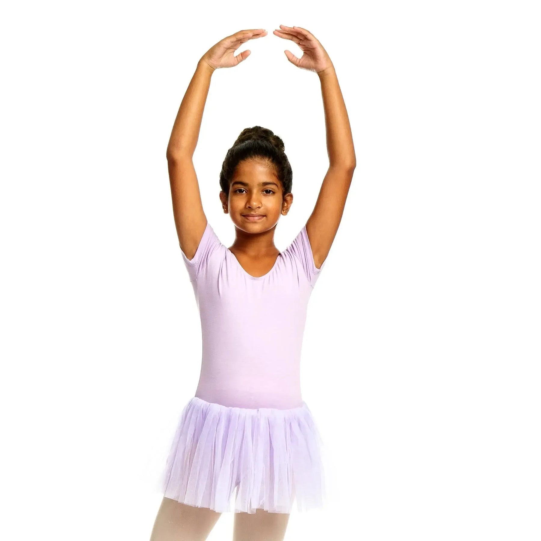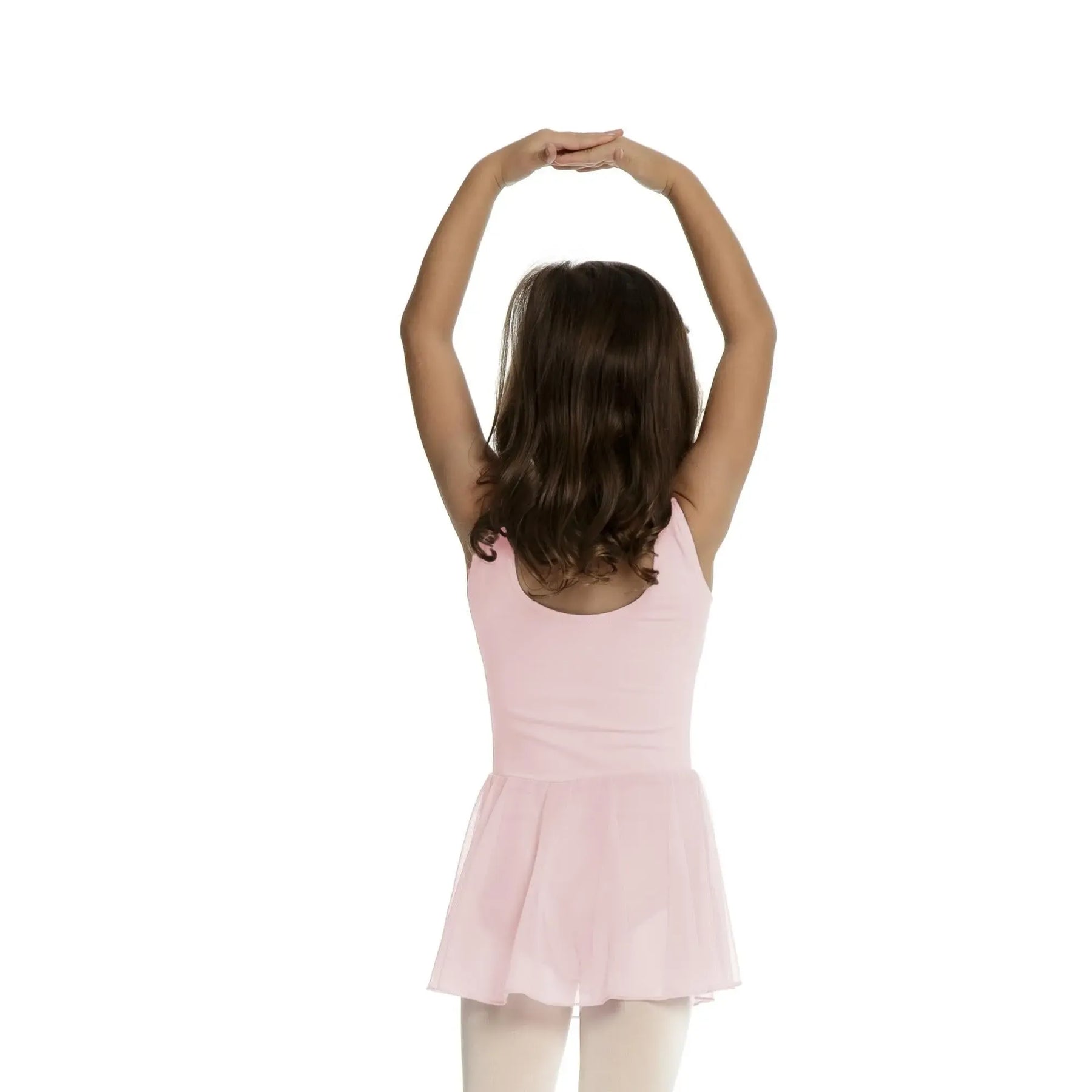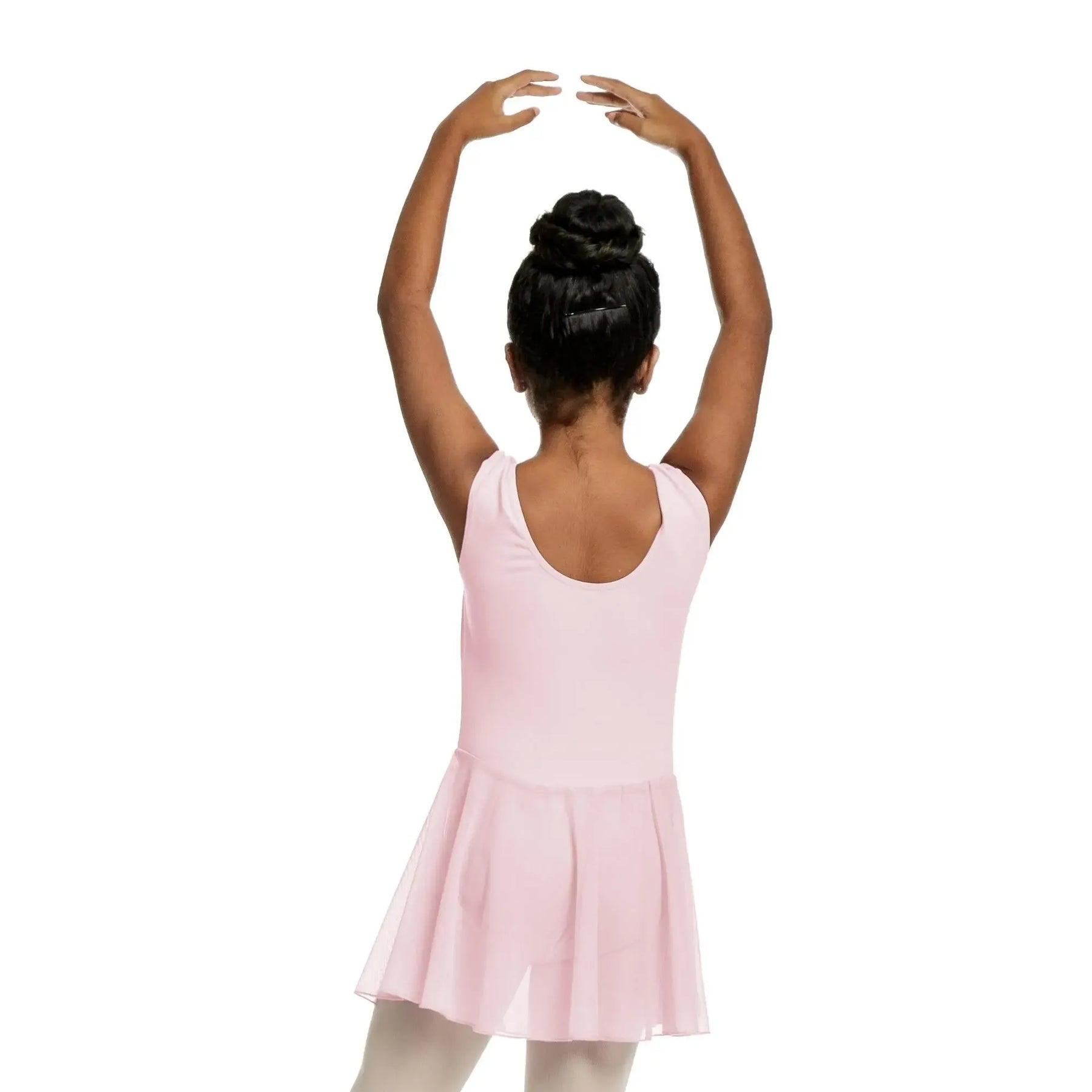 A nylon-spandex dress with ballet leg cut, mesh bodice, and flowy skirt, designed for fluid, graceful performance at parties, prom, and dance routines.