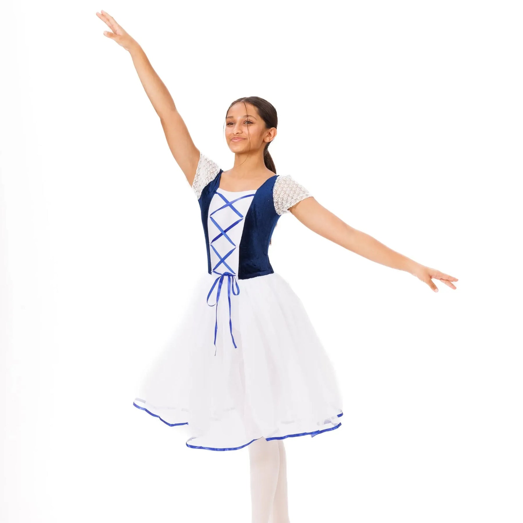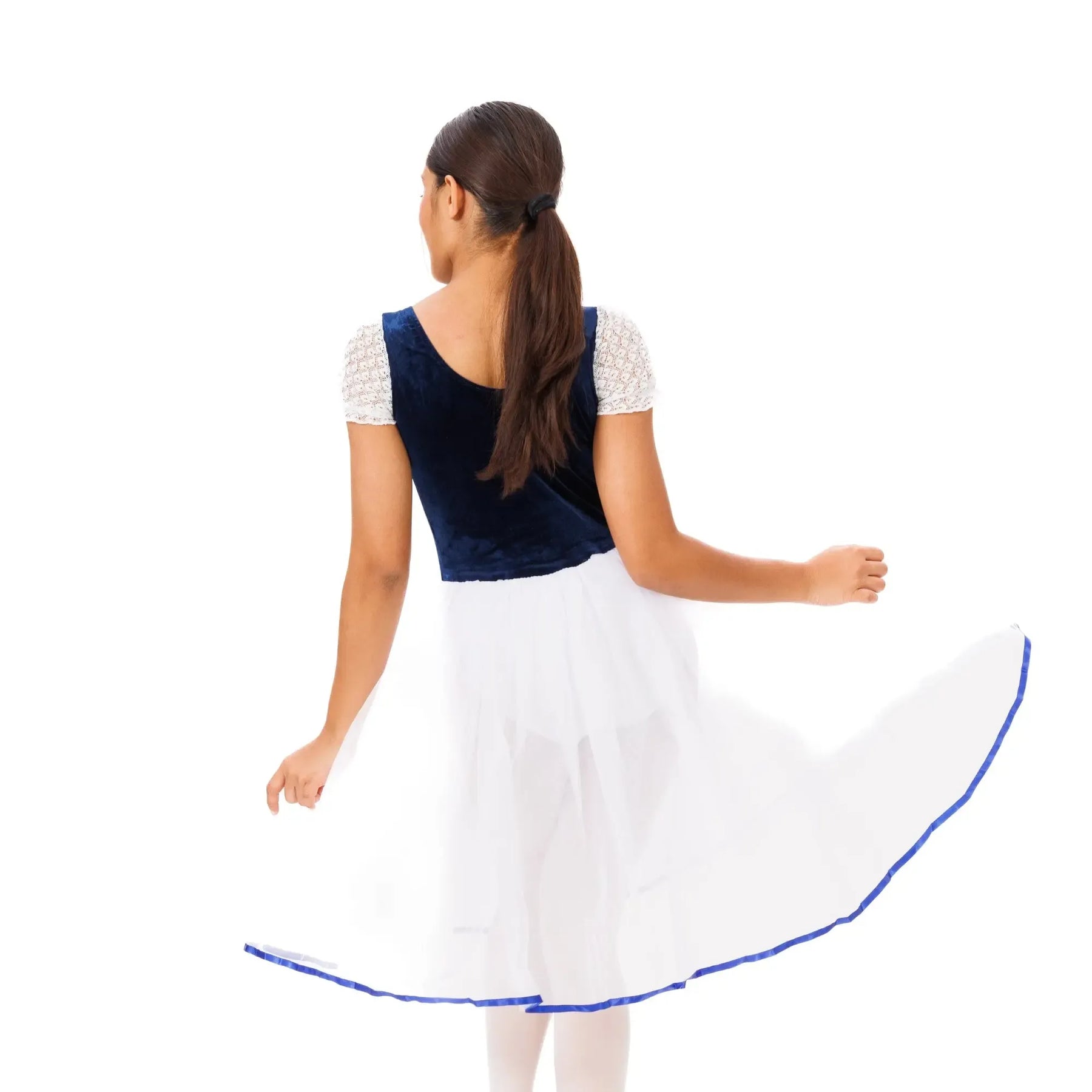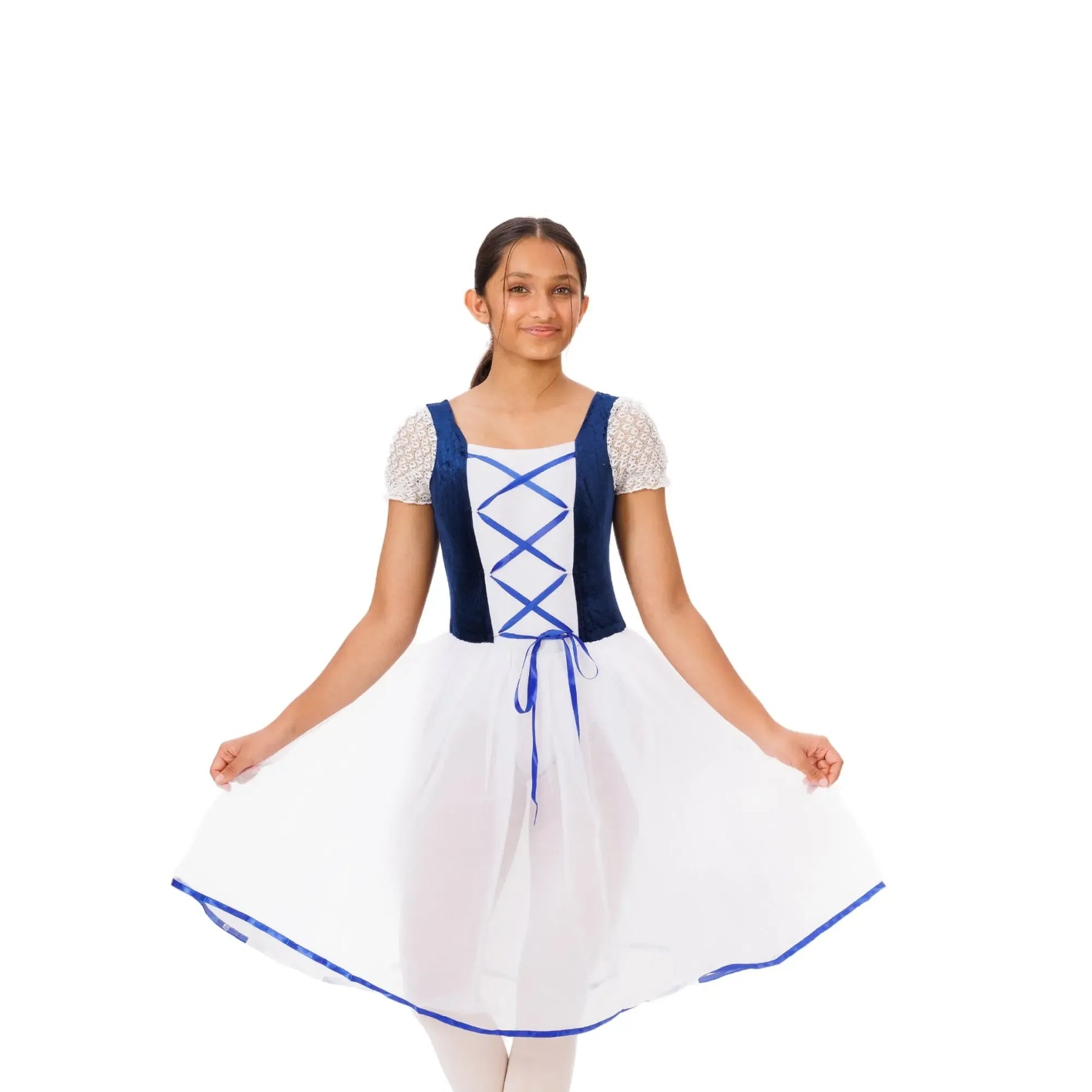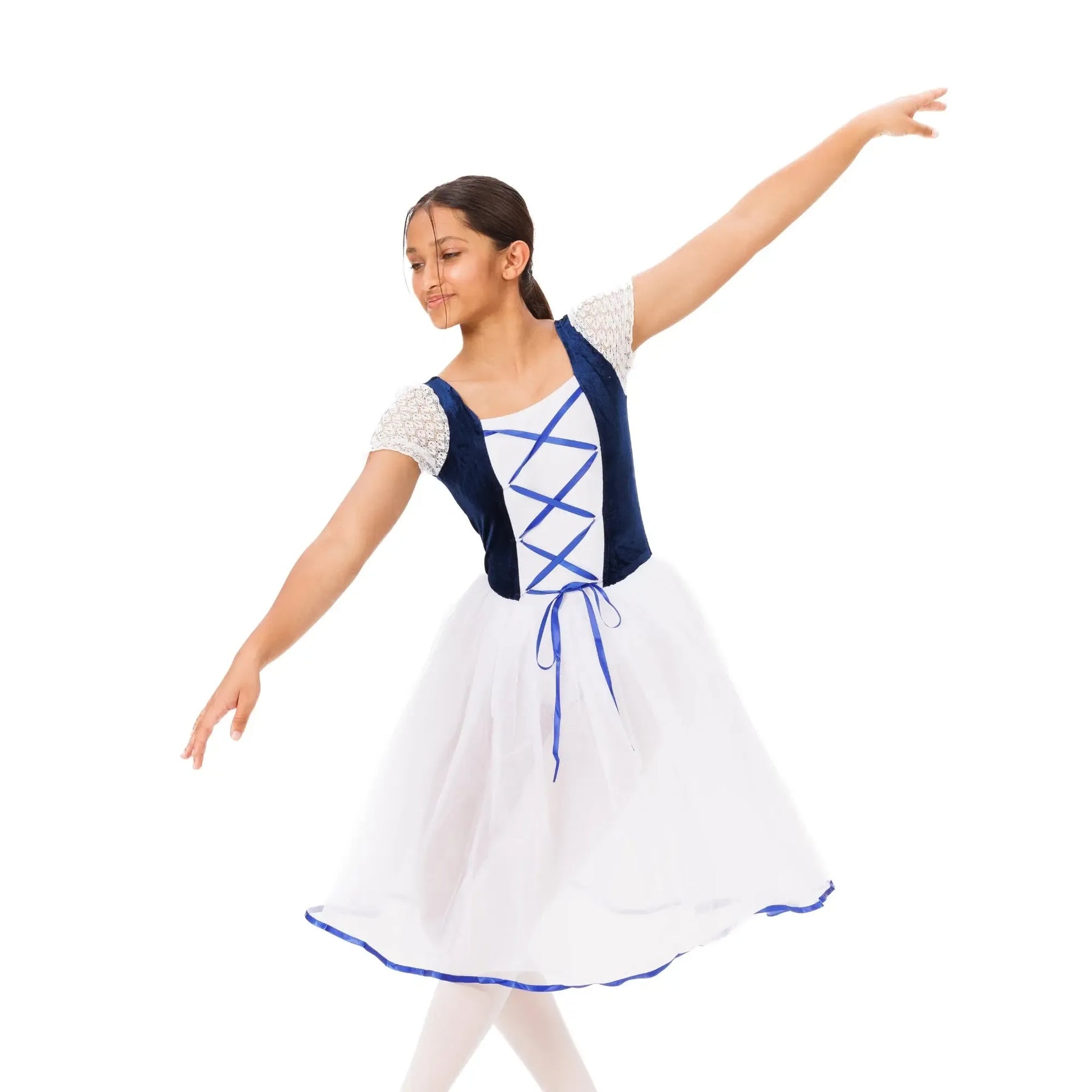 An elegant ballet tutu with layered tulle, velvet waistband, and lace detailing for lightweight, fluid classical performance.