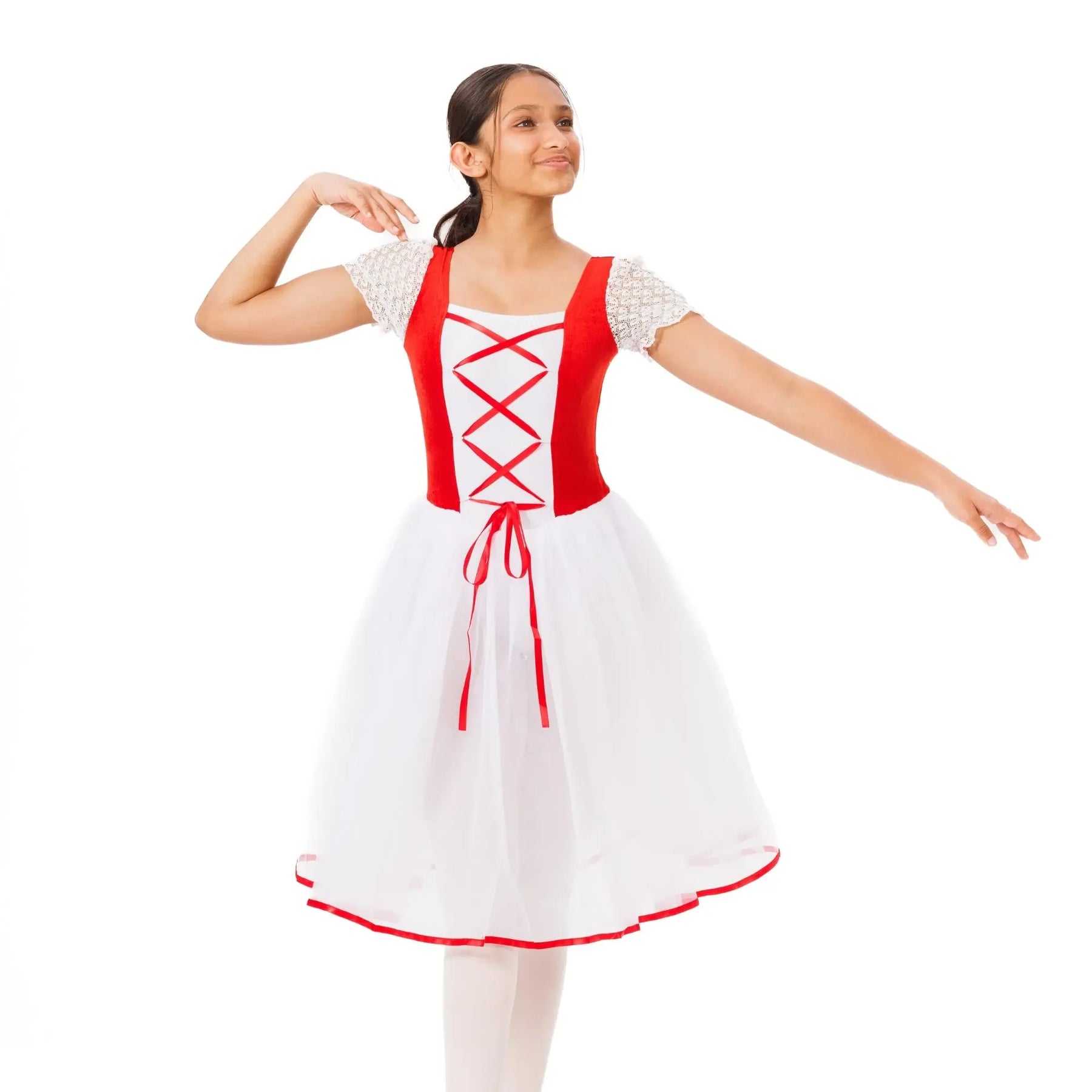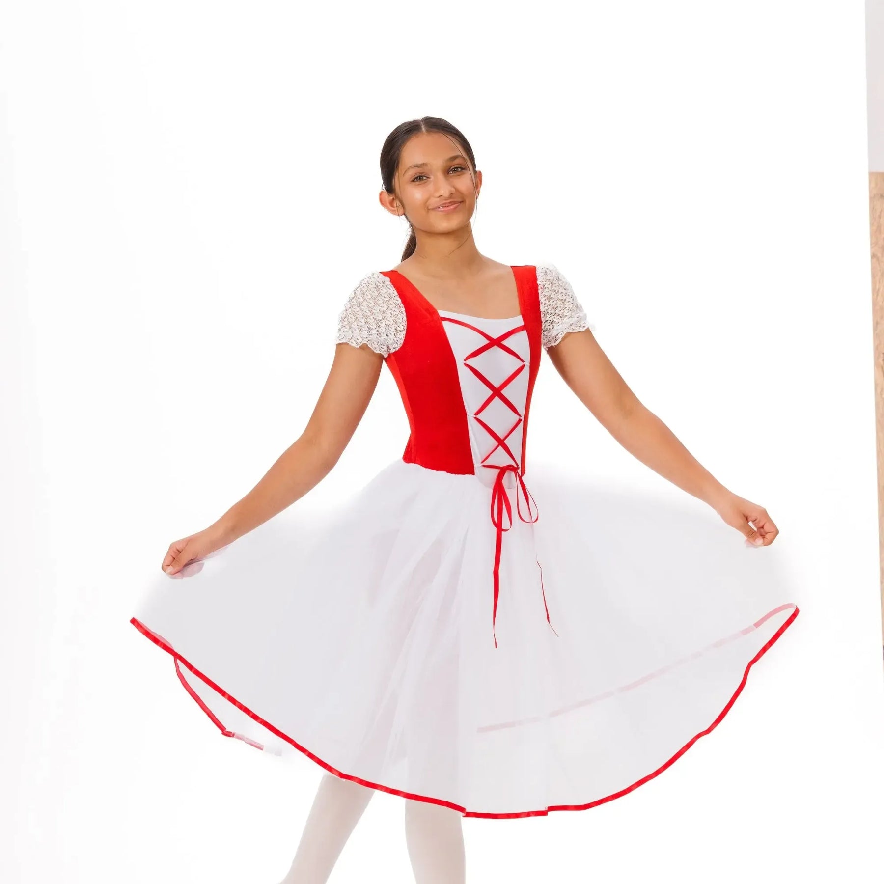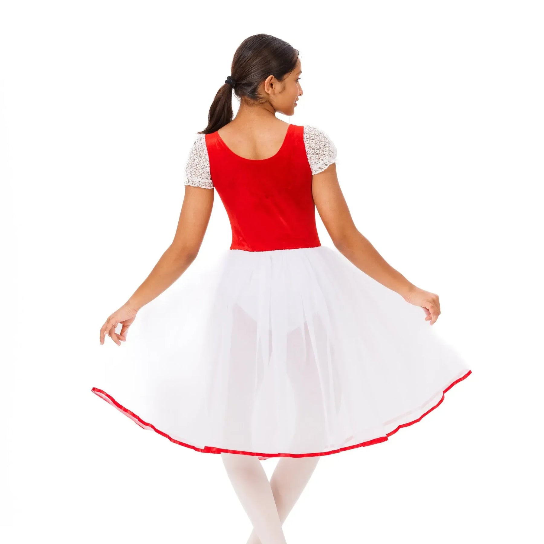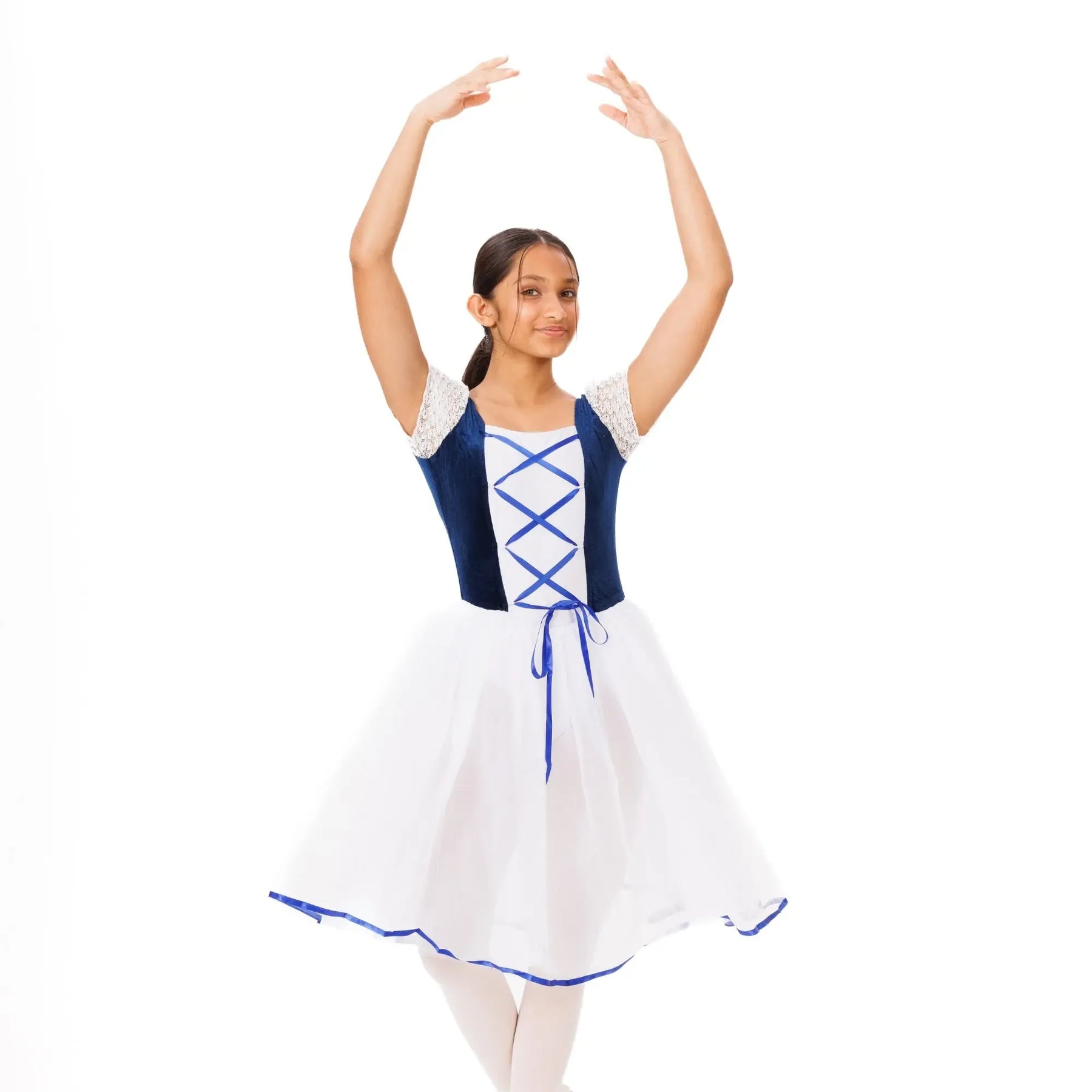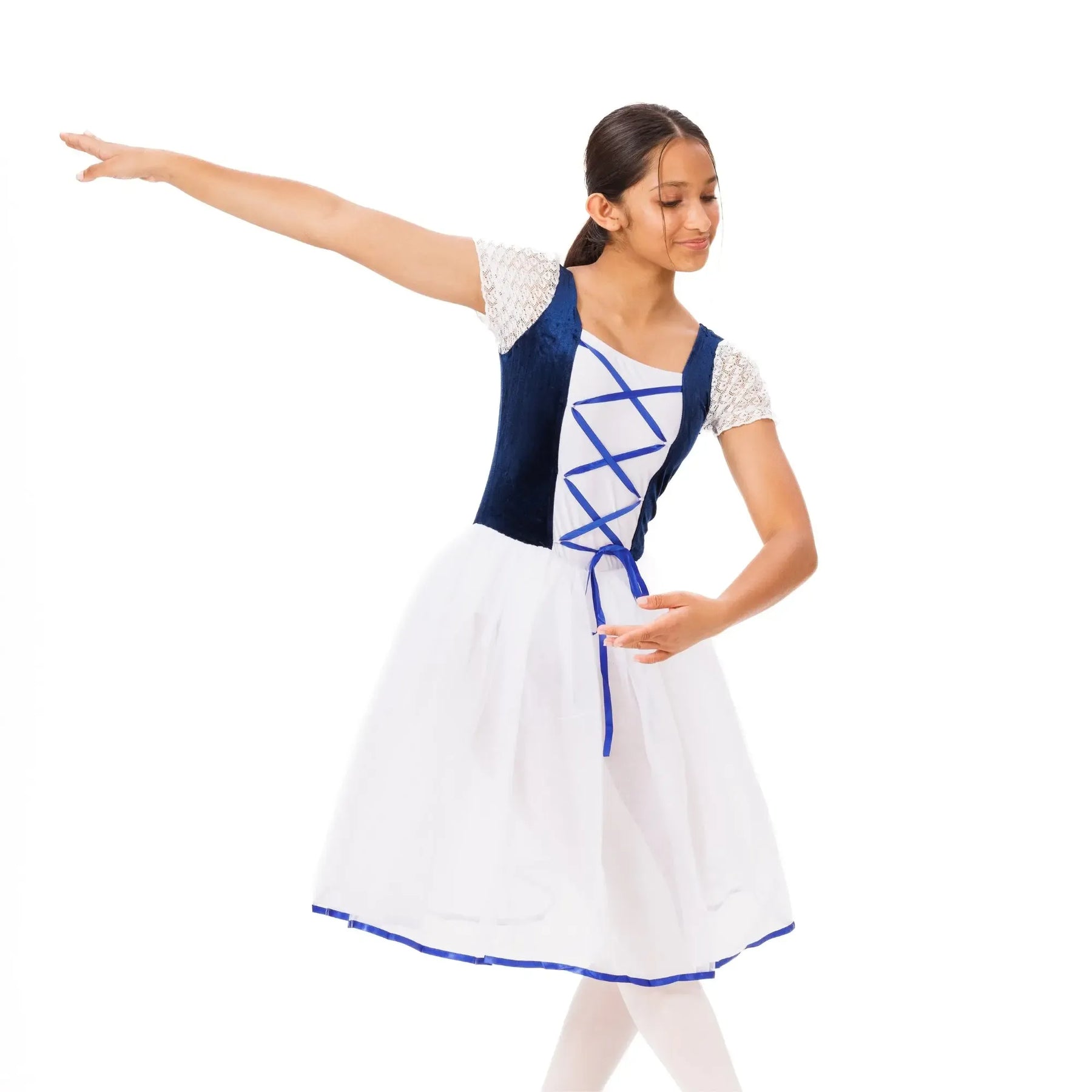 An elegant ballet tutu with layered tulle, velvet waistband, and lace detailing for lightweight, fluid classical performance.
