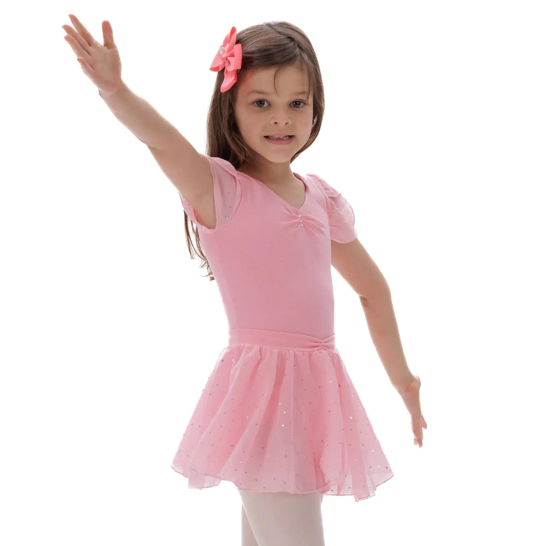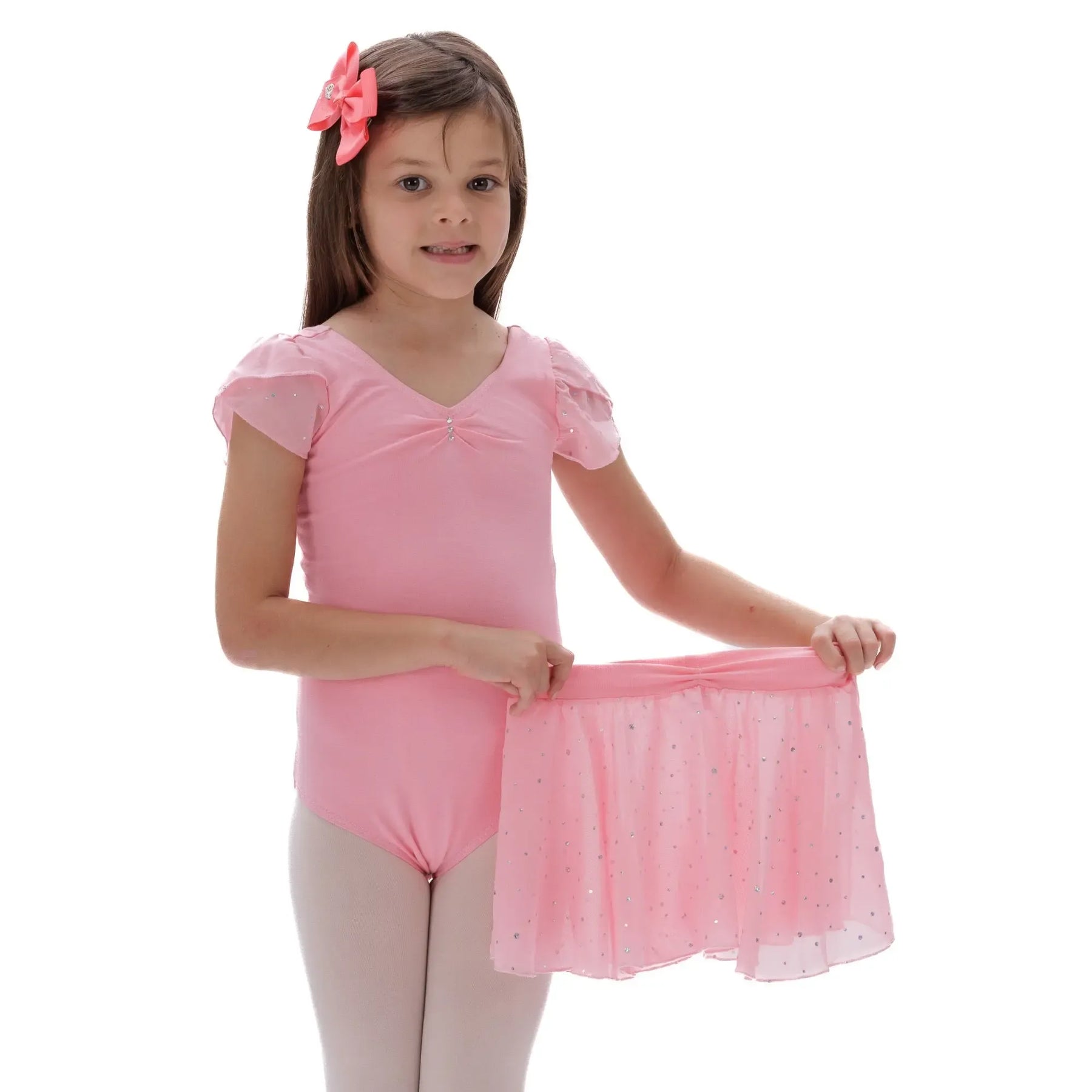 A cotton-spandex leotard with inner lining and sheer polyester skirt, accented with rhinestones for sparkle and designed for graceful, unrestricted movement.