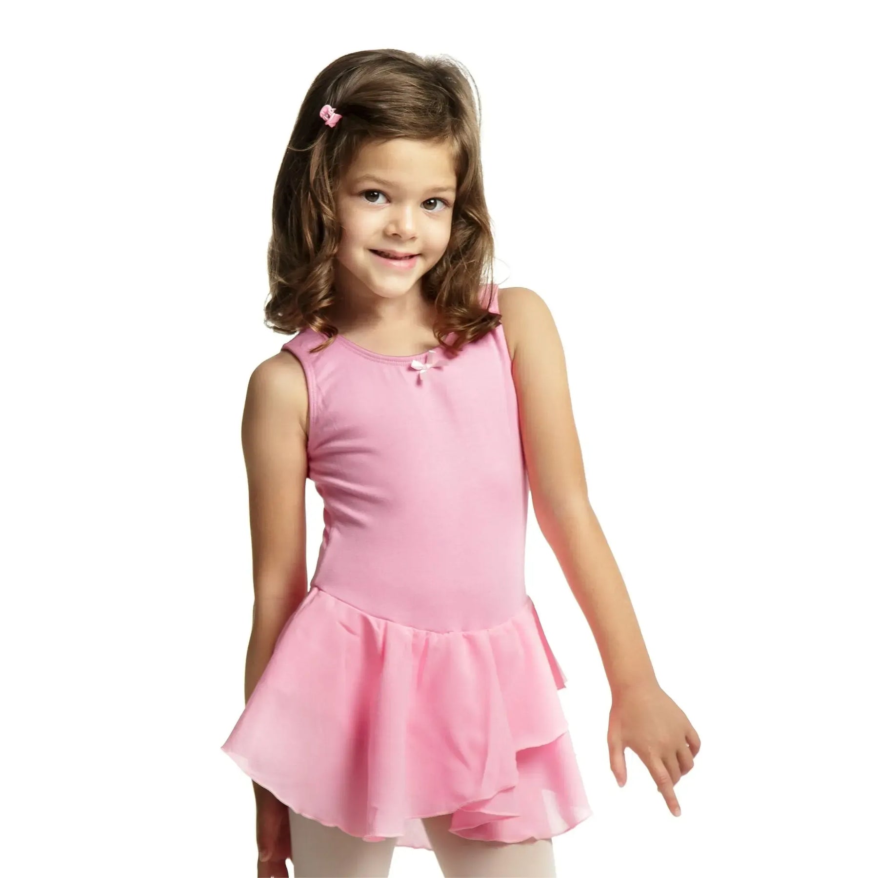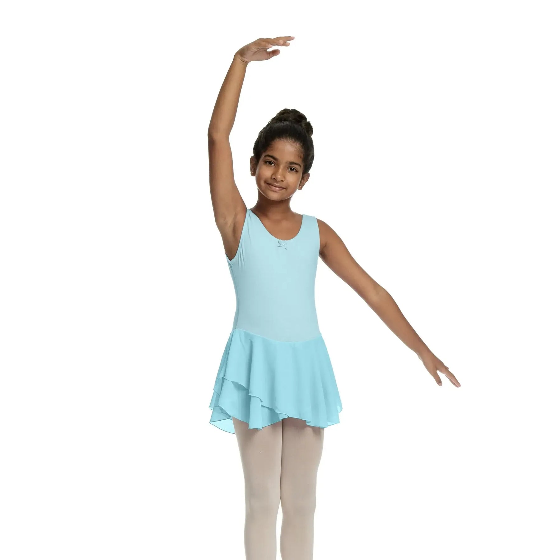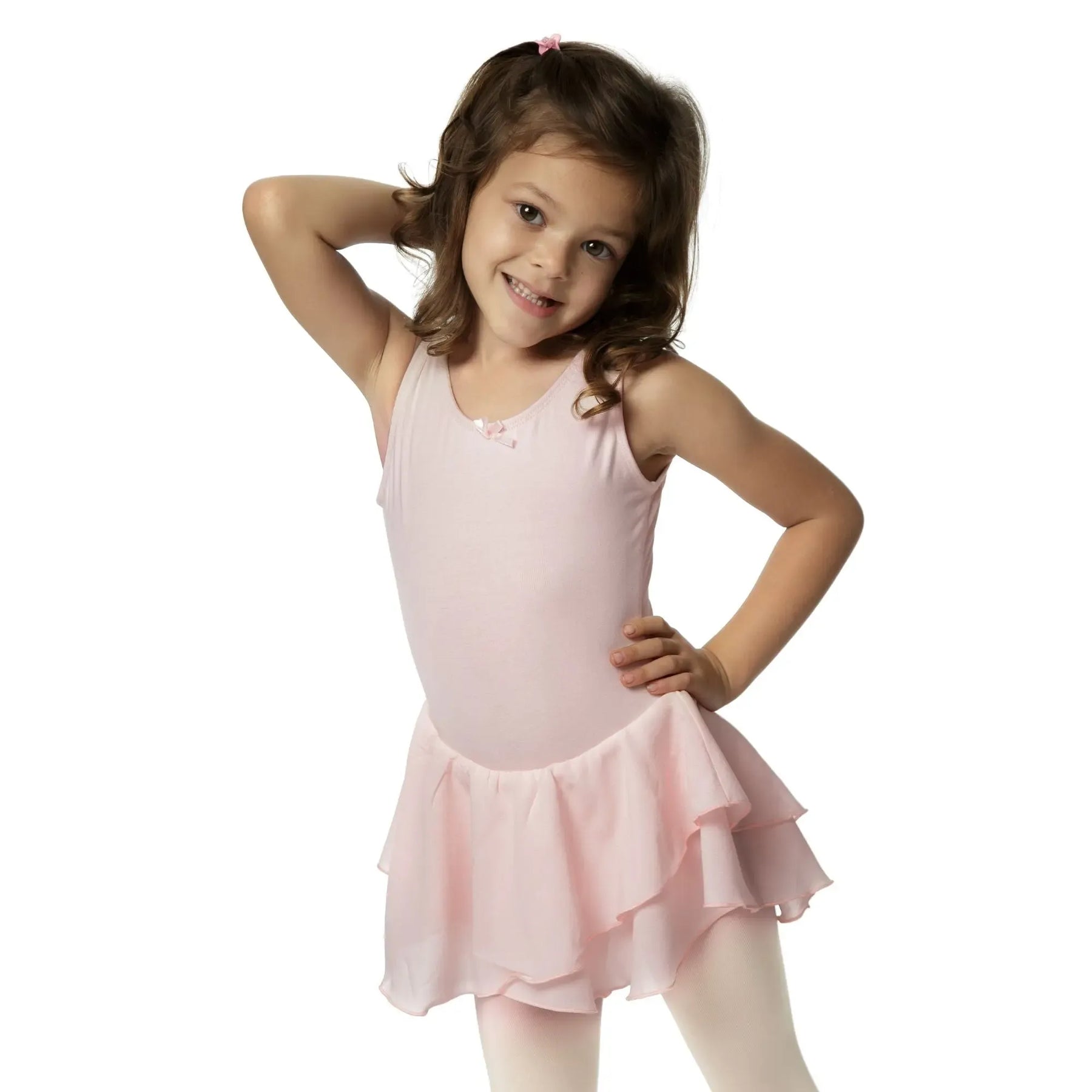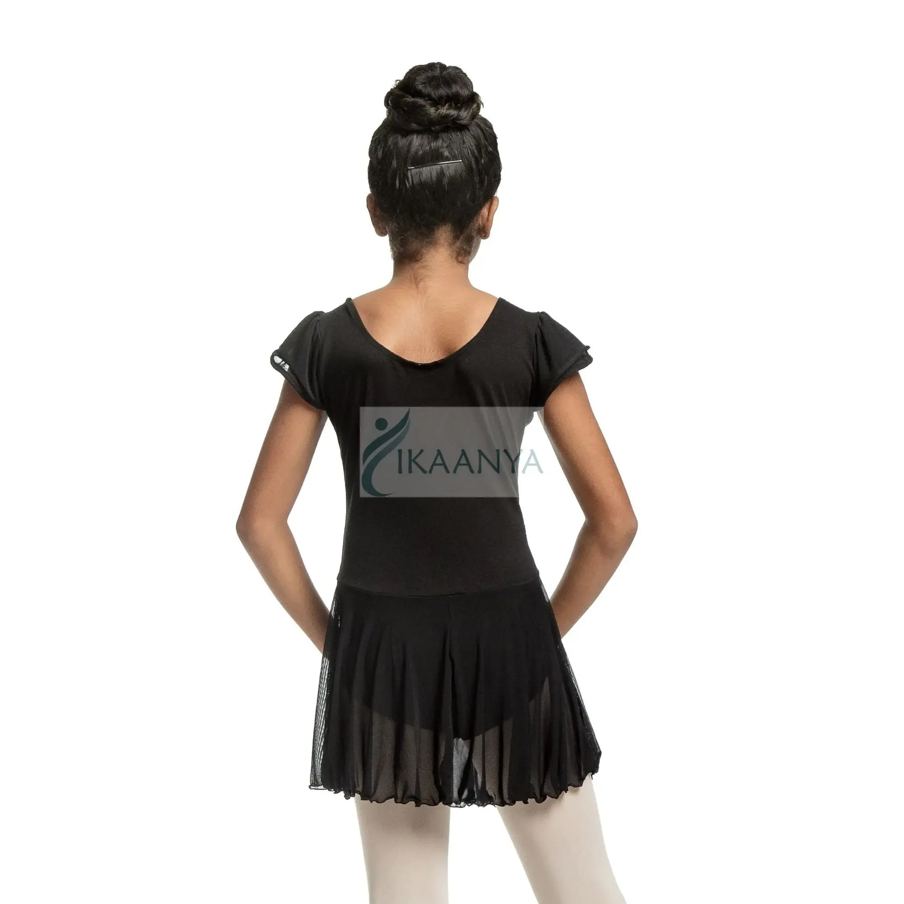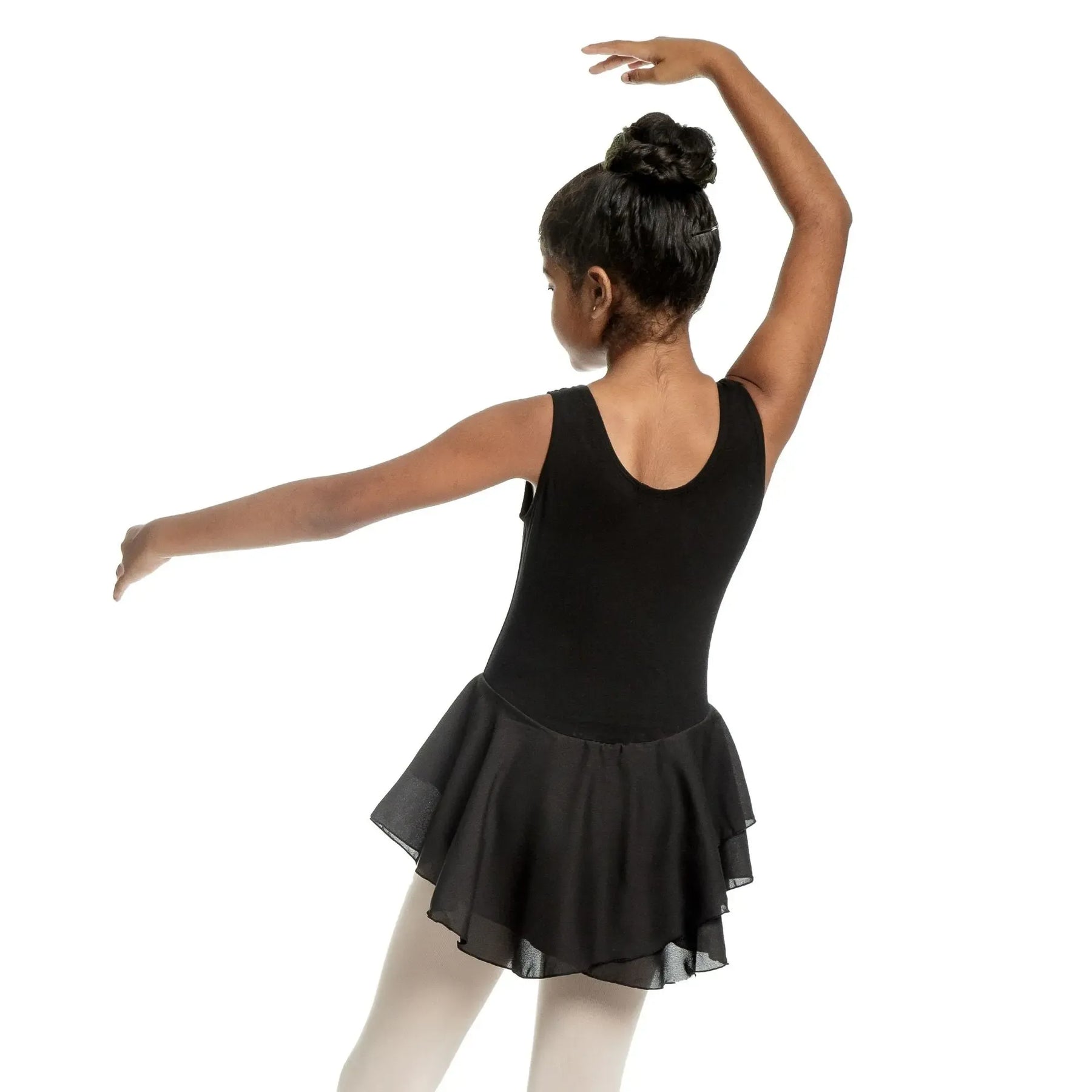 A cotton-spandex ballerina dress with a soft mesh chiffon skirt, designed for flexible, breathable, and elegant performance.
