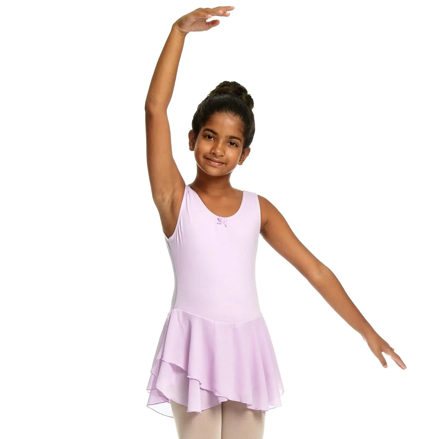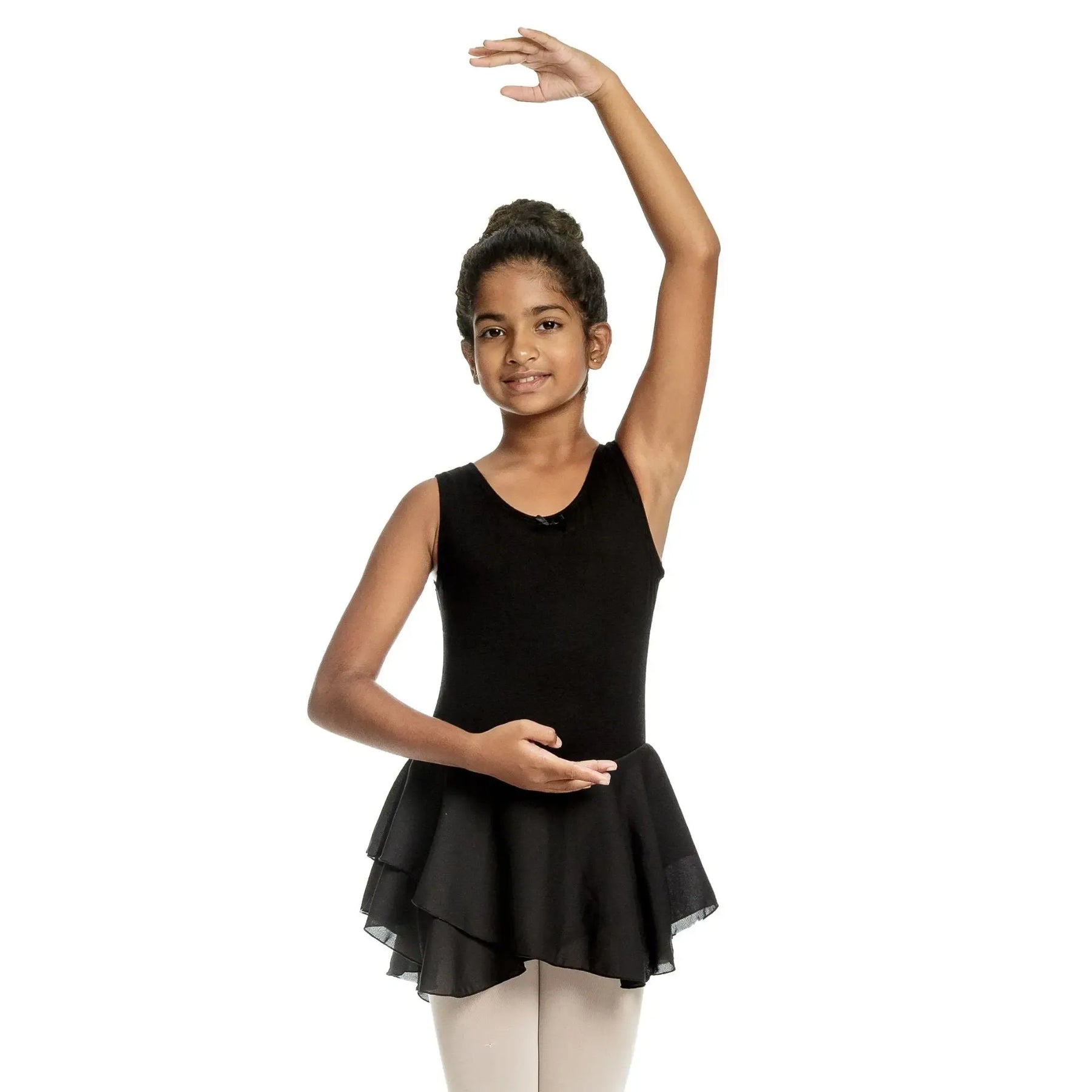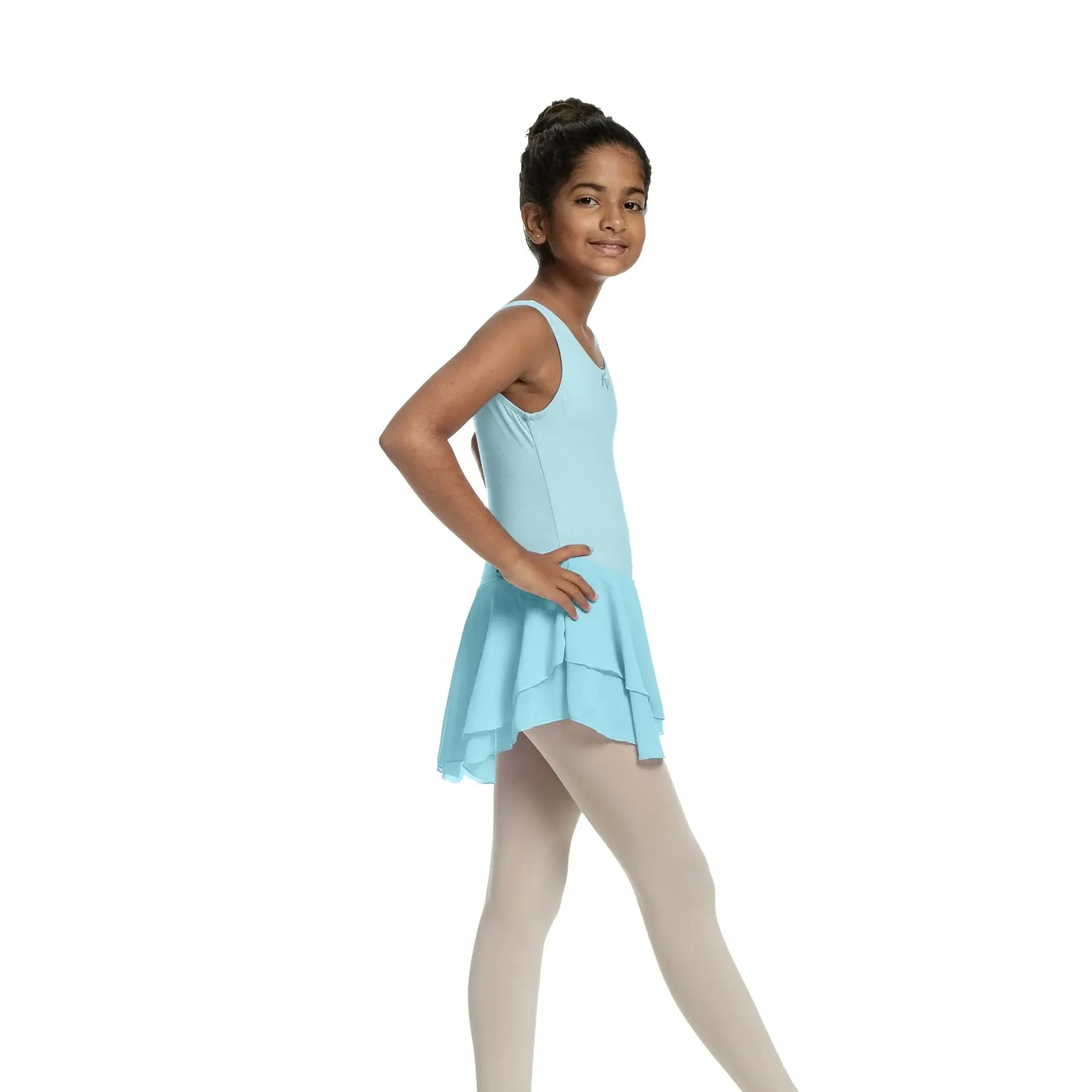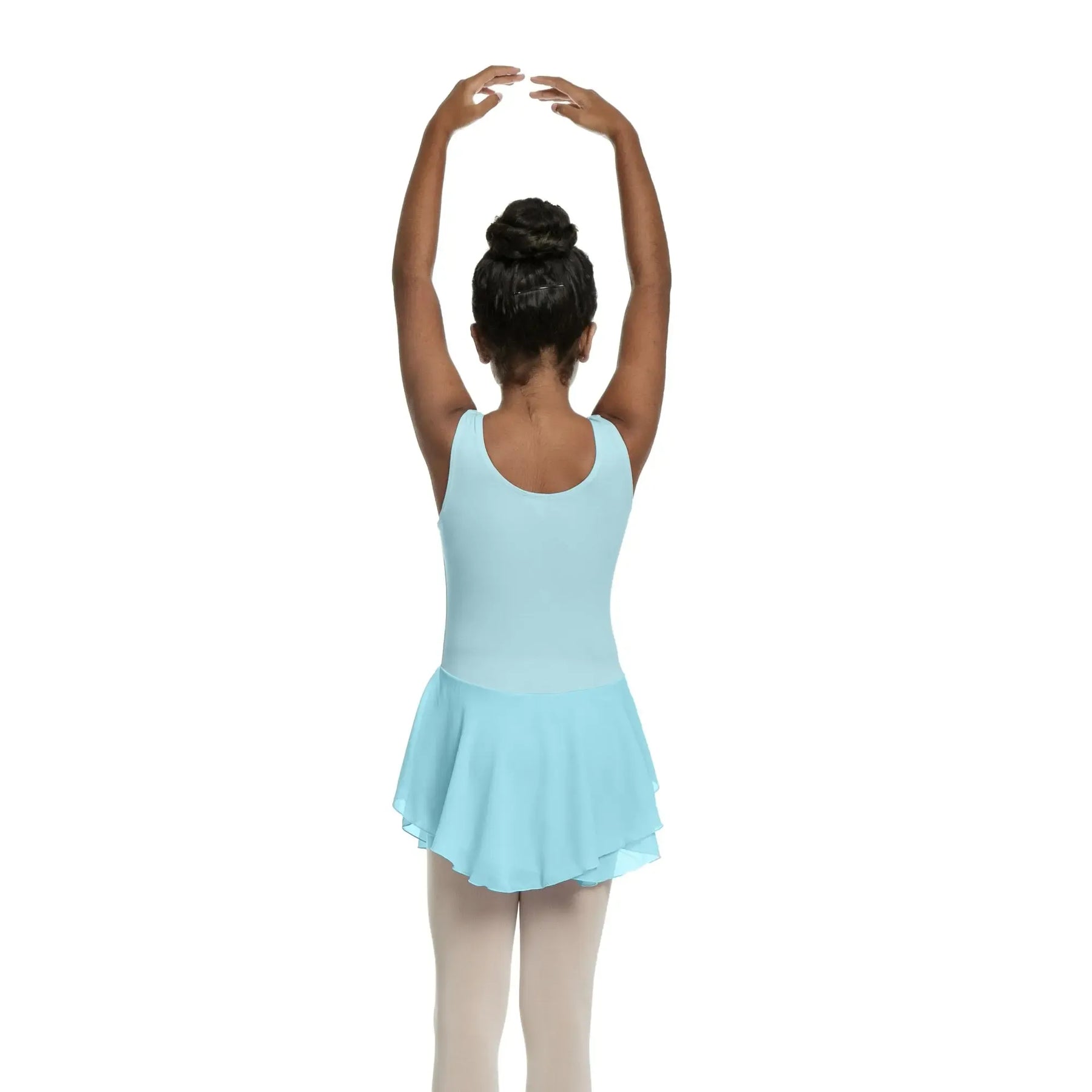 A cotton-spandex ballerina dress with a soft mesh chiffon skirt, designed for flexible, breathable, and elegant performance.