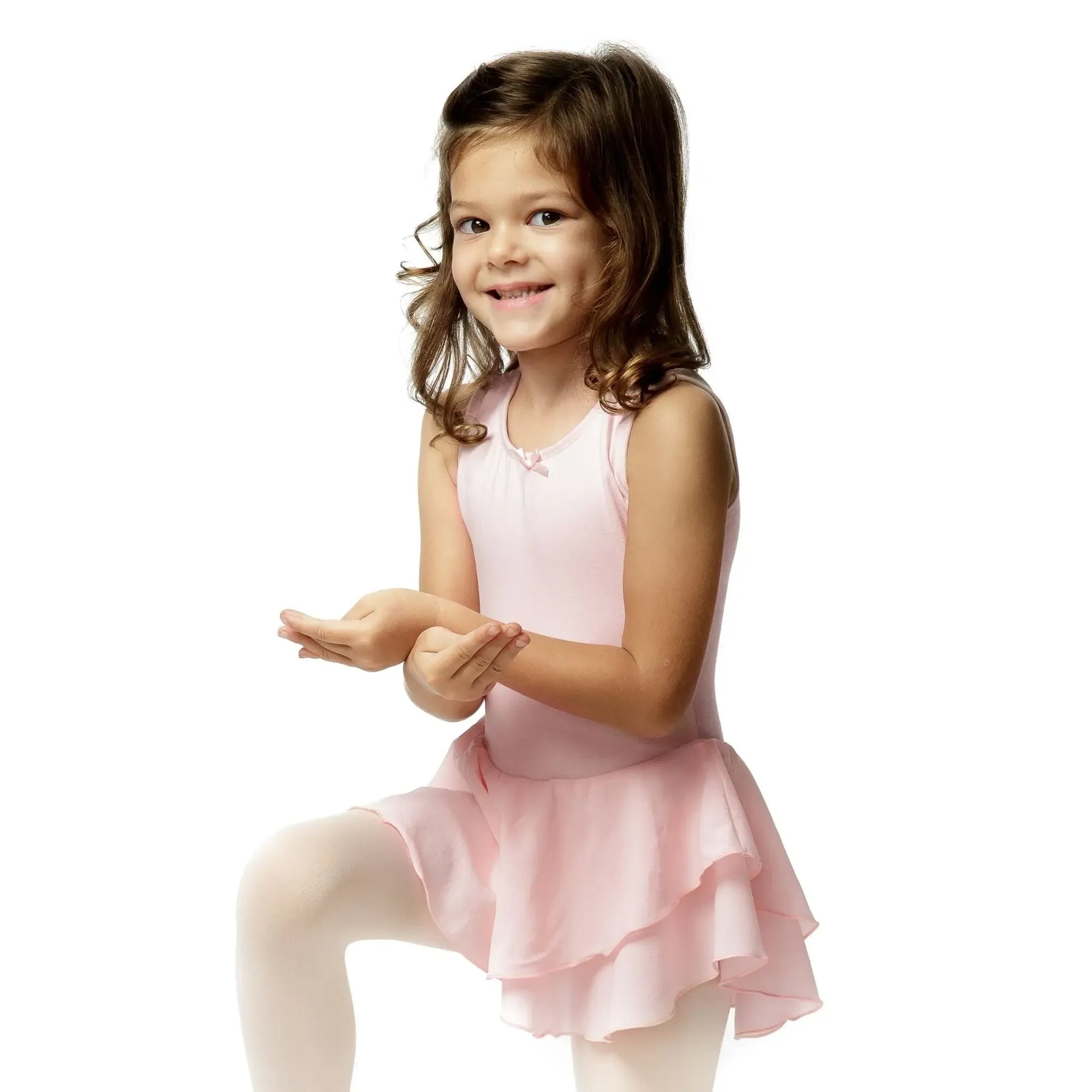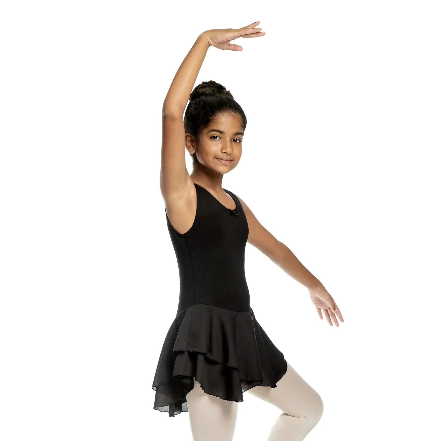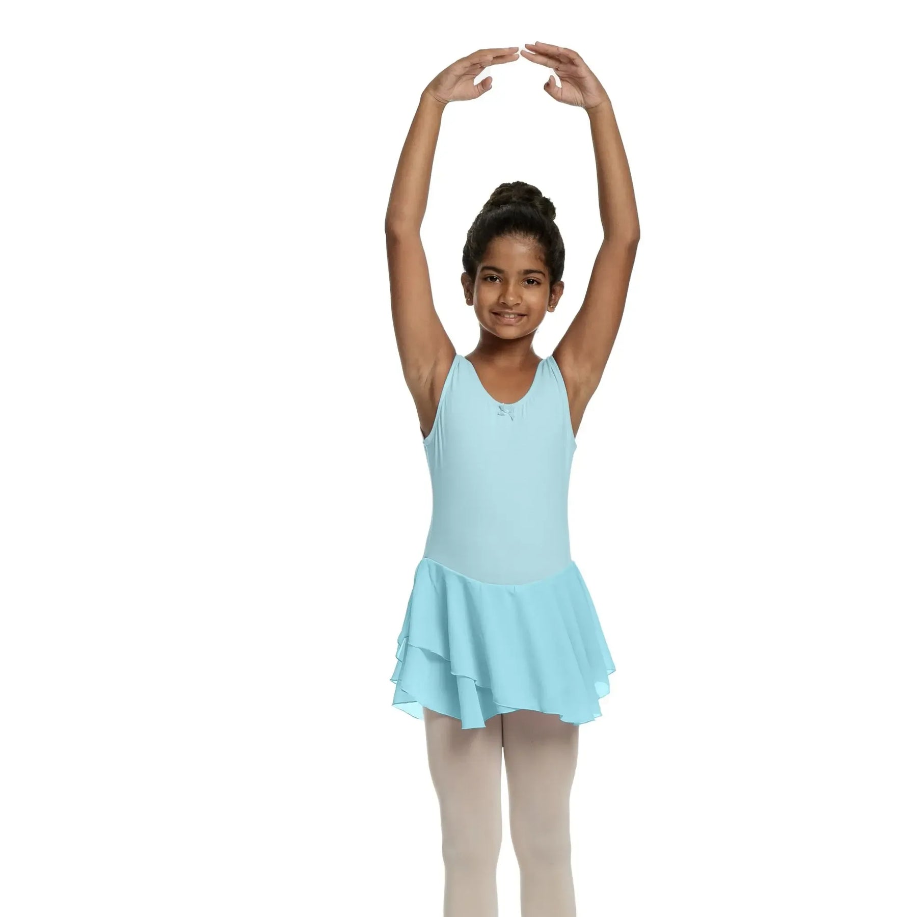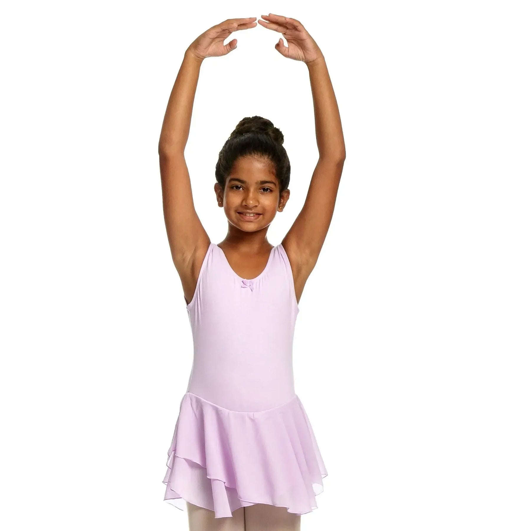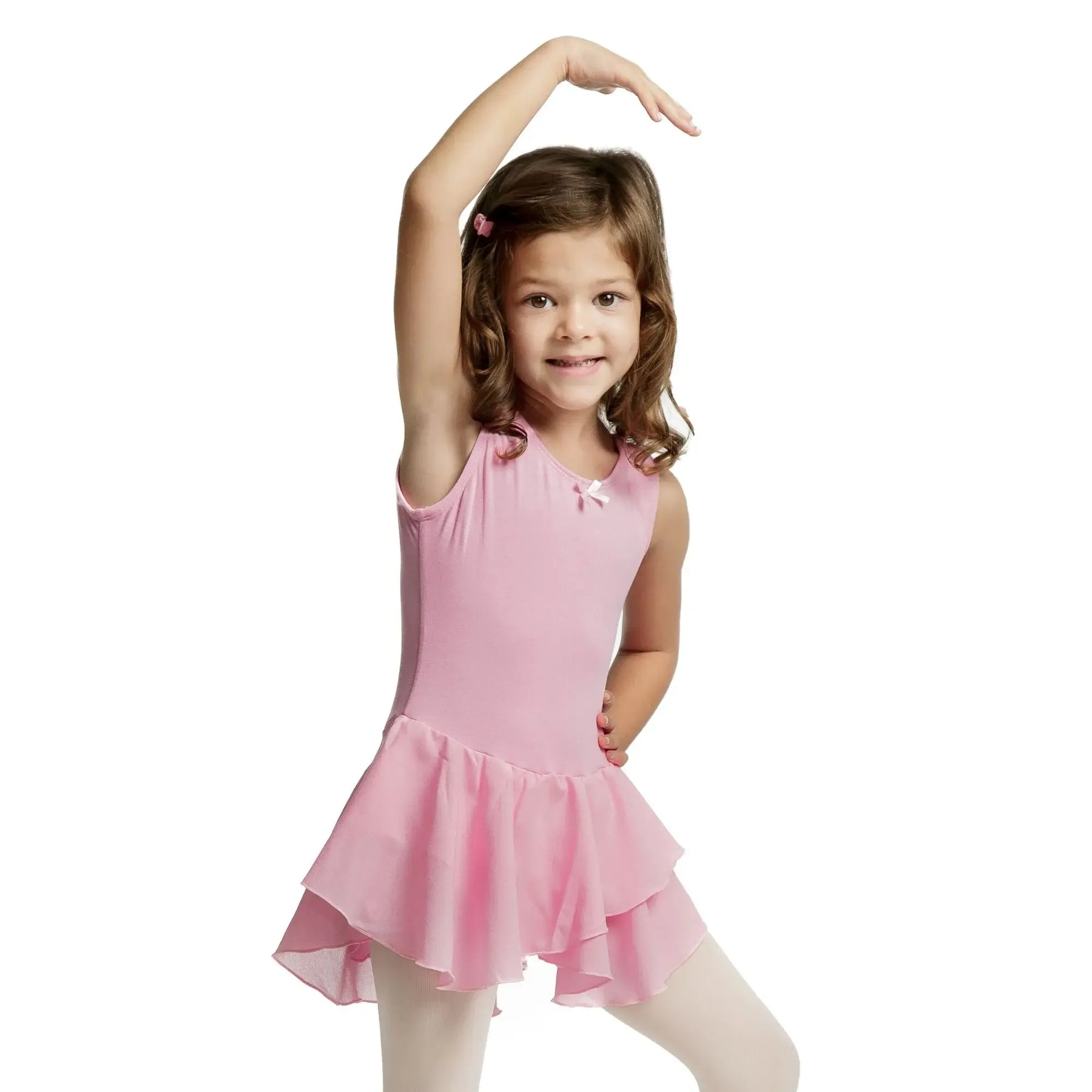 A cotton-spandex ballerina dress with a soft mesh chiffon skirt, designed for flexible, breathable, and elegant performance.