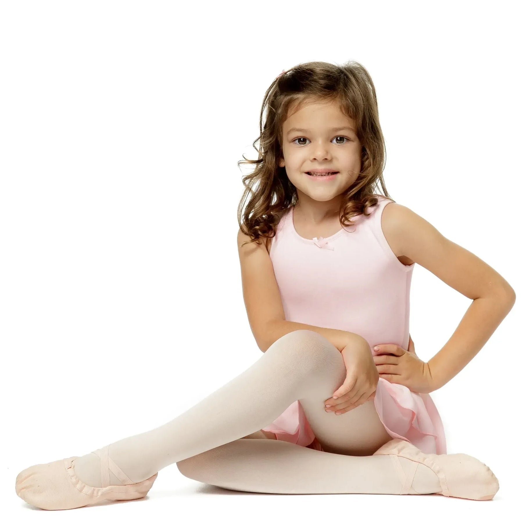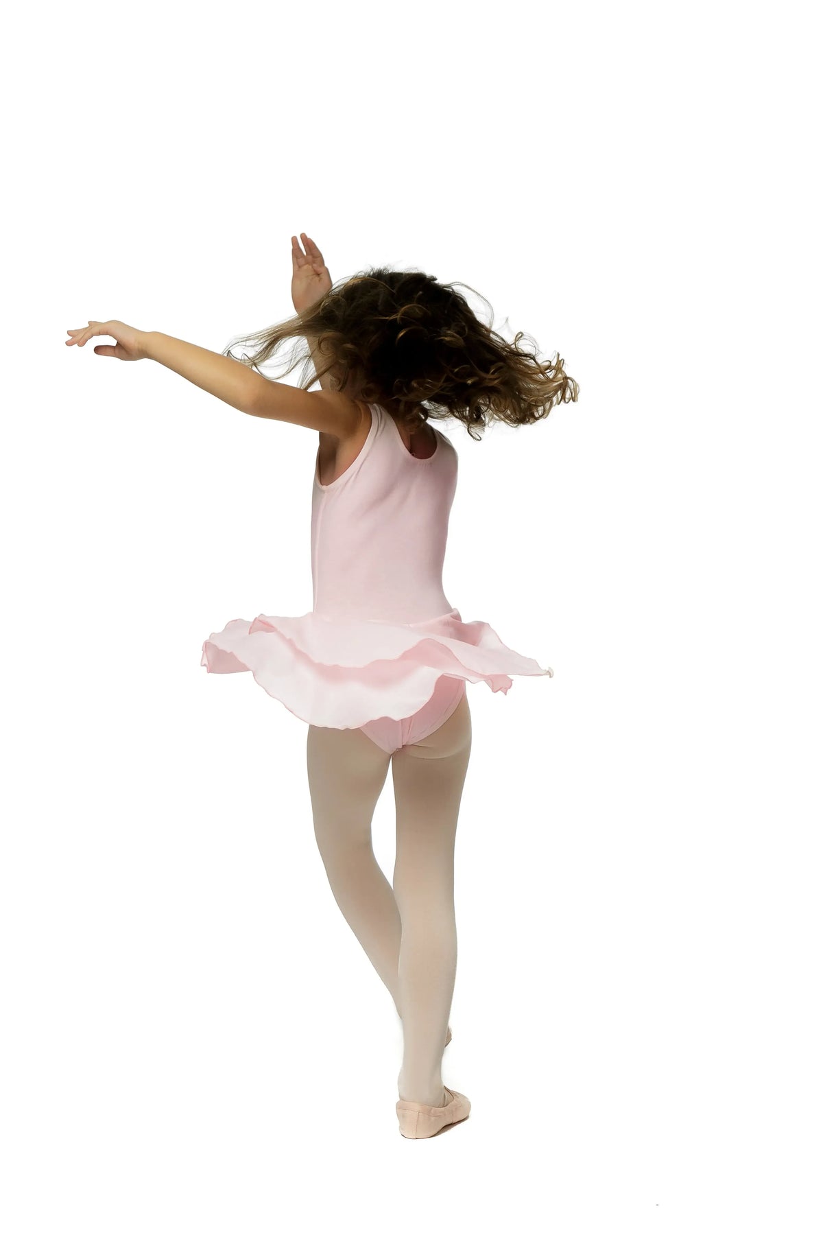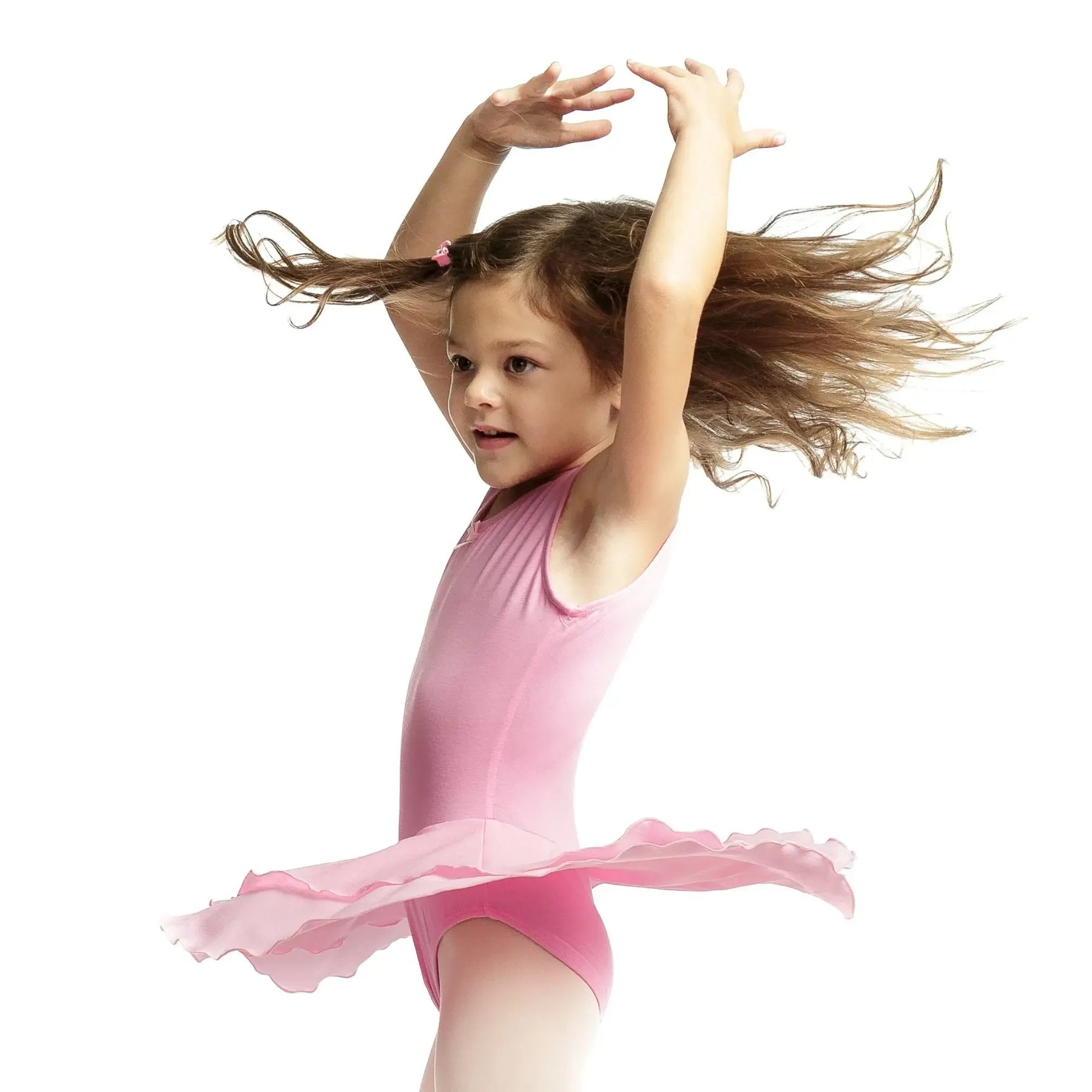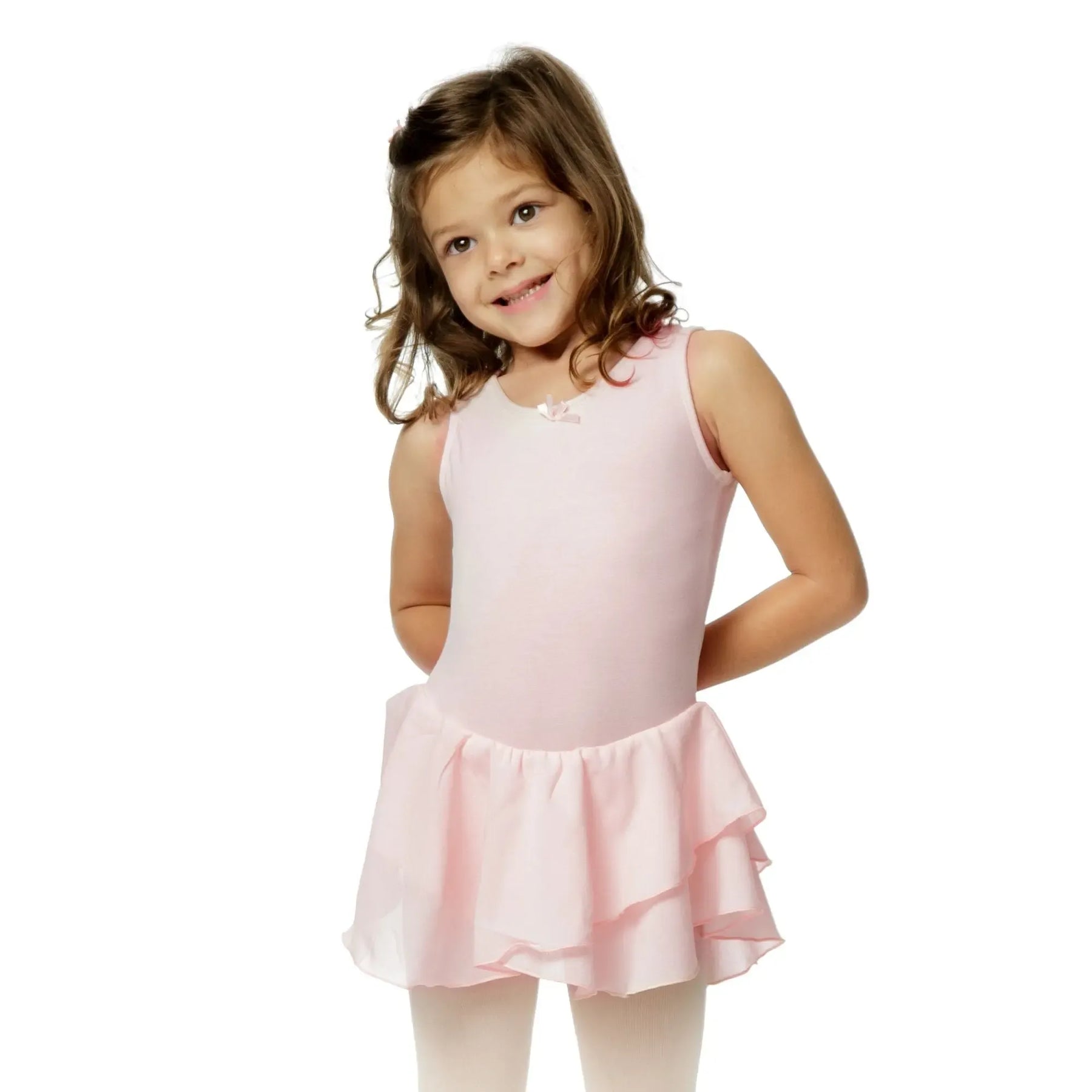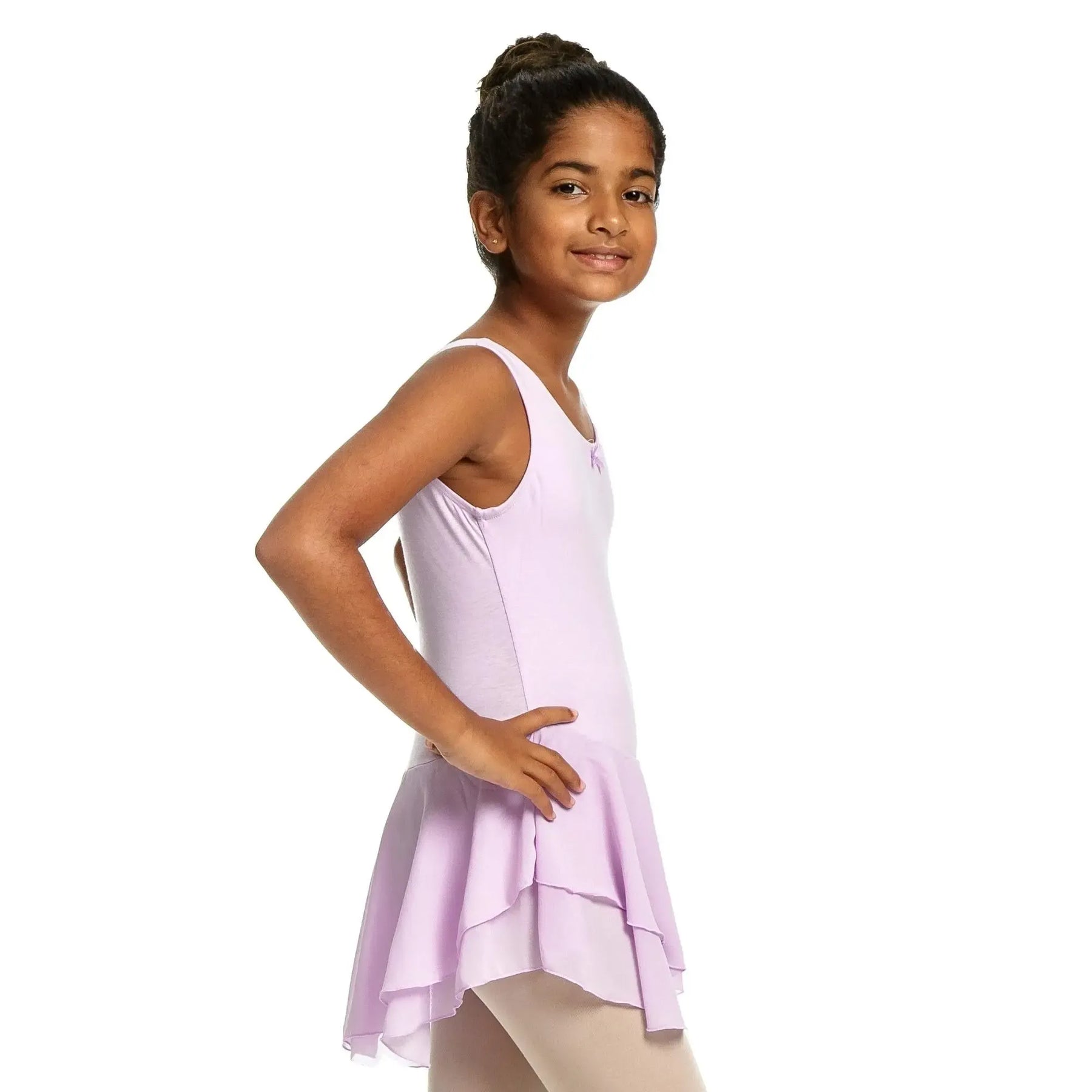 A cotton-spandex ballerina dress with a soft mesh chiffon skirt, designed for flexible, breathable, and elegant performance.