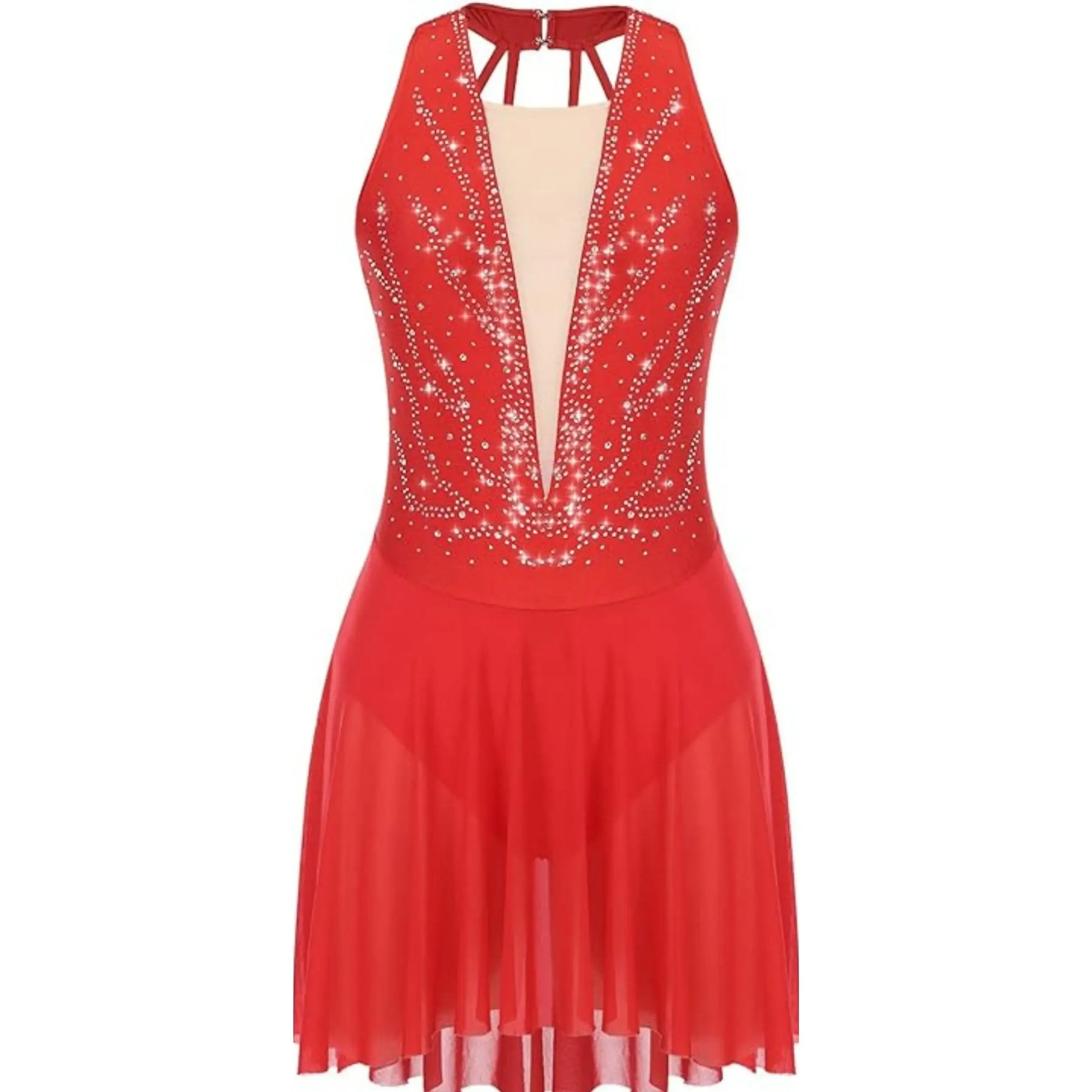 A rhinestone-embellished nylon-spandex dress with a sheer mesh neckline and flowy skirt, designed for fluid, elegant lyrical performance.