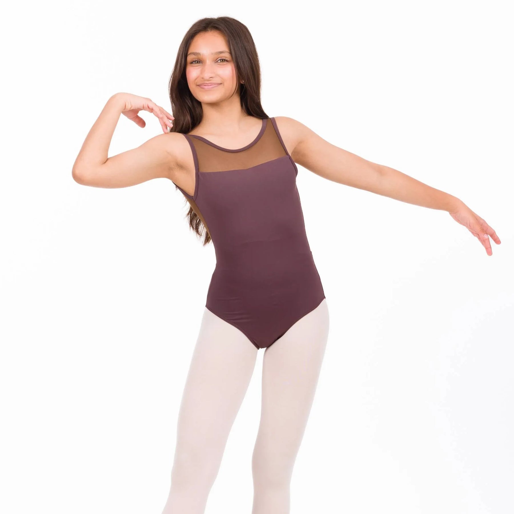 Elegantly engineered in soft 4-way stretch nylon-spandex, tank silhouette with mesh neckline for style, performance-ready look with comfort and style.