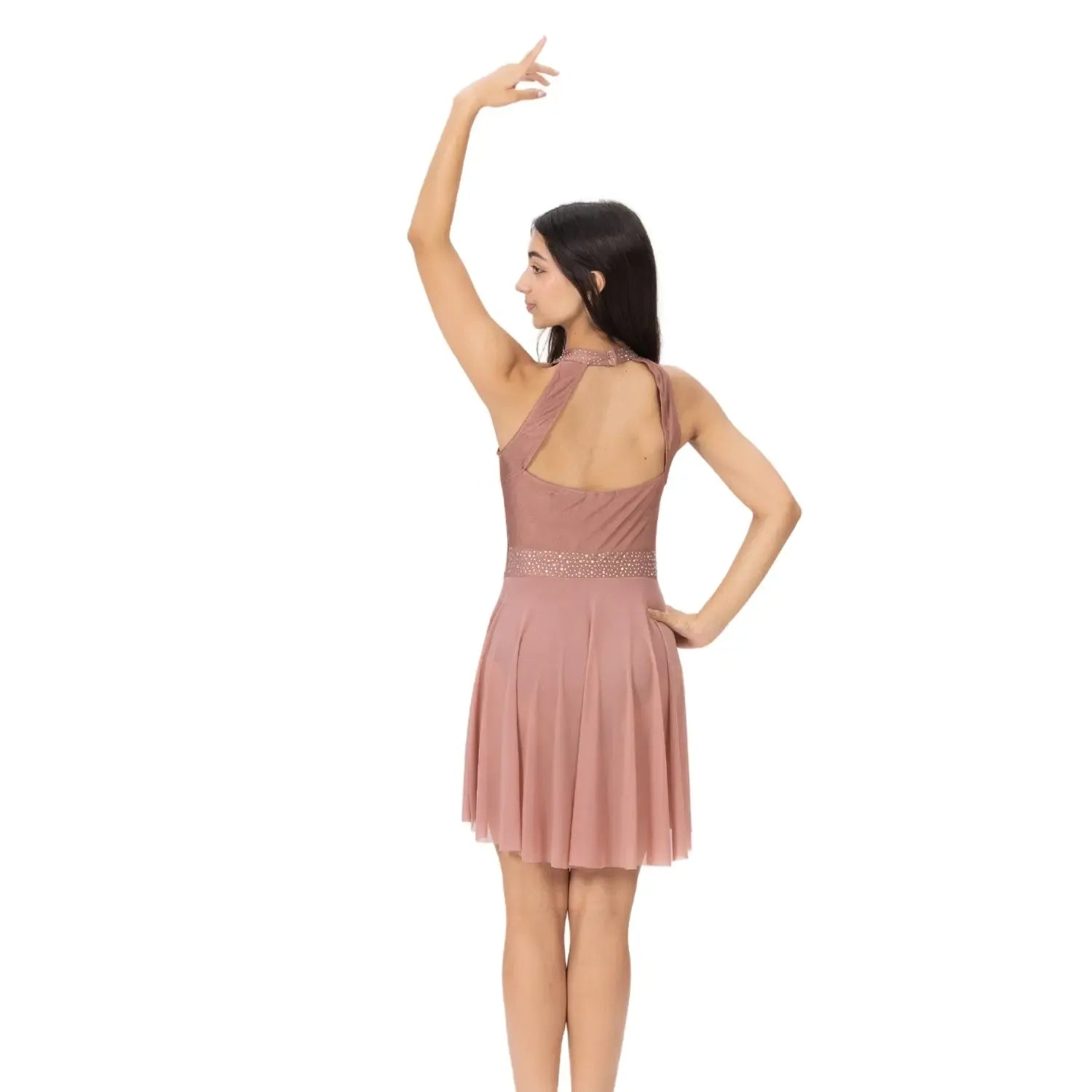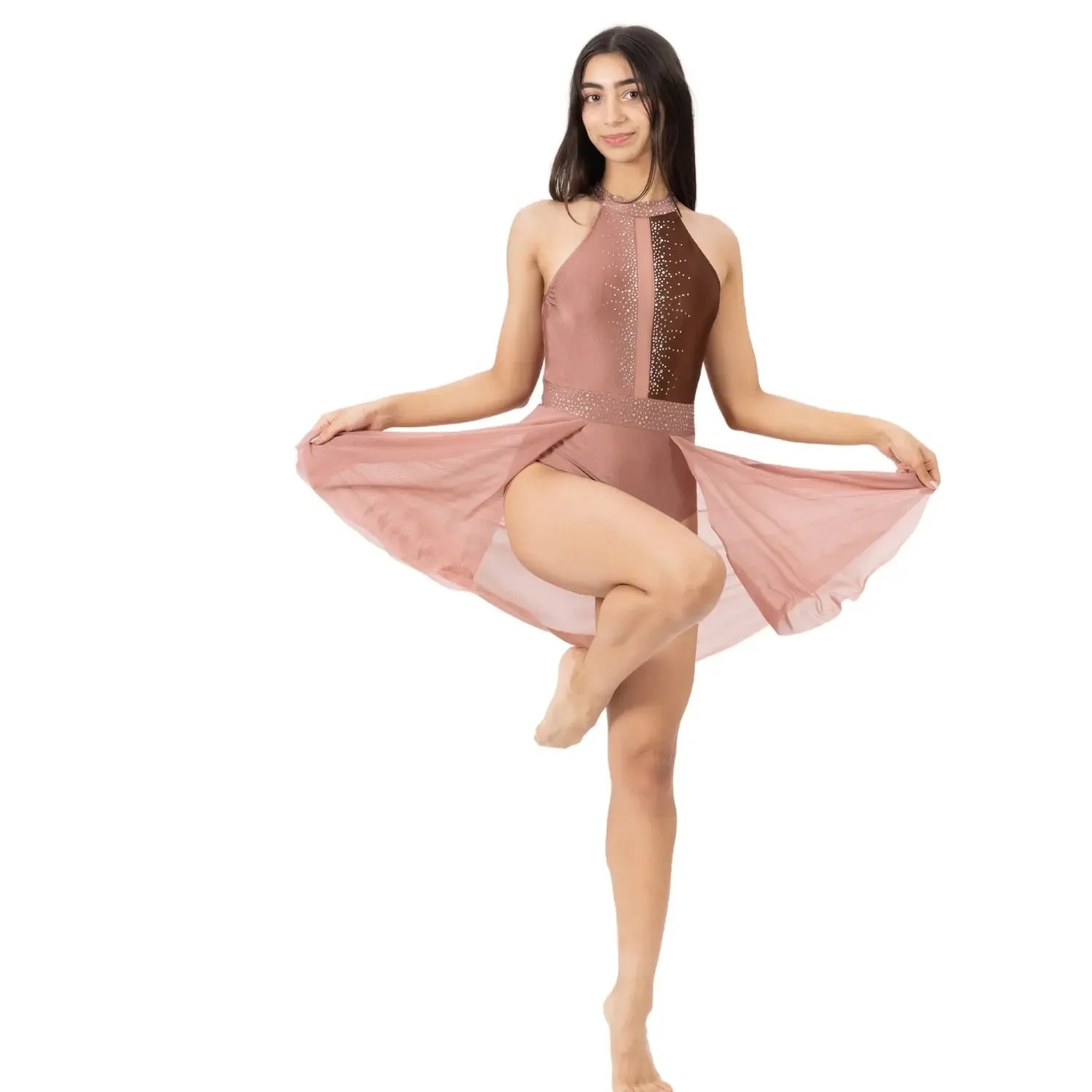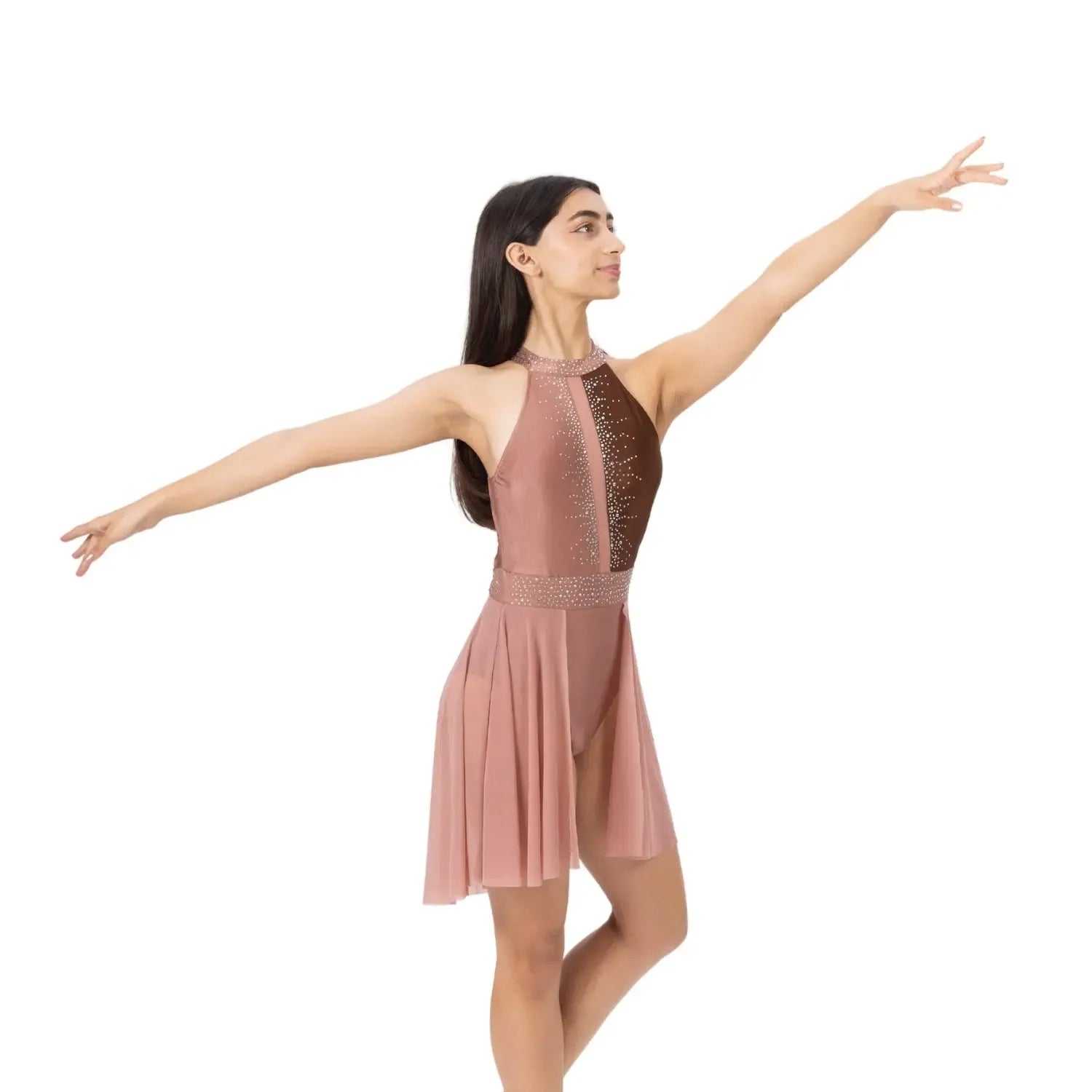 A rhinestone-detailed nylon-spandex dress with a flowy mesh skirt, designed for fluid, graceful performance across stage and sport.