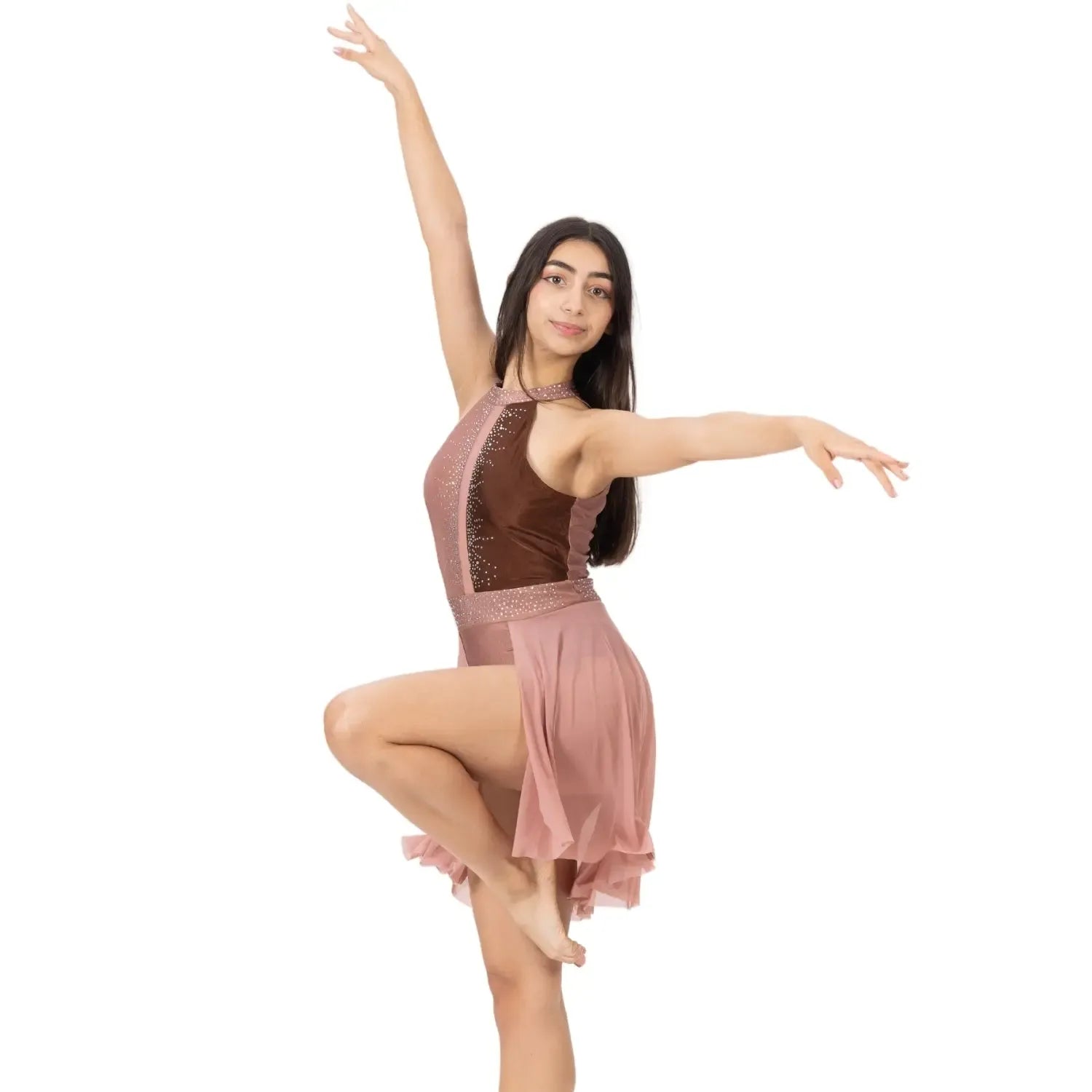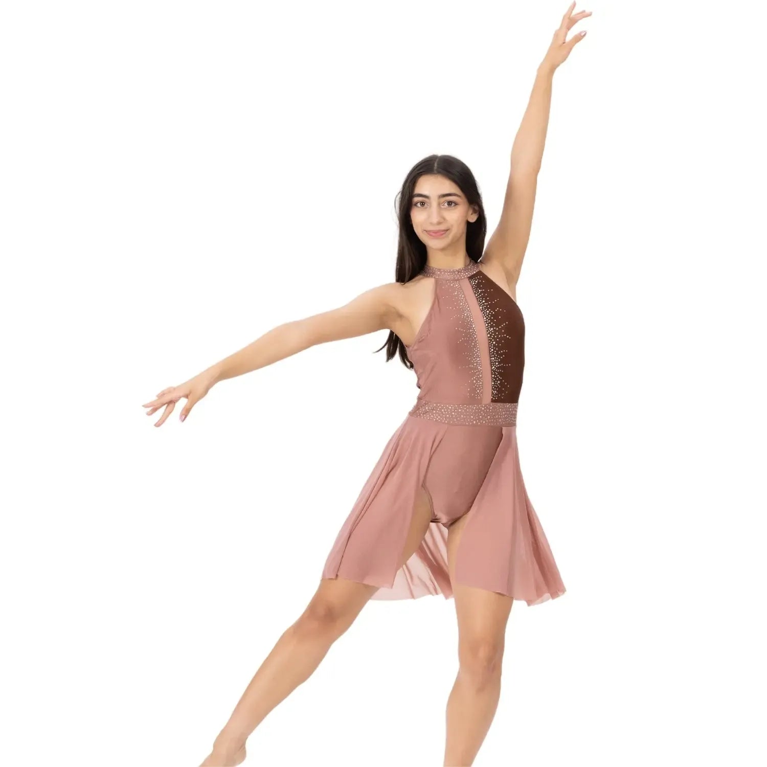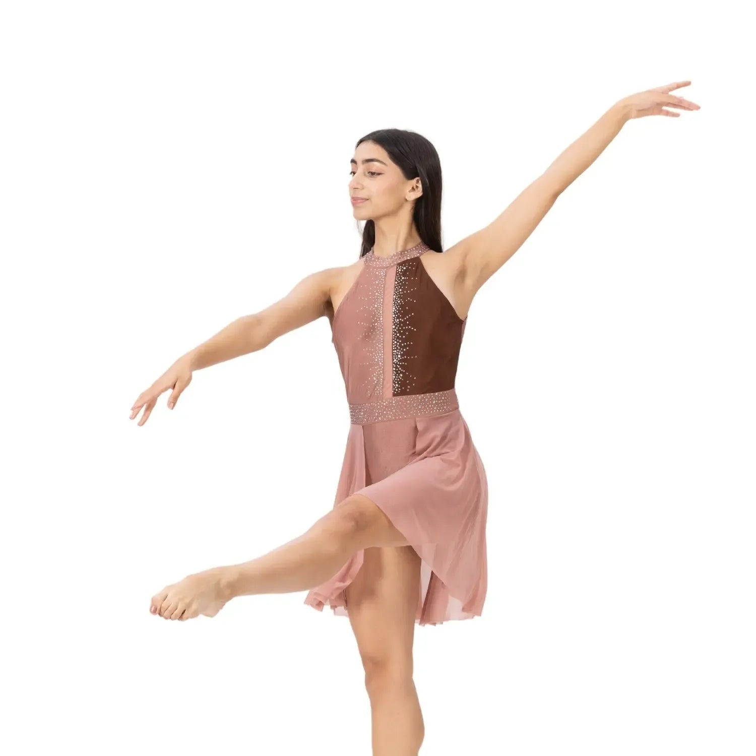 A rhinestone-detailed nylon-spandex dress with a flowy mesh skirt, designed for fluid, graceful performance across stage and sport.
