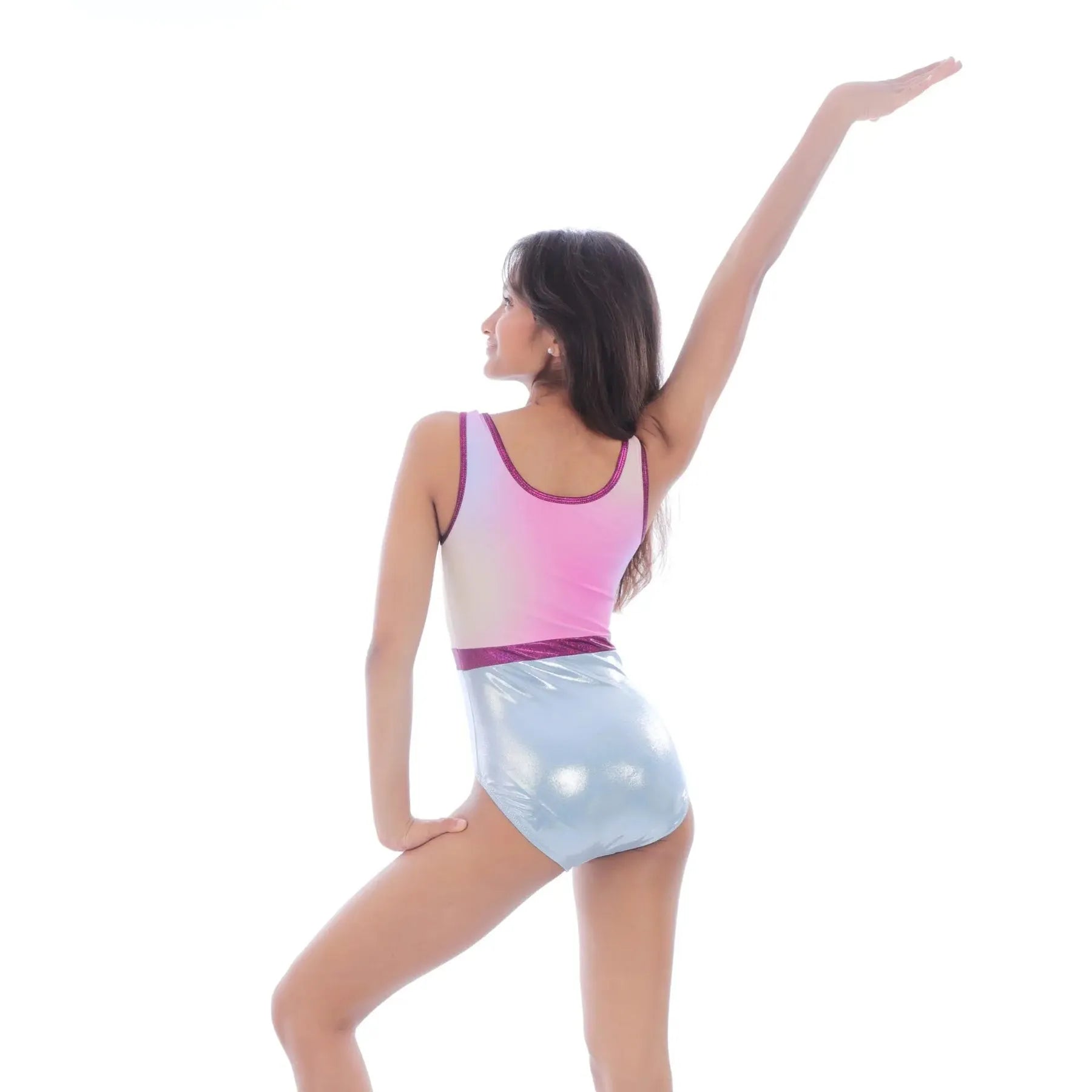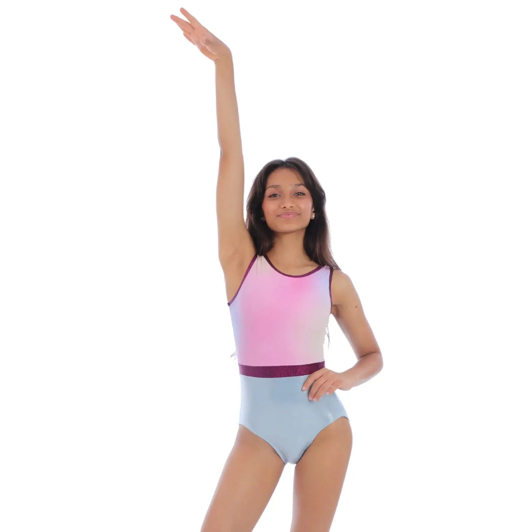 Elegantly engineered in soft 4-way stretch nylon-spandex, tank silhouette with pastel ombre print, performance-ready look with comfort and style.