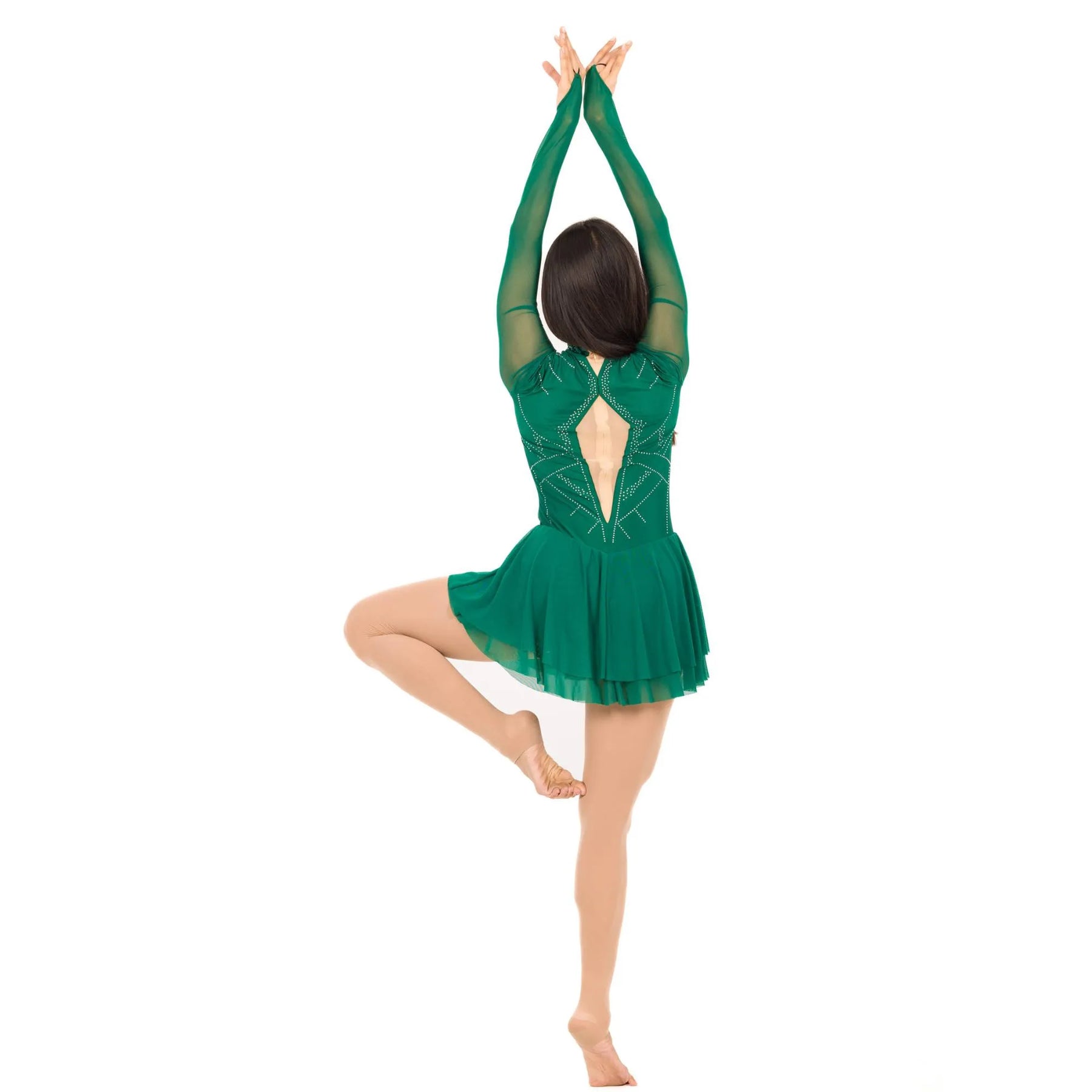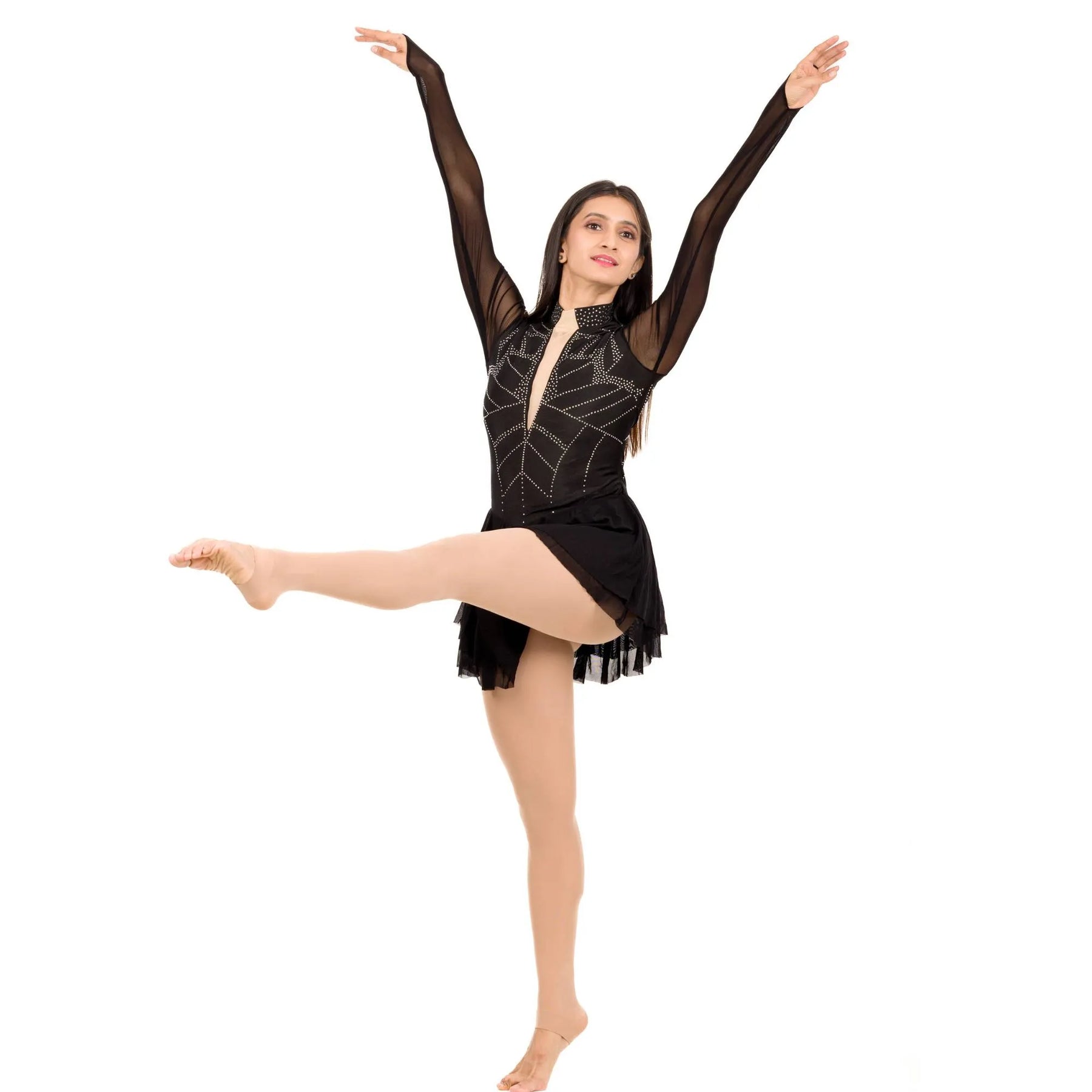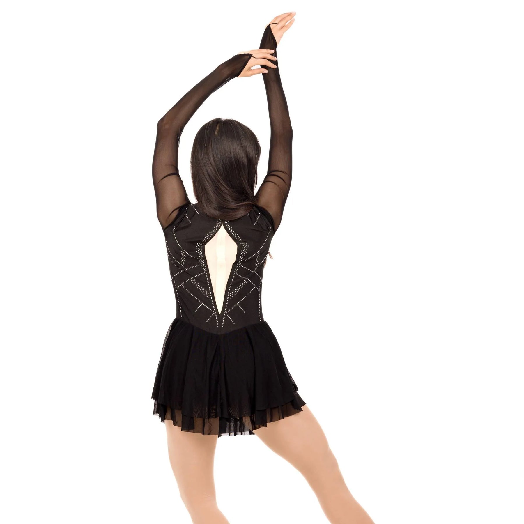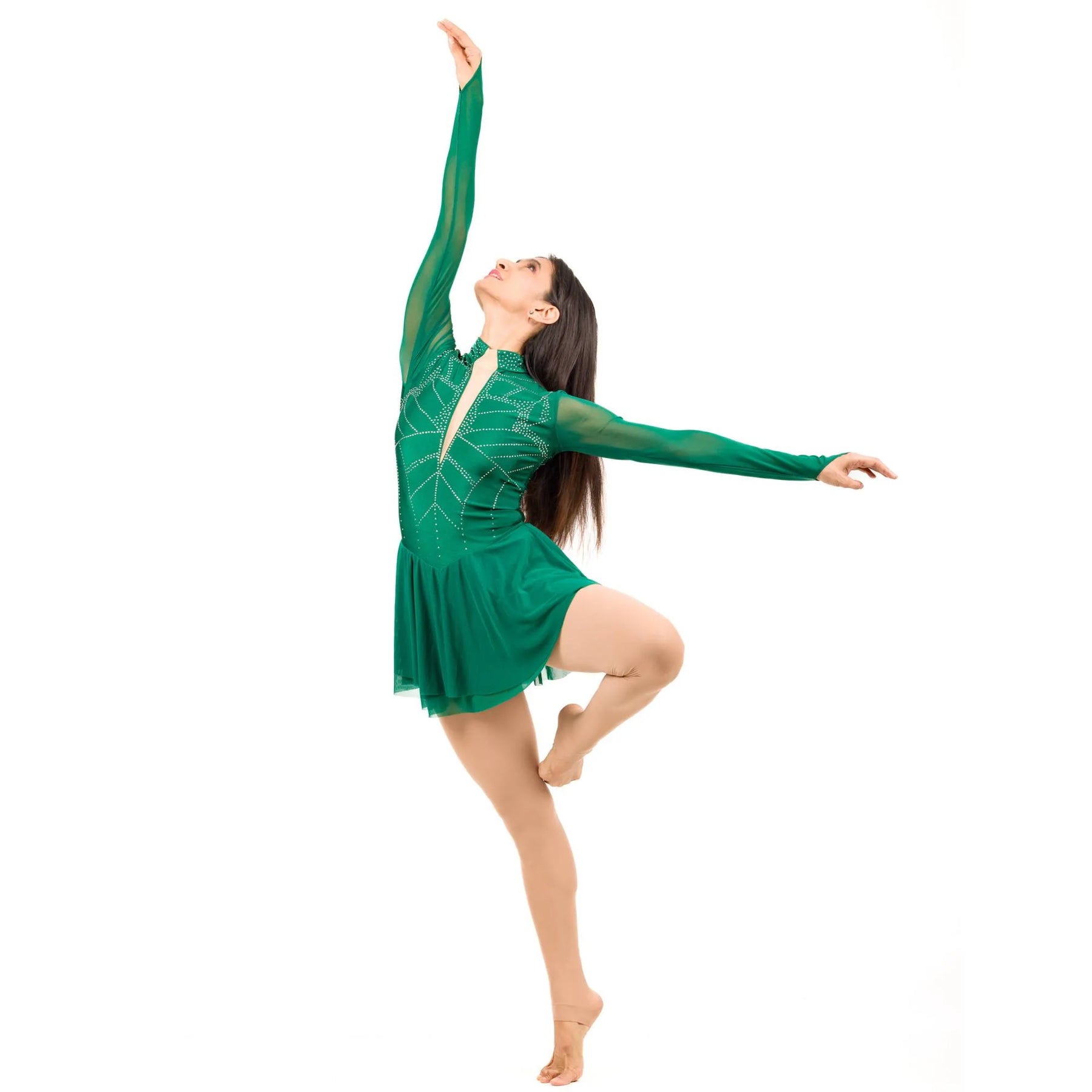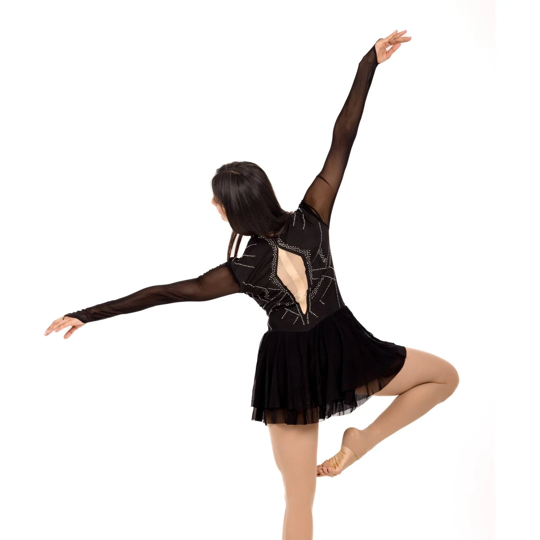 A geometric-rhinestone leotard dress with sheer mesh and breathable stretch, designed for elegant, comfortable performance.