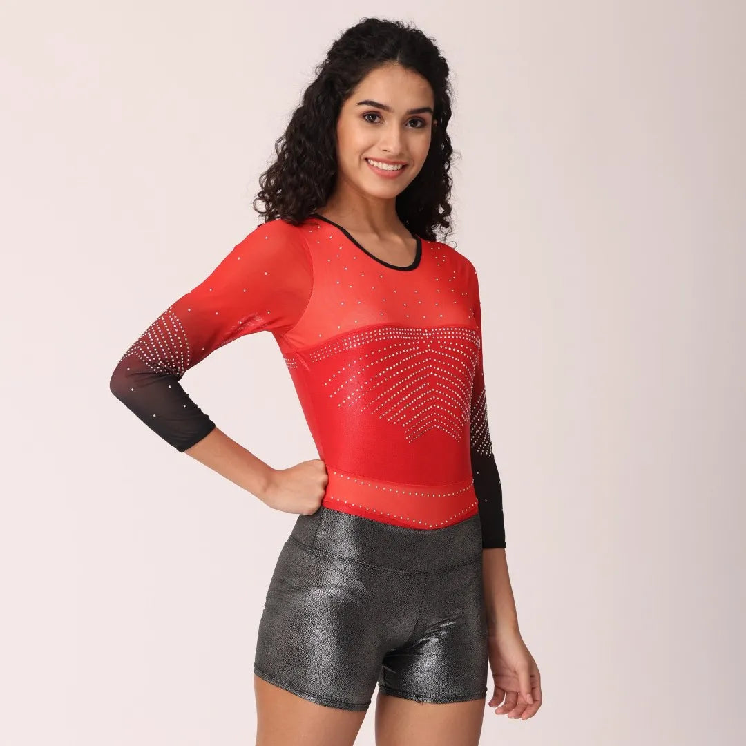 Elegantly engineered in soft 4-way stretch nylon-spandex, full sleeve silhouette with metallic print and rhinestones, performance-ready look with comfort and style.