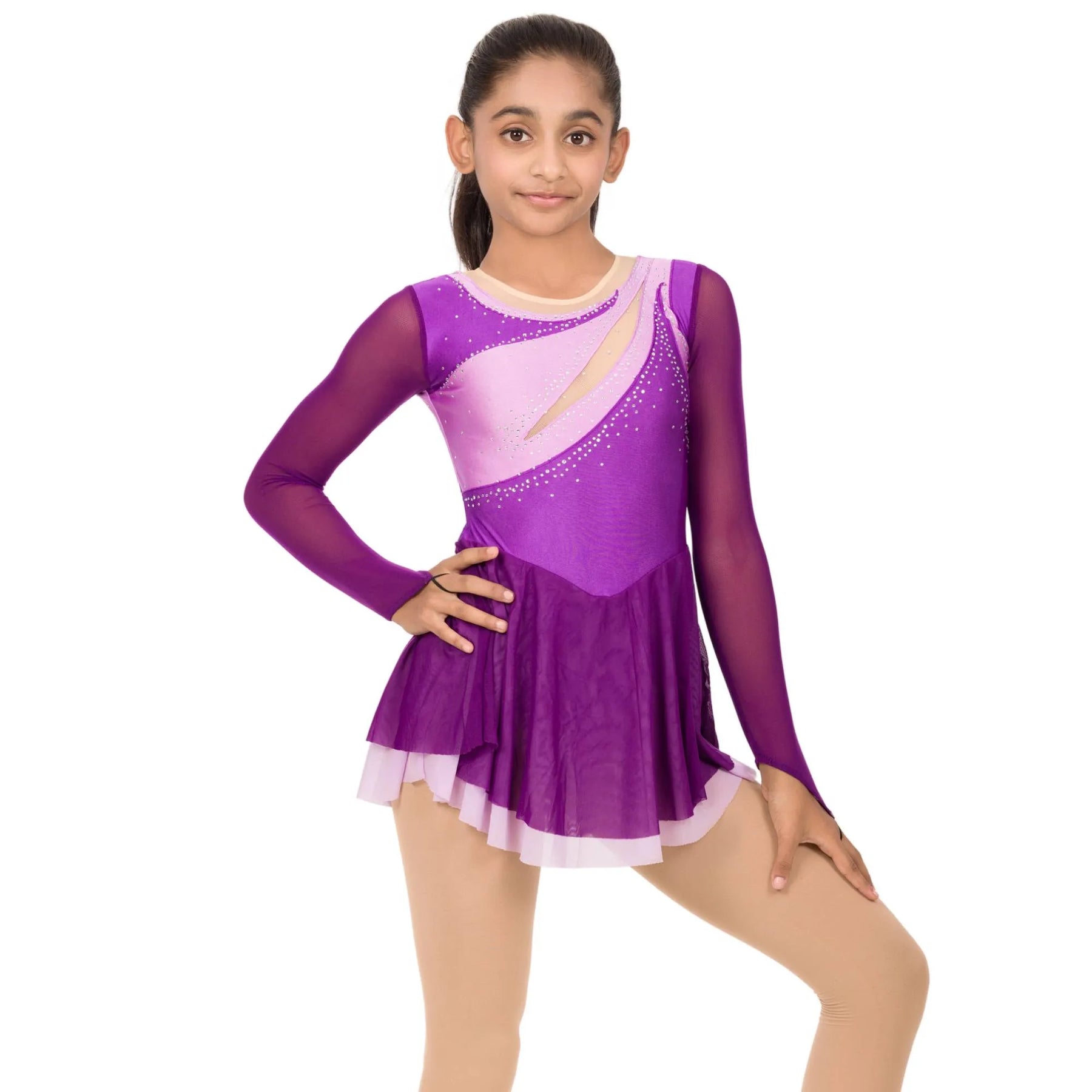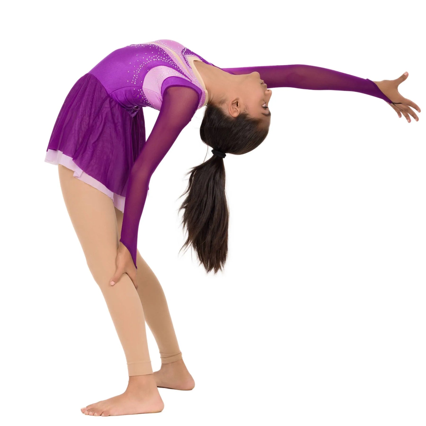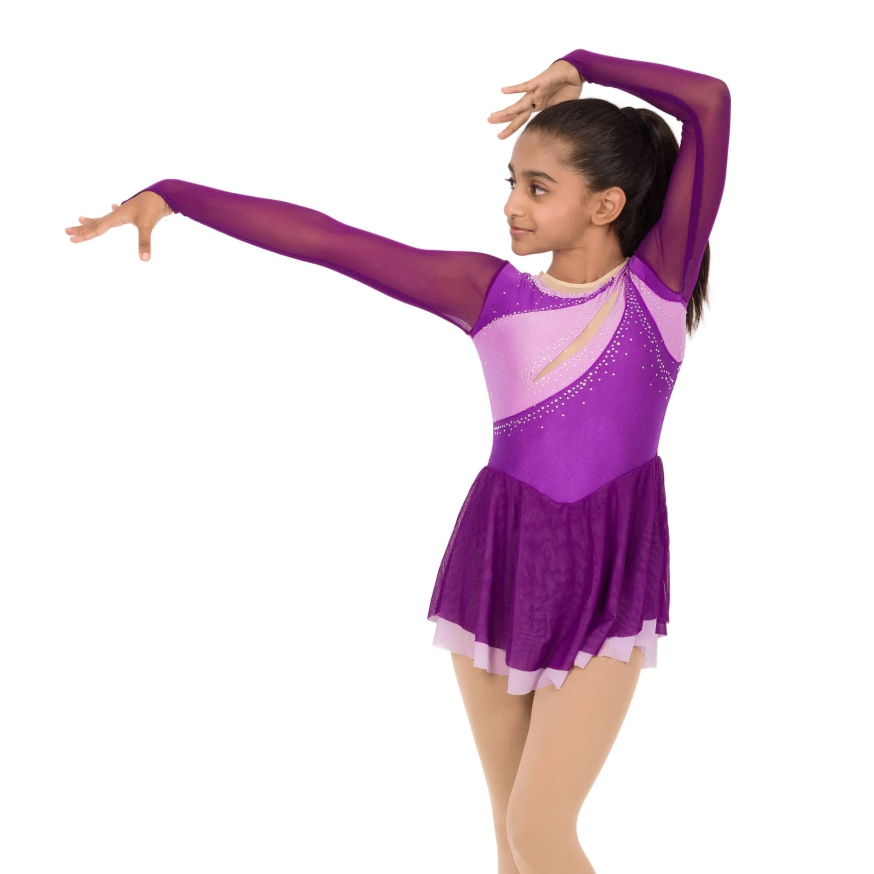 A rhinestone-detailed leotard dress with sheer mesh sleeves and a flowing skirt, designed for breathable comfort and elegant performance.