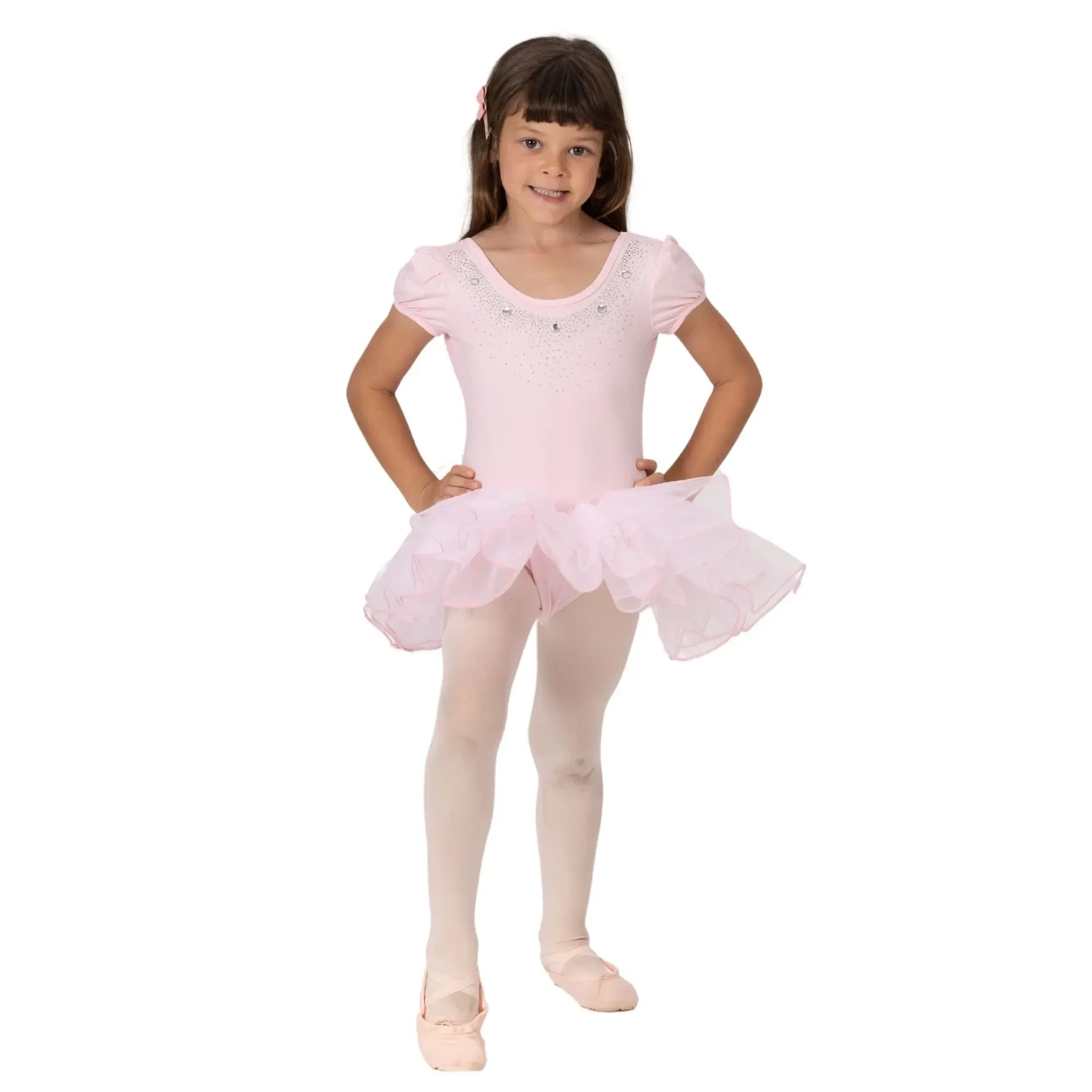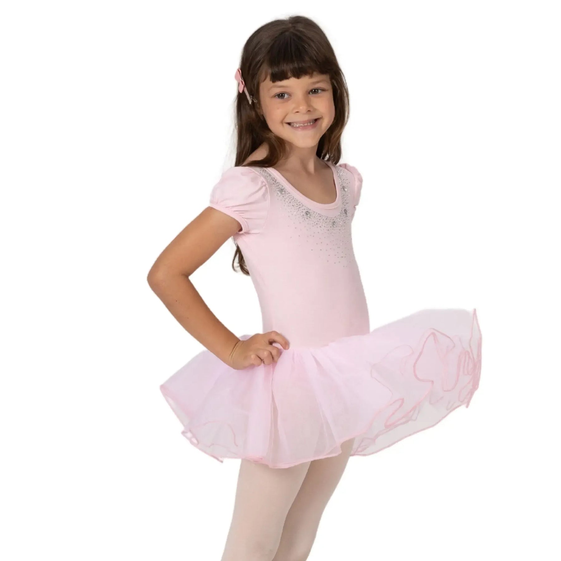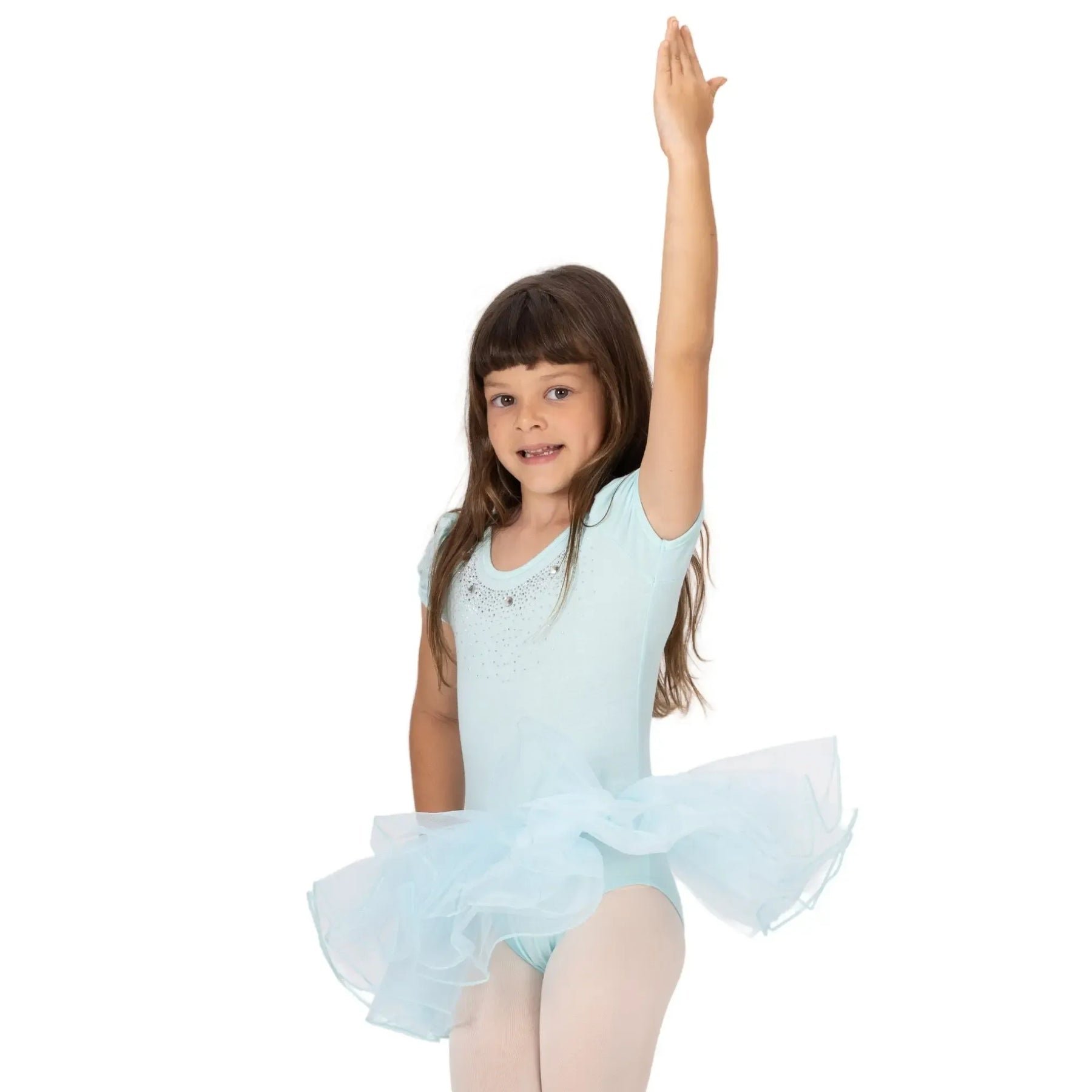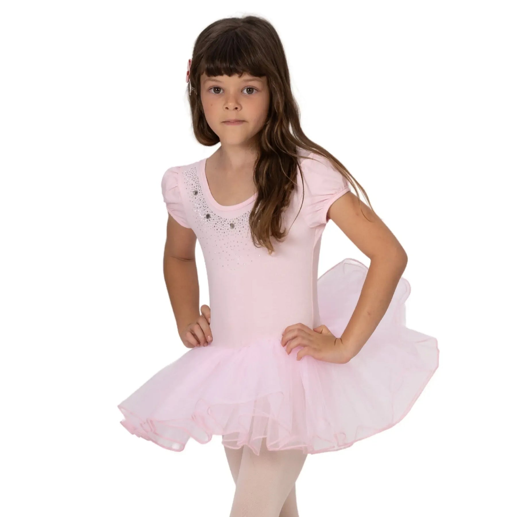 A breathable ballerina dress with a poly-spandex bodice and four-layer stiff mesh tutu for structured, comfortable performance.