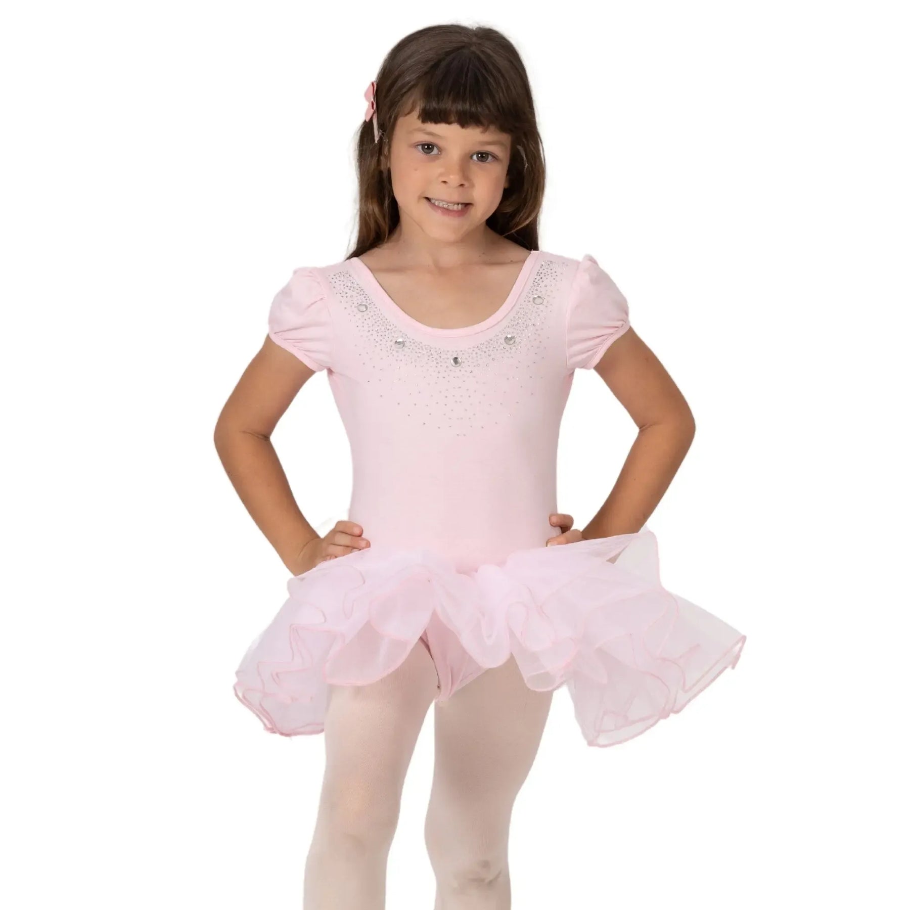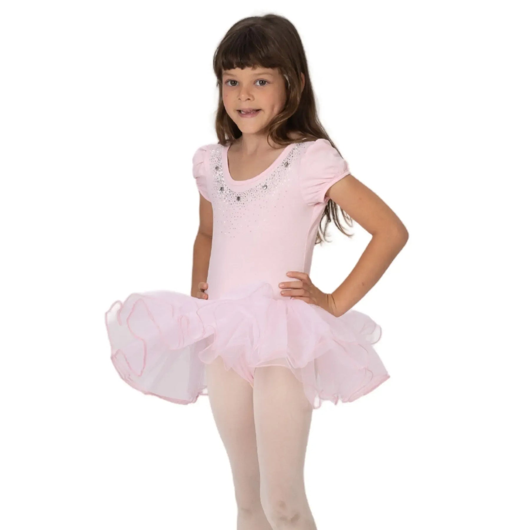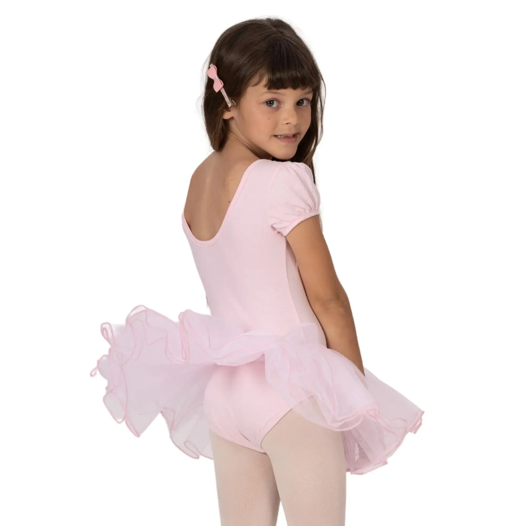 A breathable ballerina dress with a poly-spandex bodice and four-layer stiff mesh tutu for structured, comfortable performance.