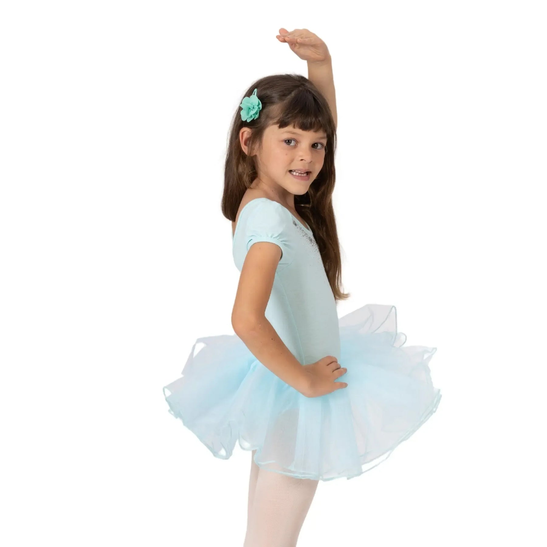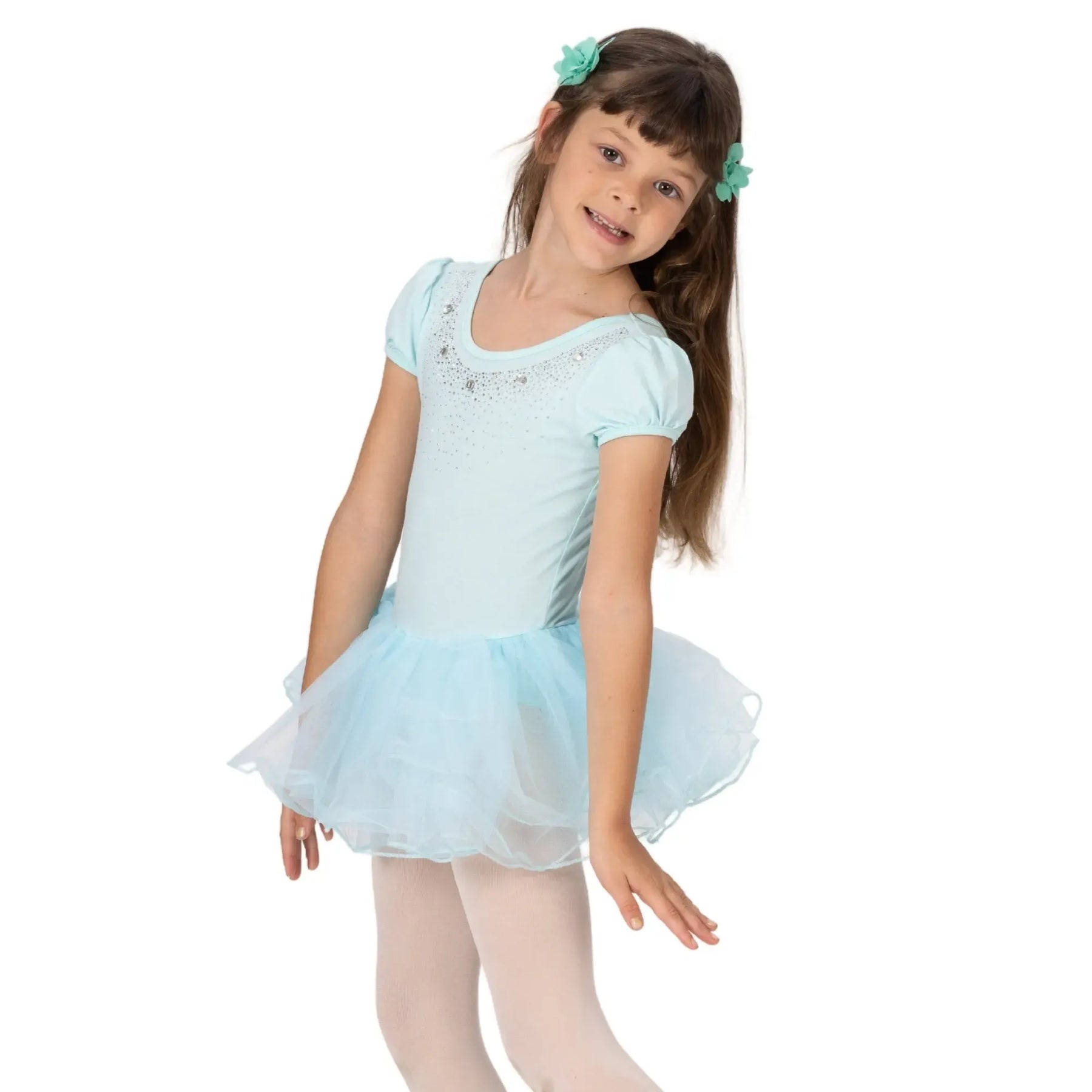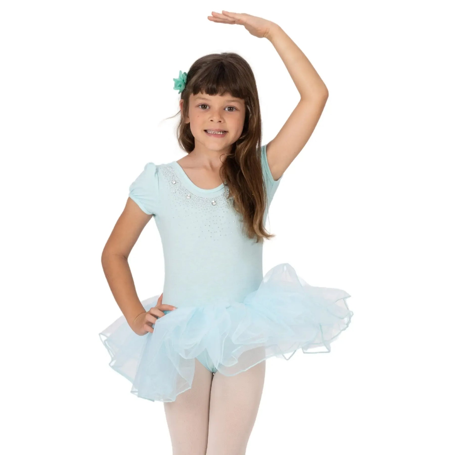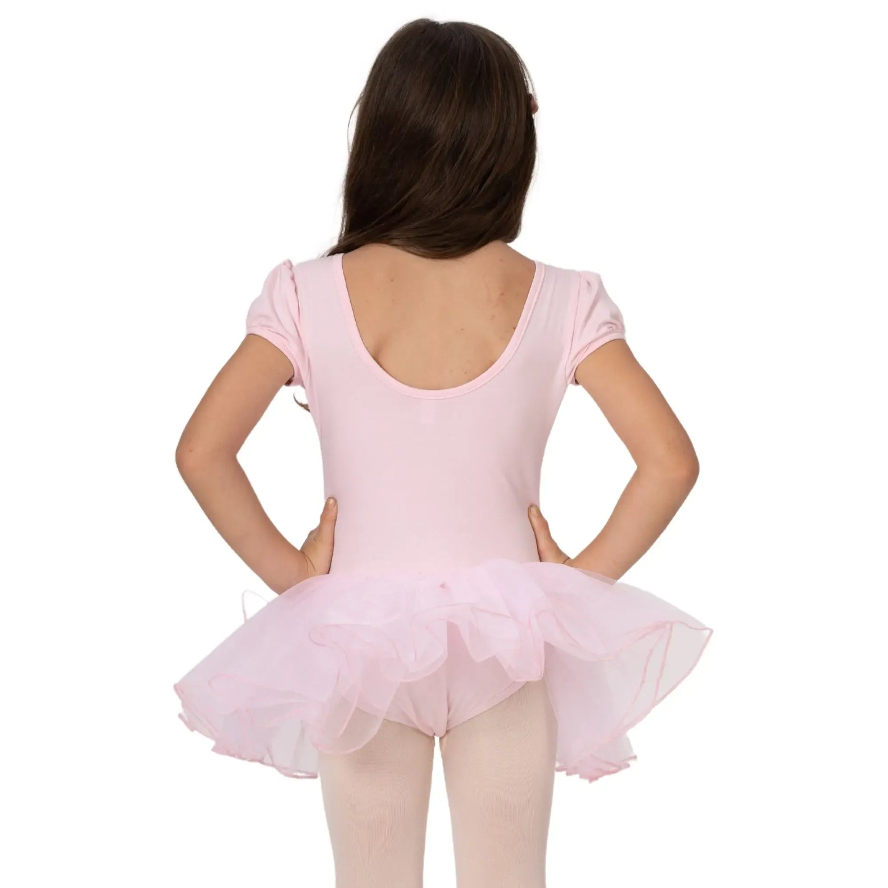 A breathable ballerina dress with a poly-spandex bodice and four-layer stiff mesh tutu for structured, comfortable performance.