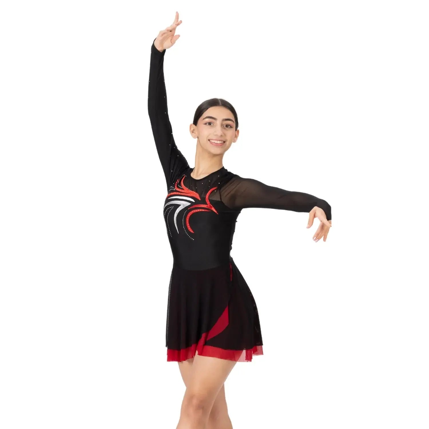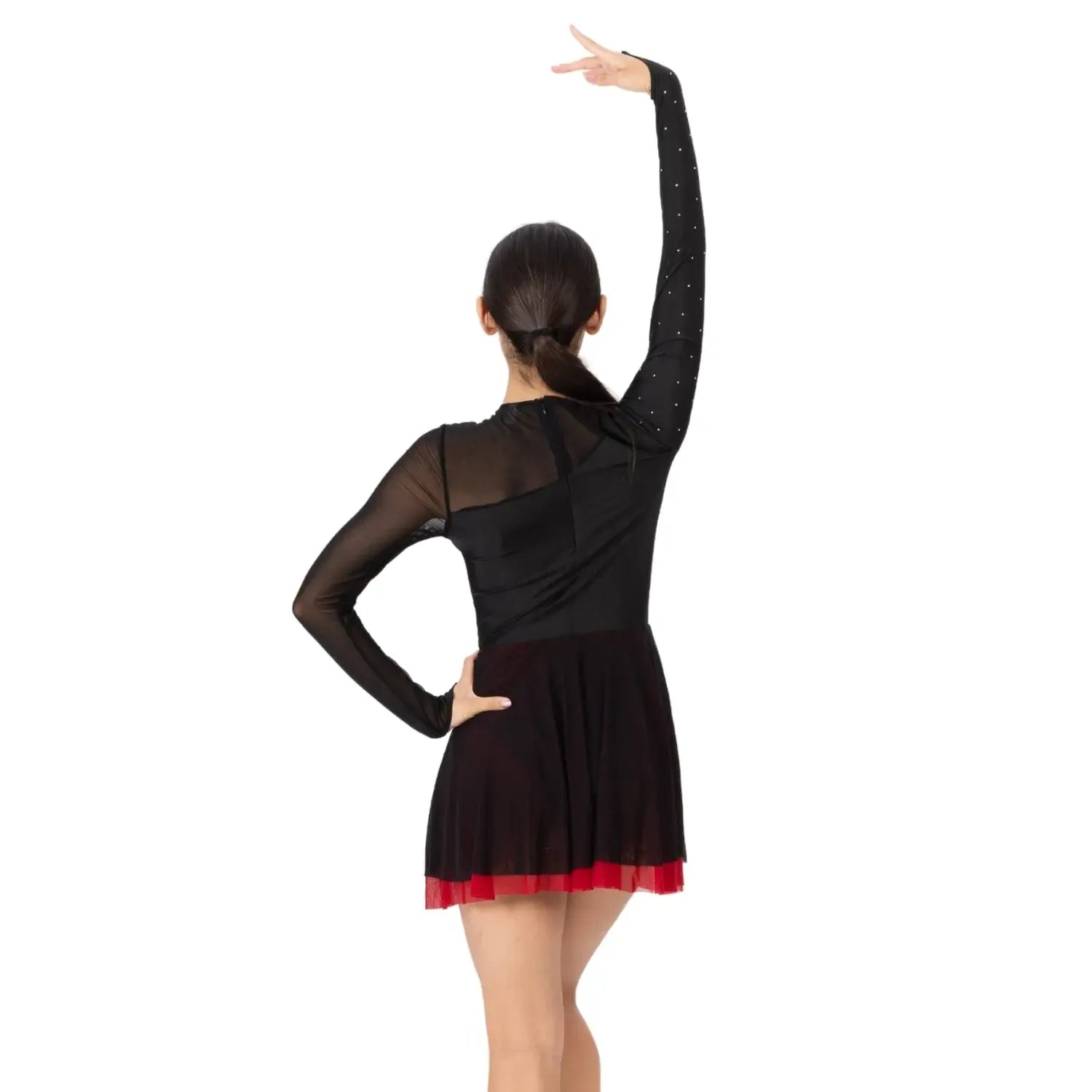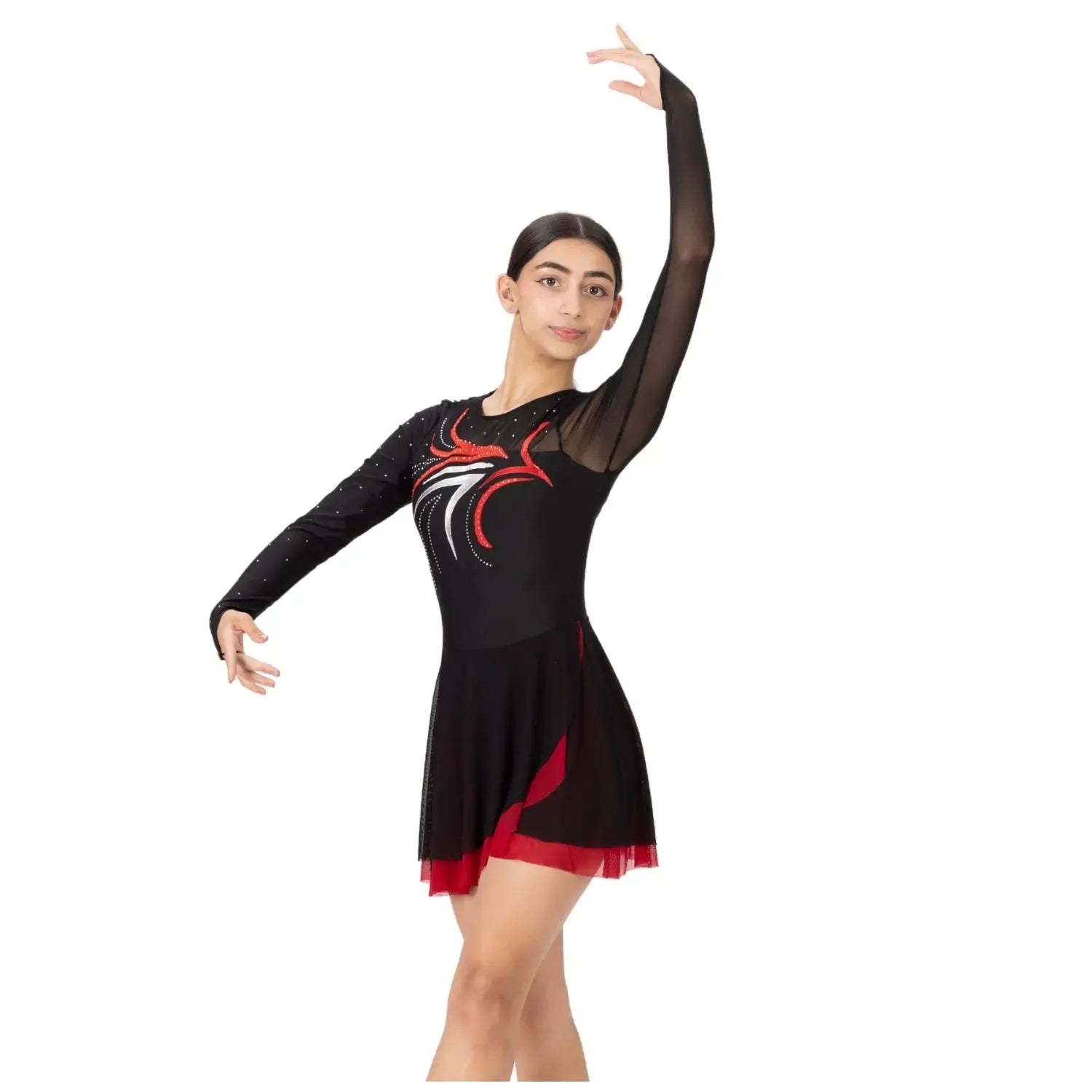 A foil-finish, rhinestone-detailed leotard dress with mesh sleeves and a tailored fit for breathable, elegant performance.