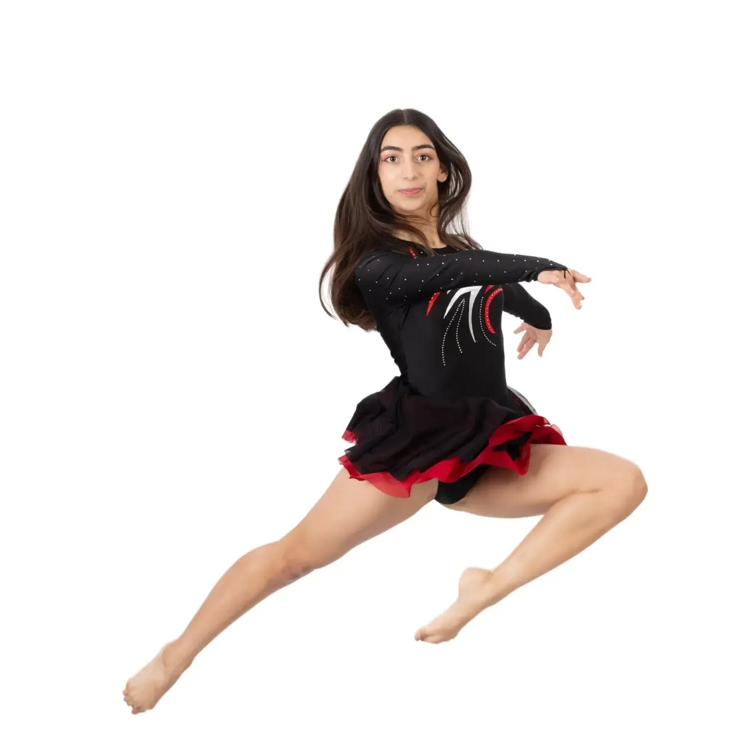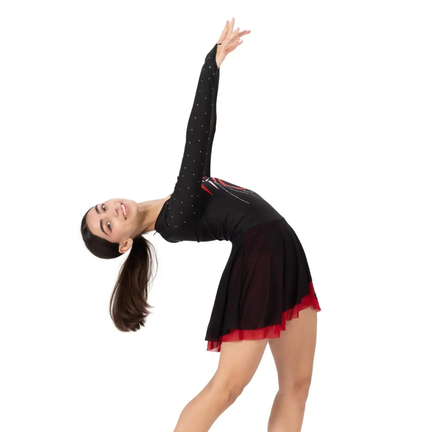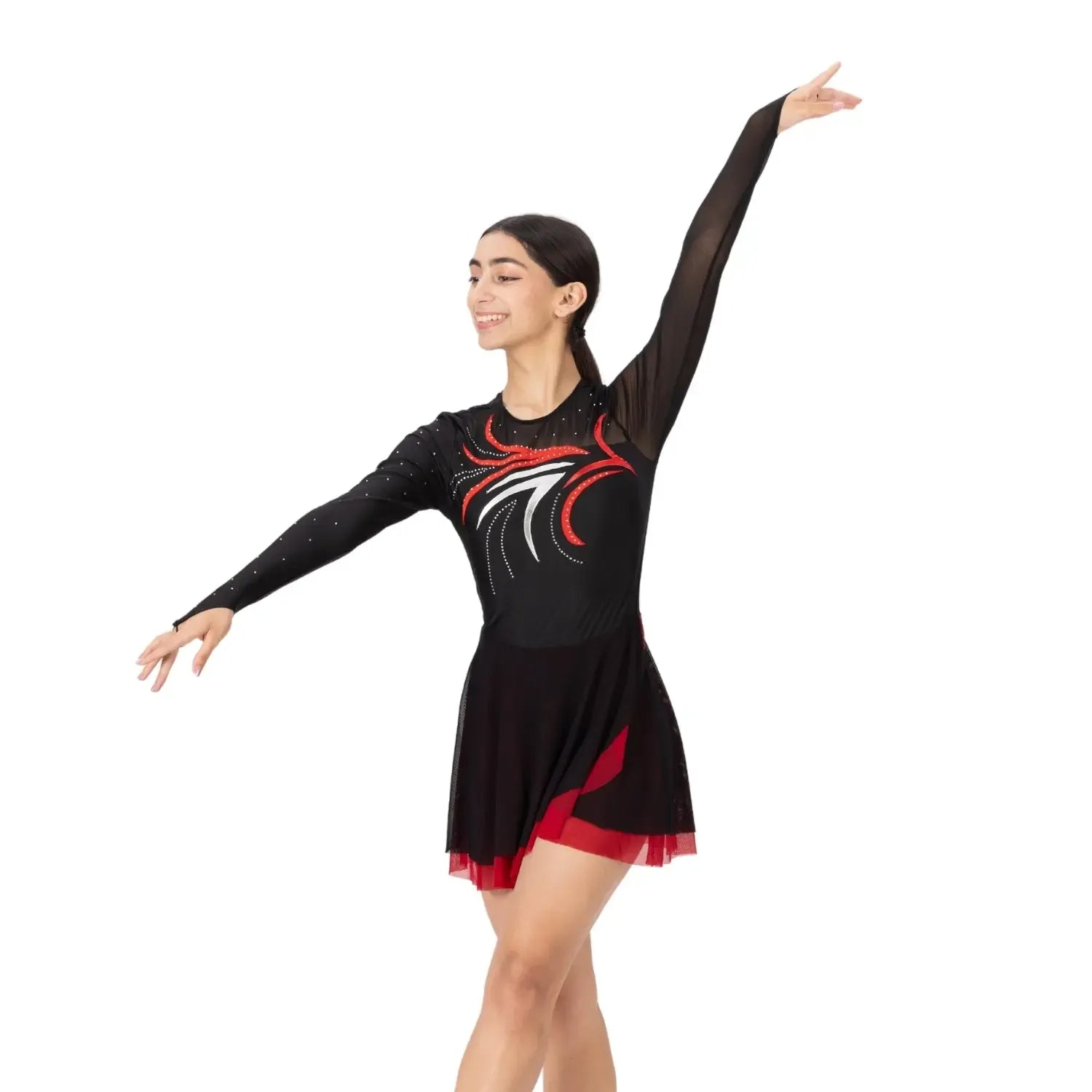 A foil-finish, rhinestone-detailed leotard dress with mesh sleeves and a tailored fit for breathable, elegant performance.