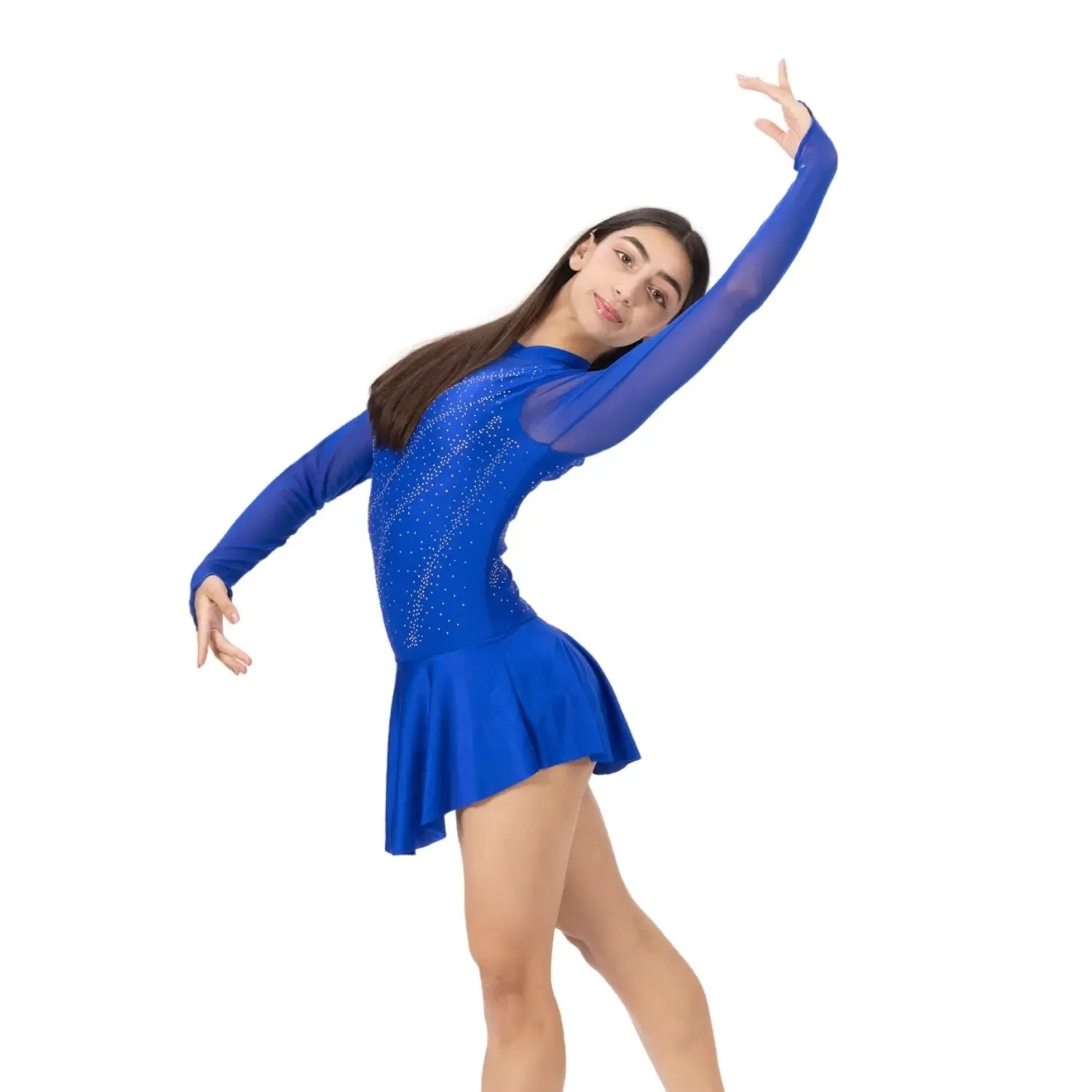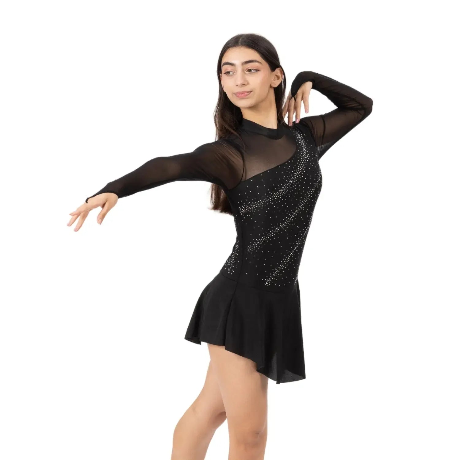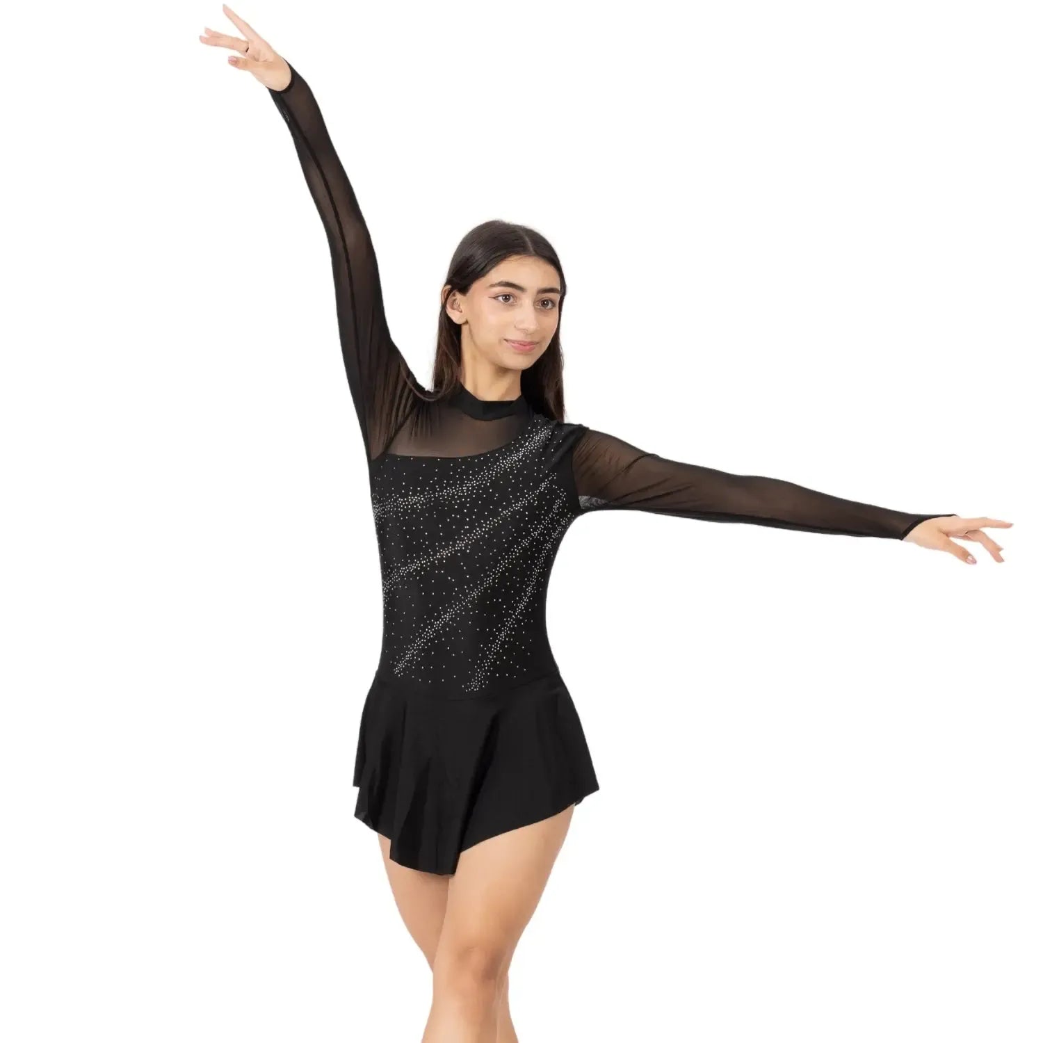 A rhinestone-embellished leotard dress with mesh sleeves and a high neckline, designed for breathable comfort and elegant performance.