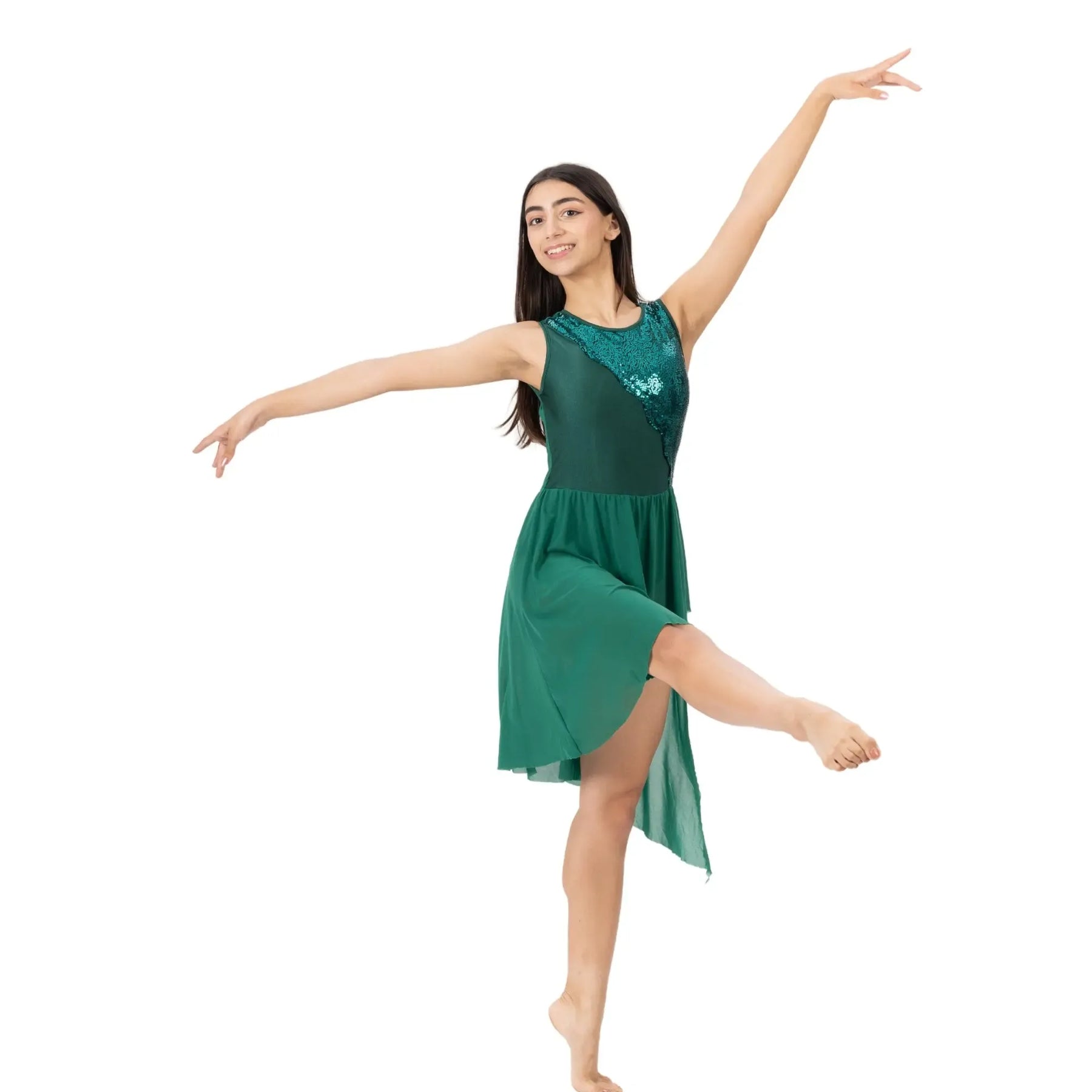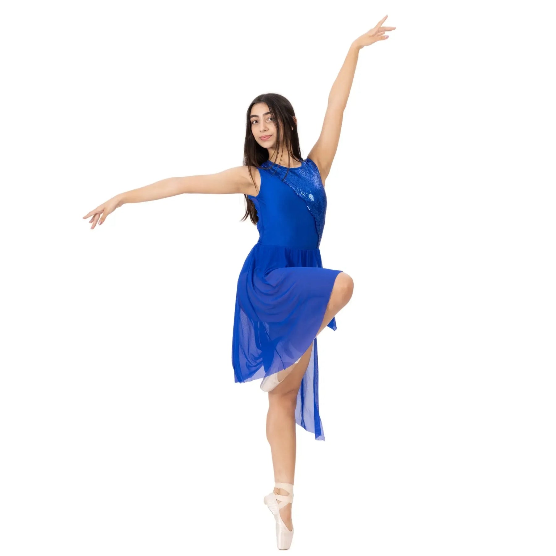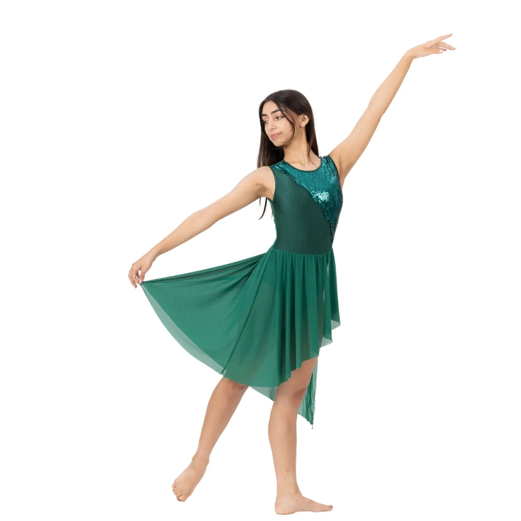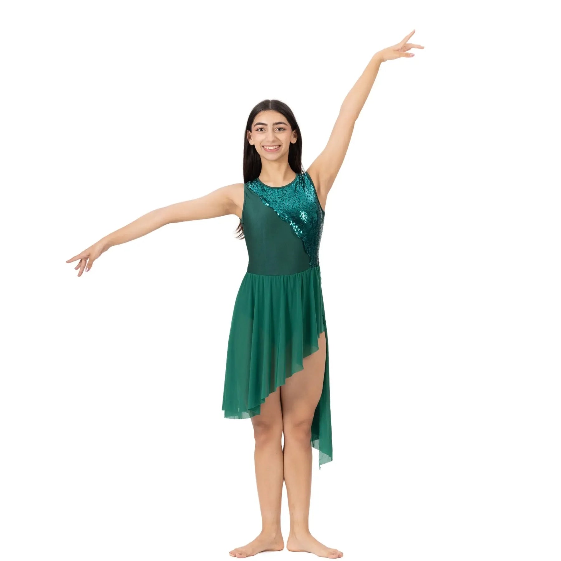 A sequin-bodice dress with a lightweight, side-slit skirt and nylon-spandex stretch, designed for fluid, elegant performance.