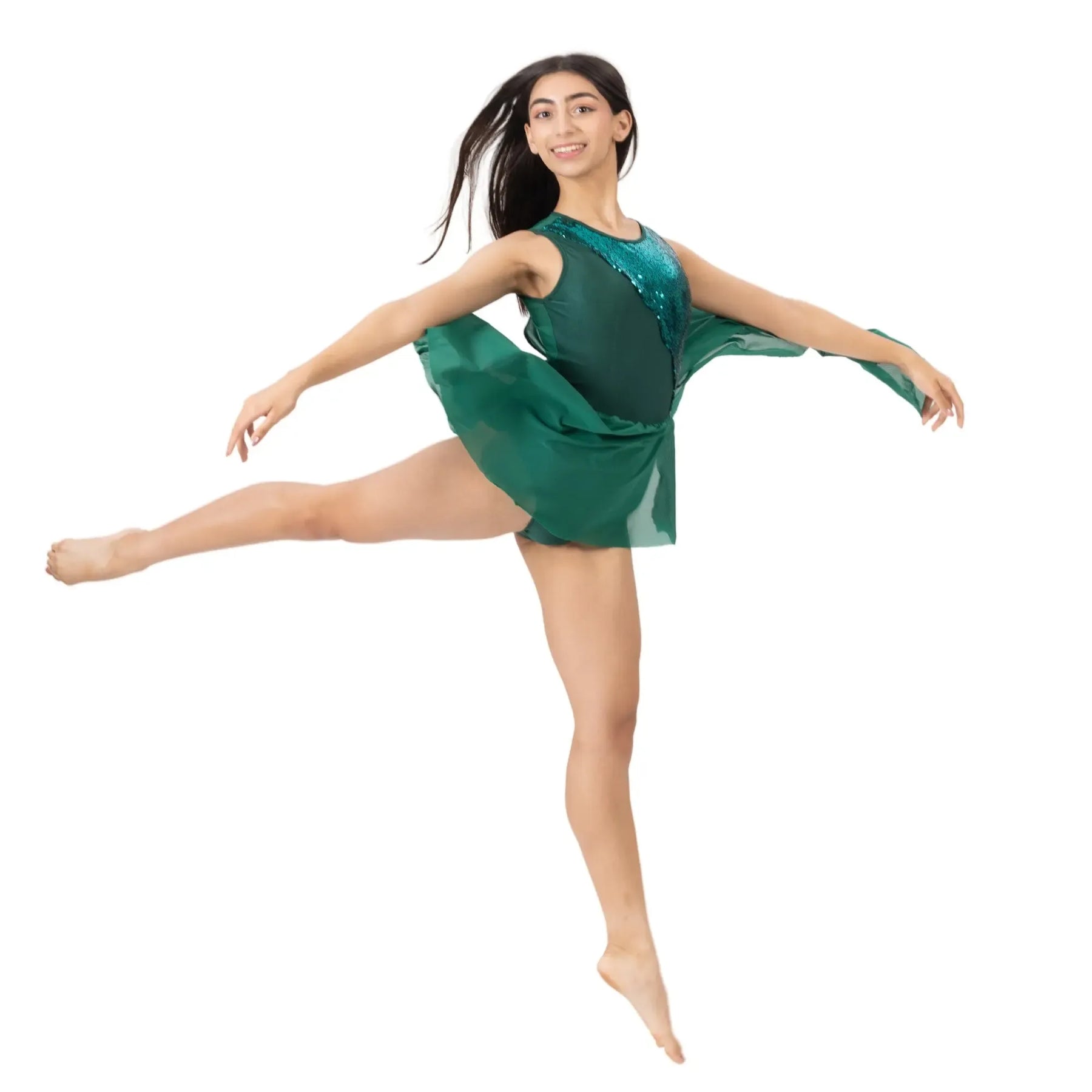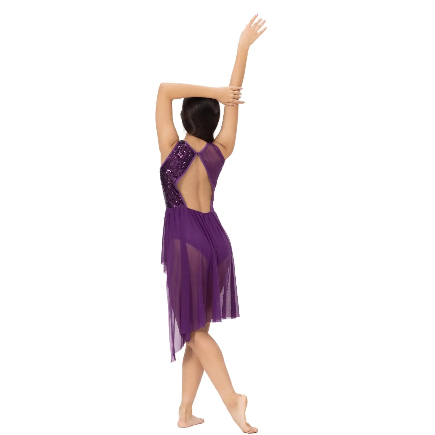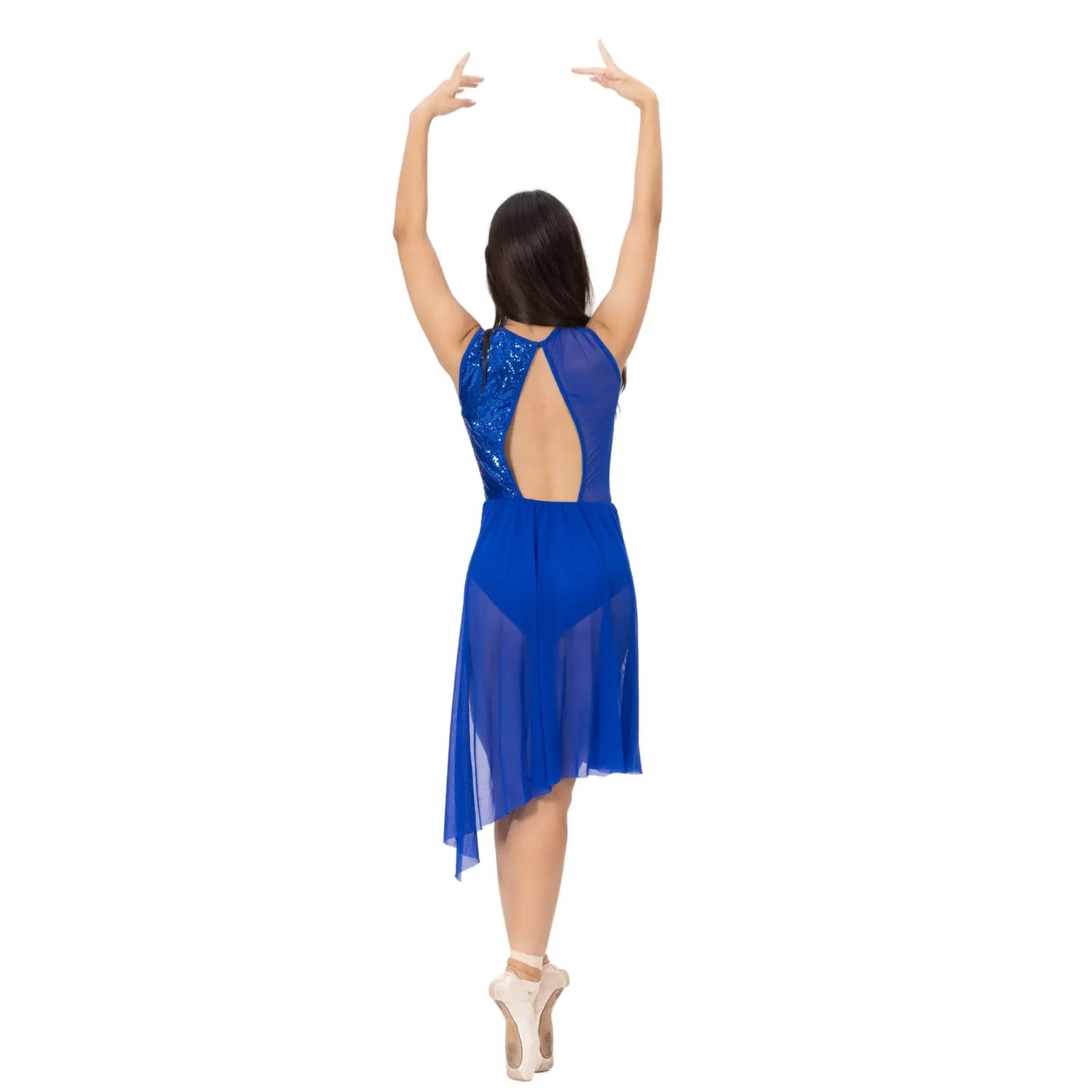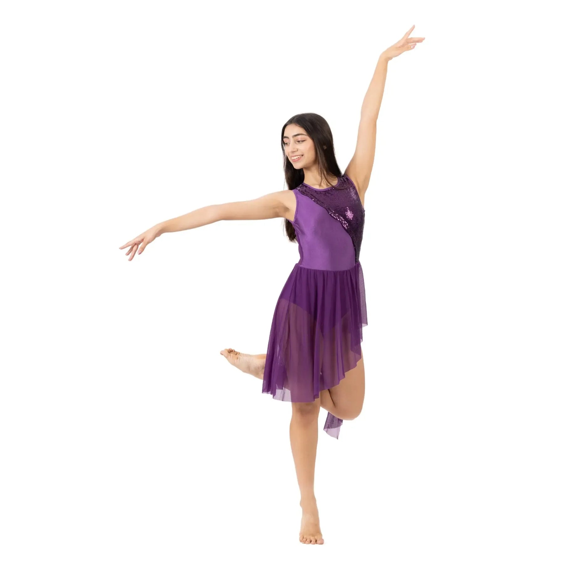 A sequin-bodice dress with a lightweight, side-slit skirt and nylon-spandex stretch, designed for fluid, elegant performance.