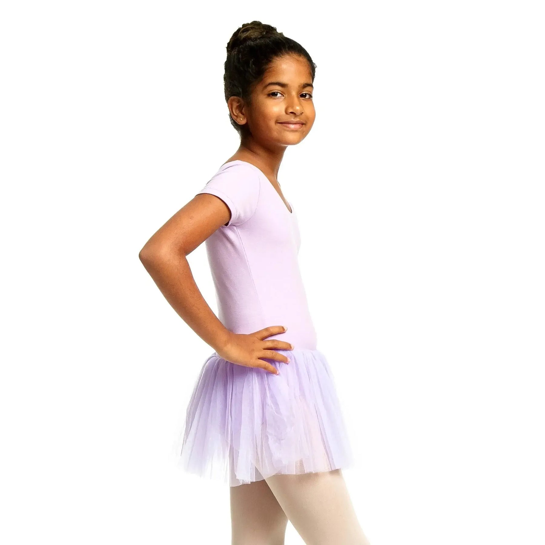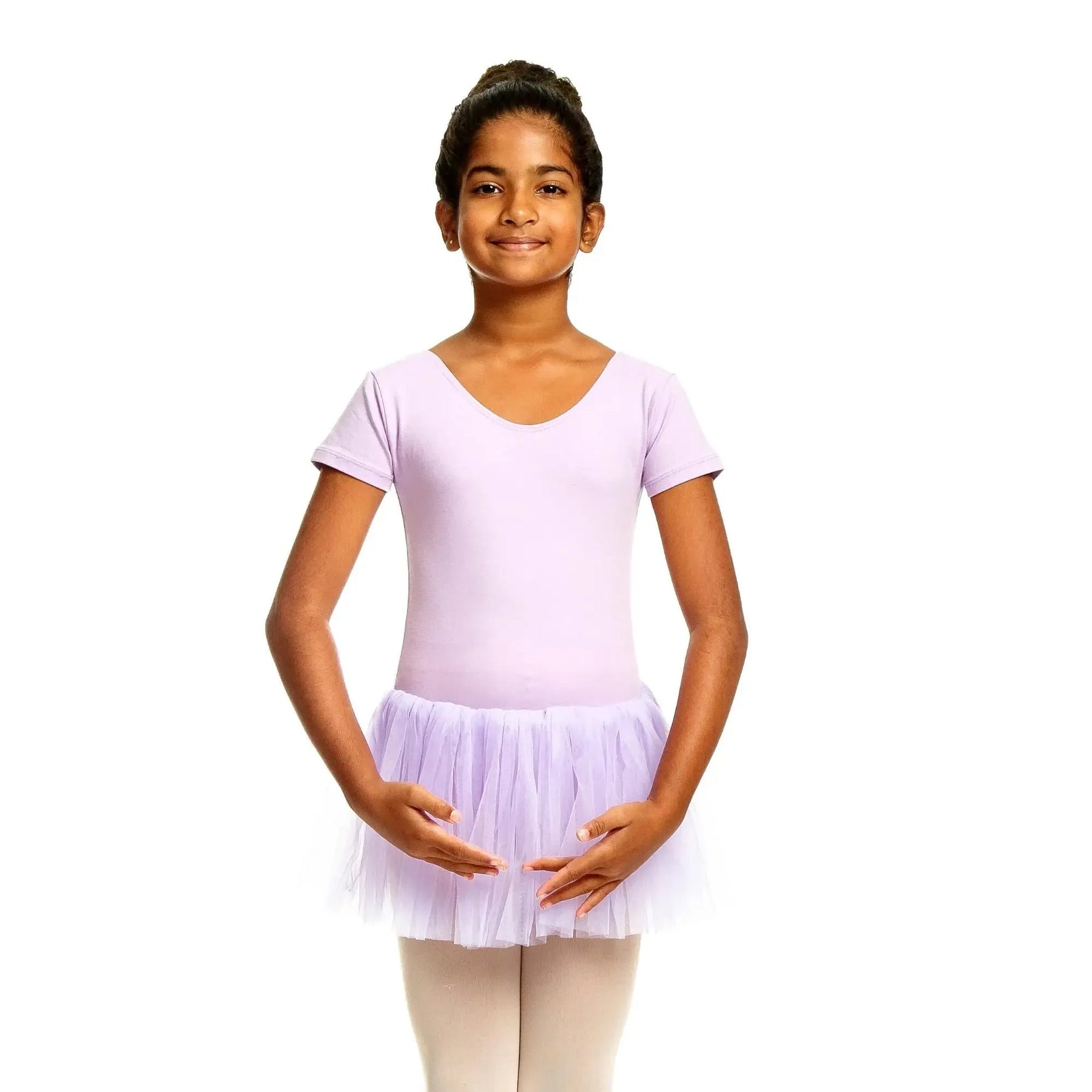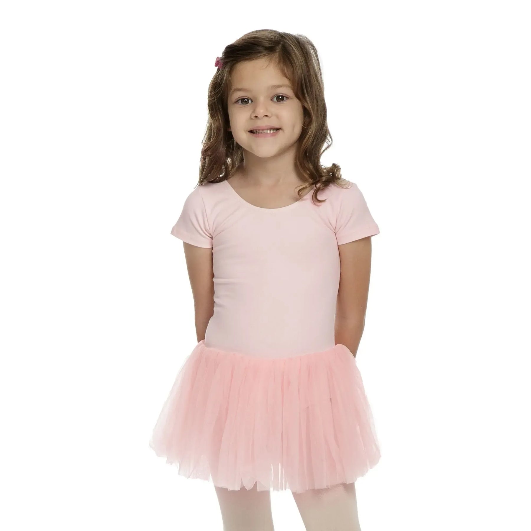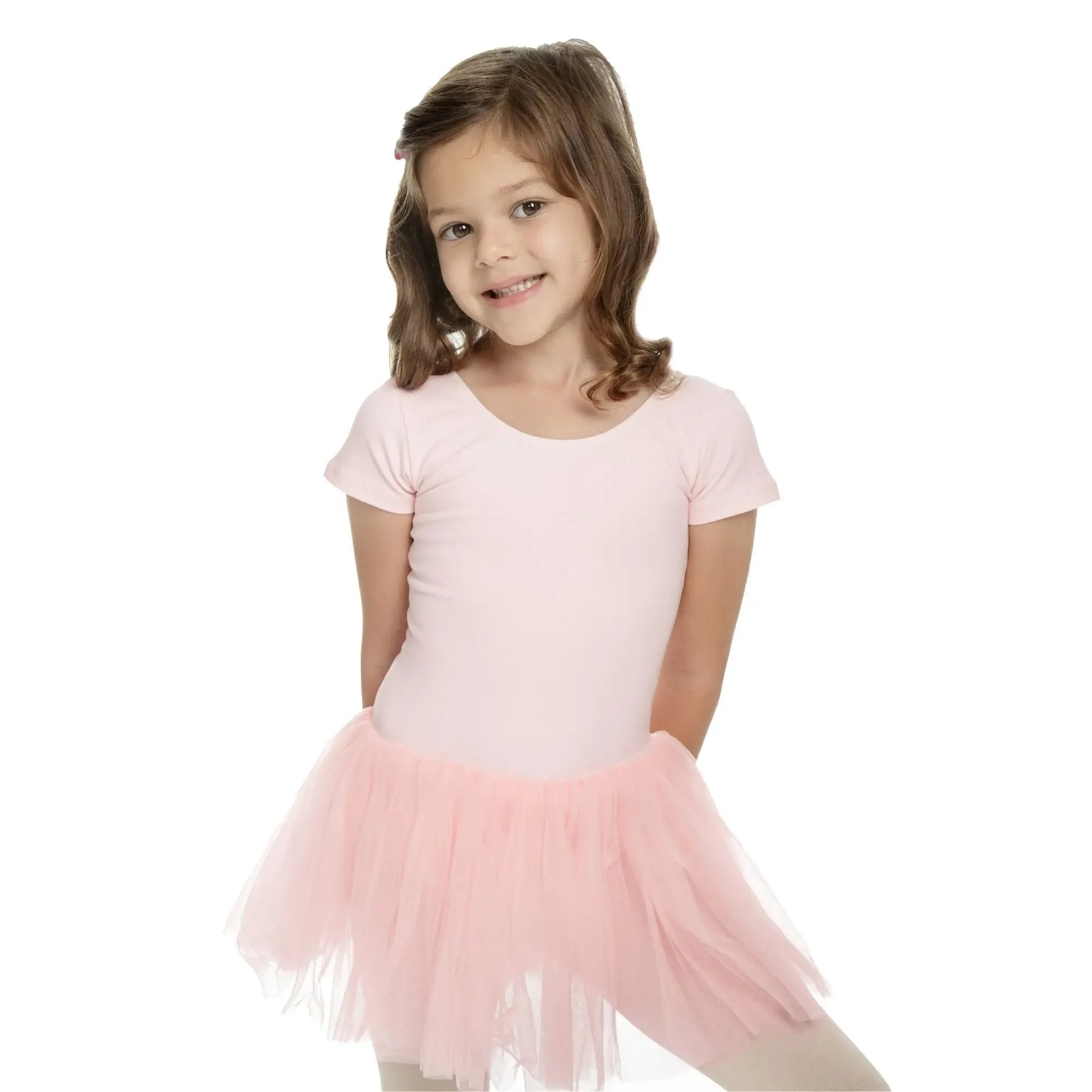 A cotton-spandex ballerina dress with a four-layer soft mesh tutu and designer mesh back, offering voluminous elegance and breathable comfort.