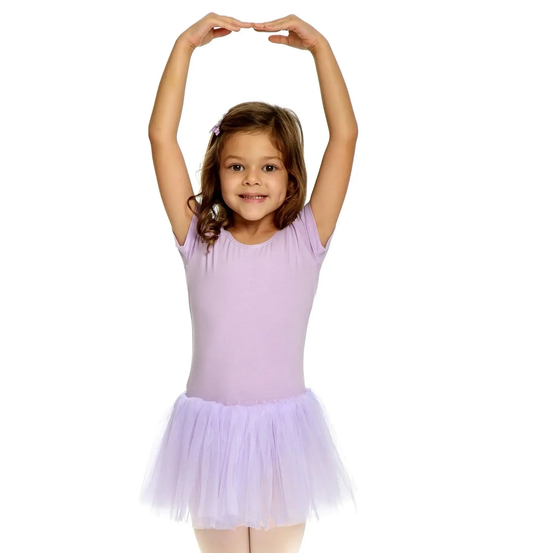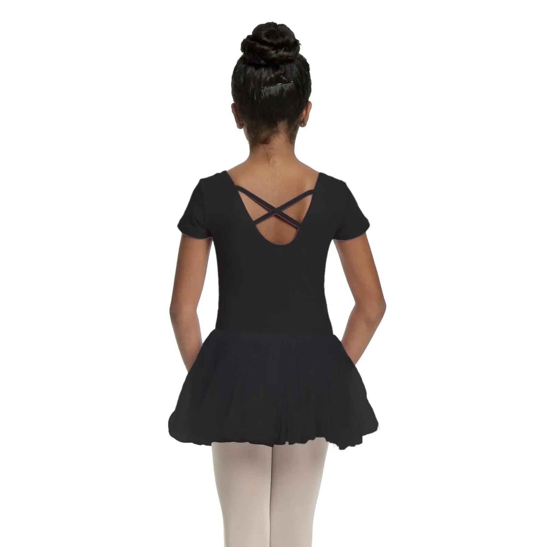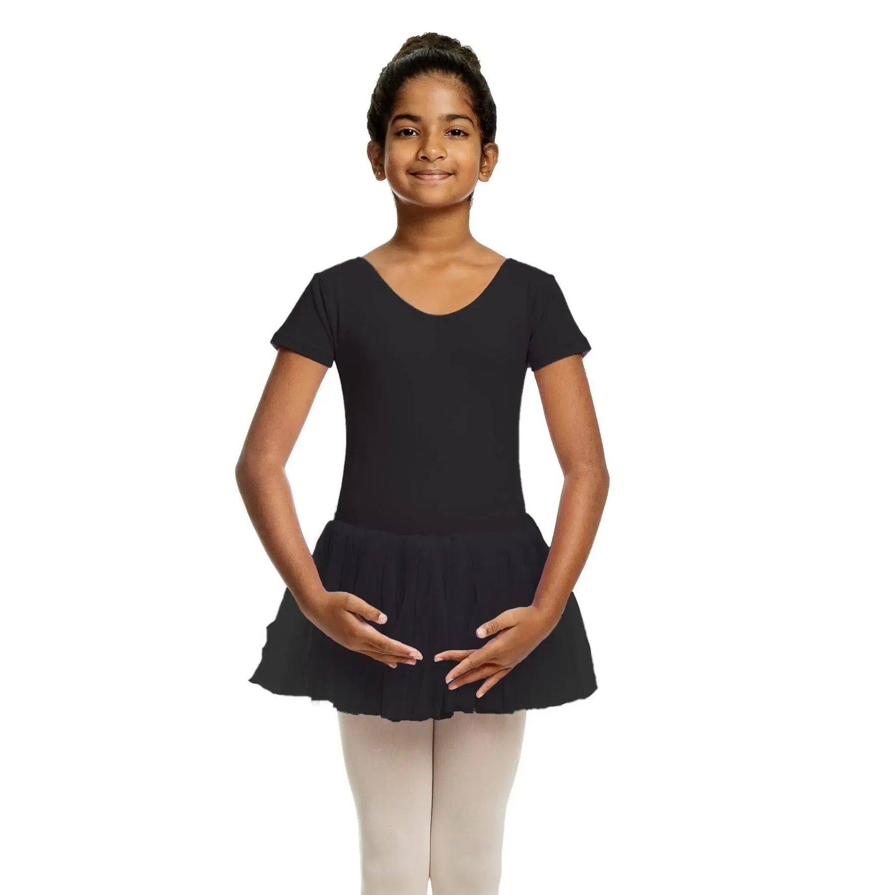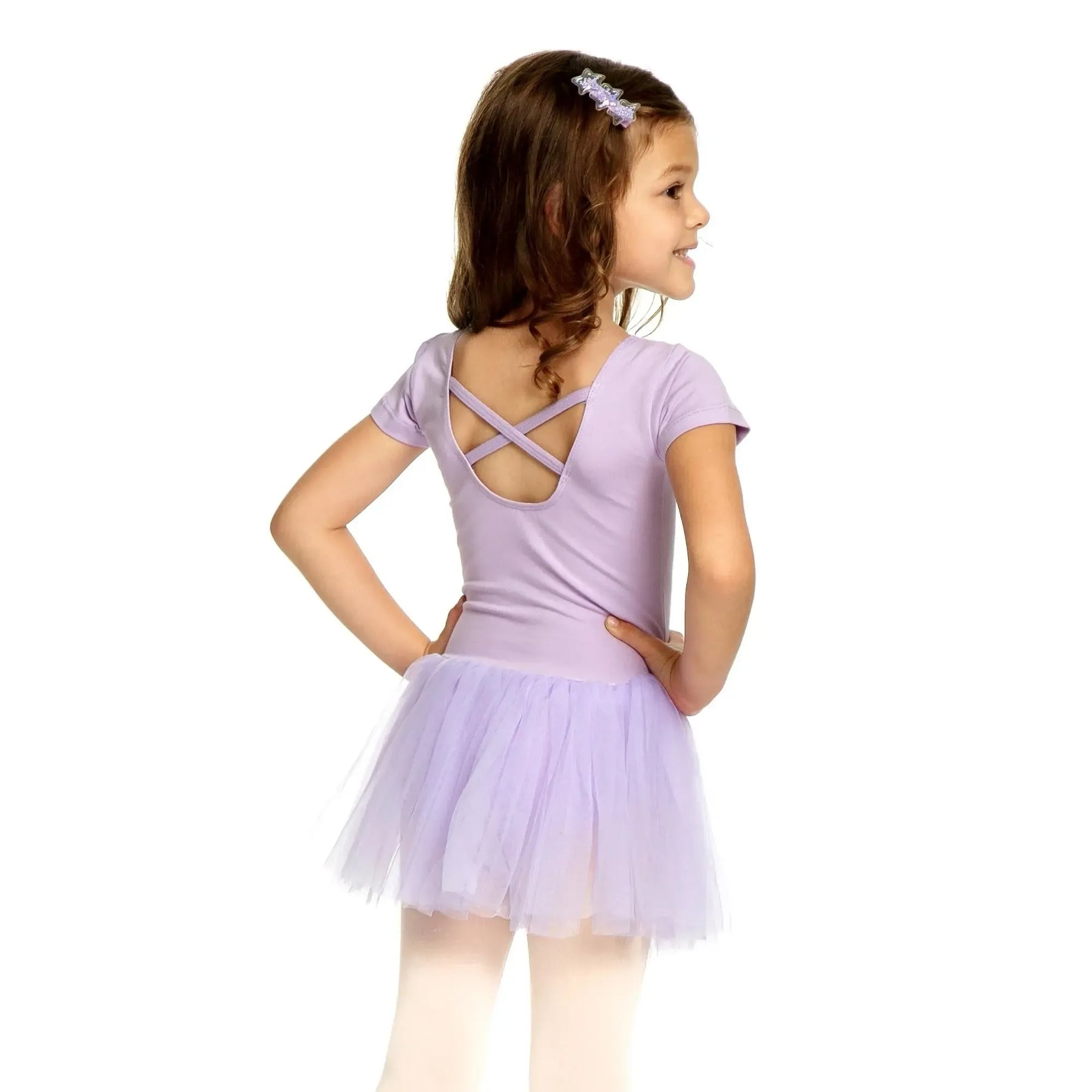 A cotton-spandex ballerina dress with a four-layer soft mesh tutu and designer mesh back, offering voluminous elegance and breathable comfort.