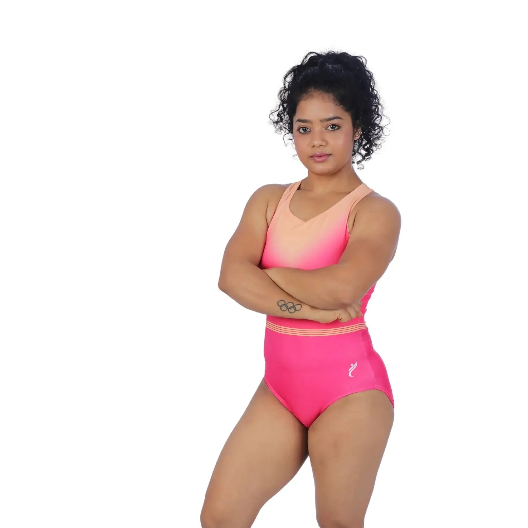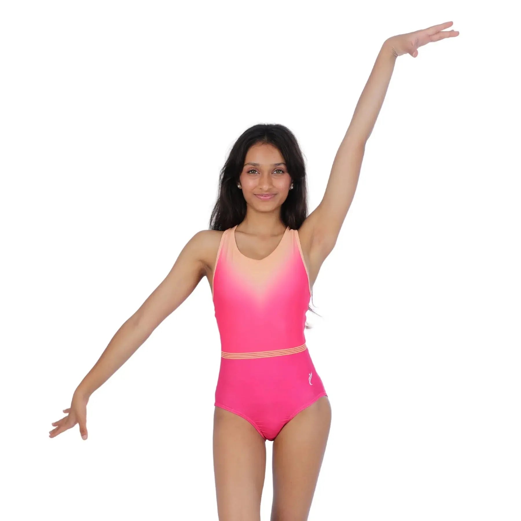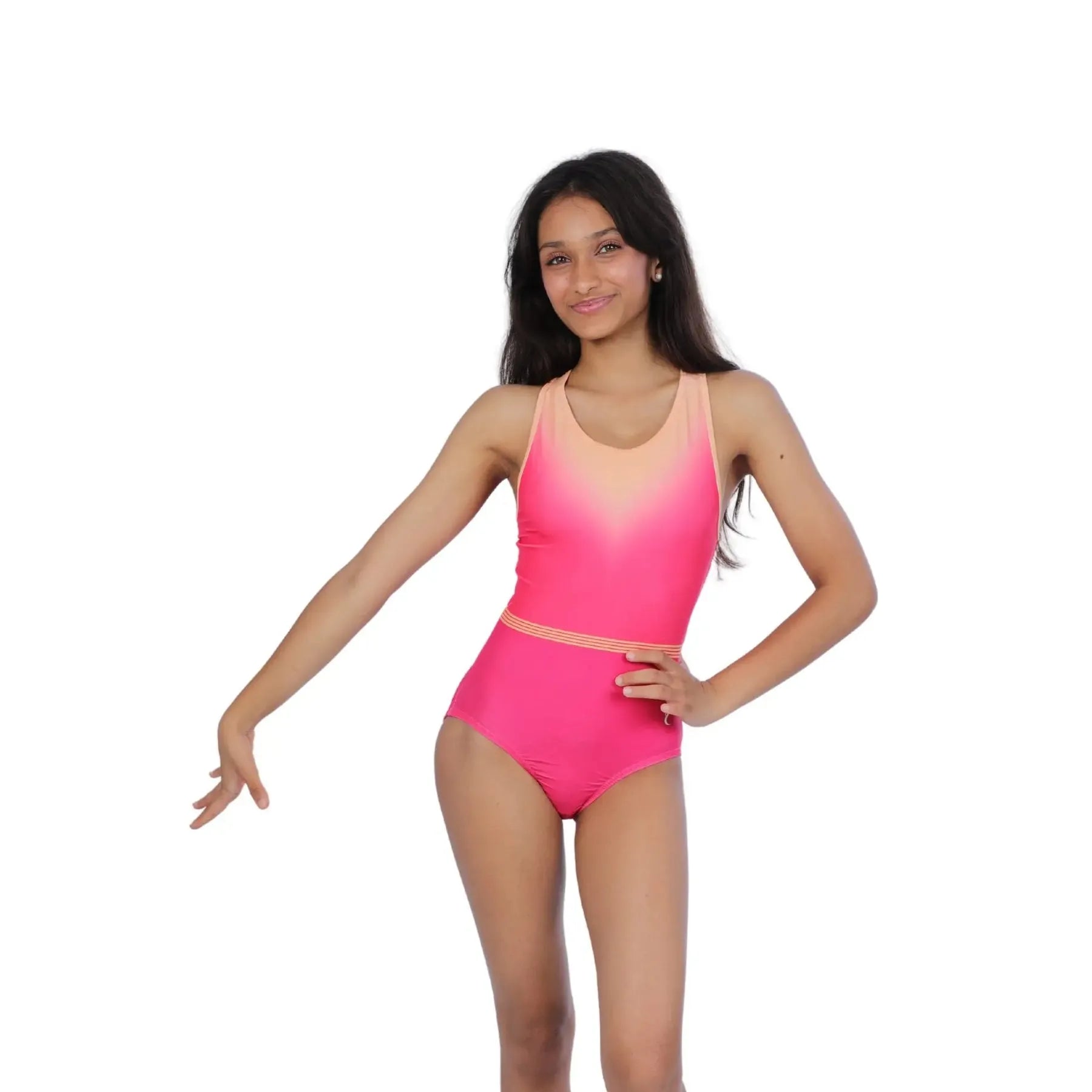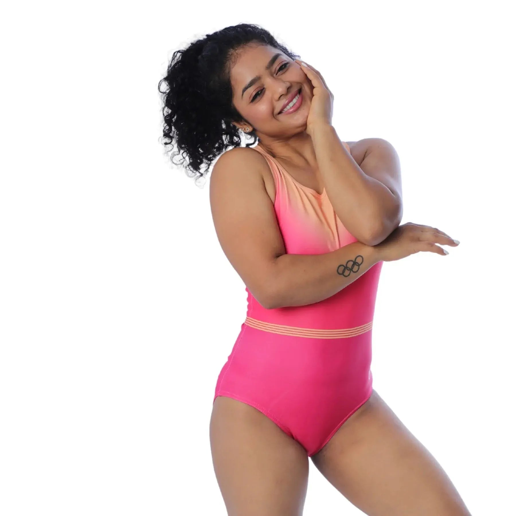 Elegantly engineered in soft 4-way stretch nylon-spandex, tank silhouette with sunset ombre print, performance-ready look with comfort and style.